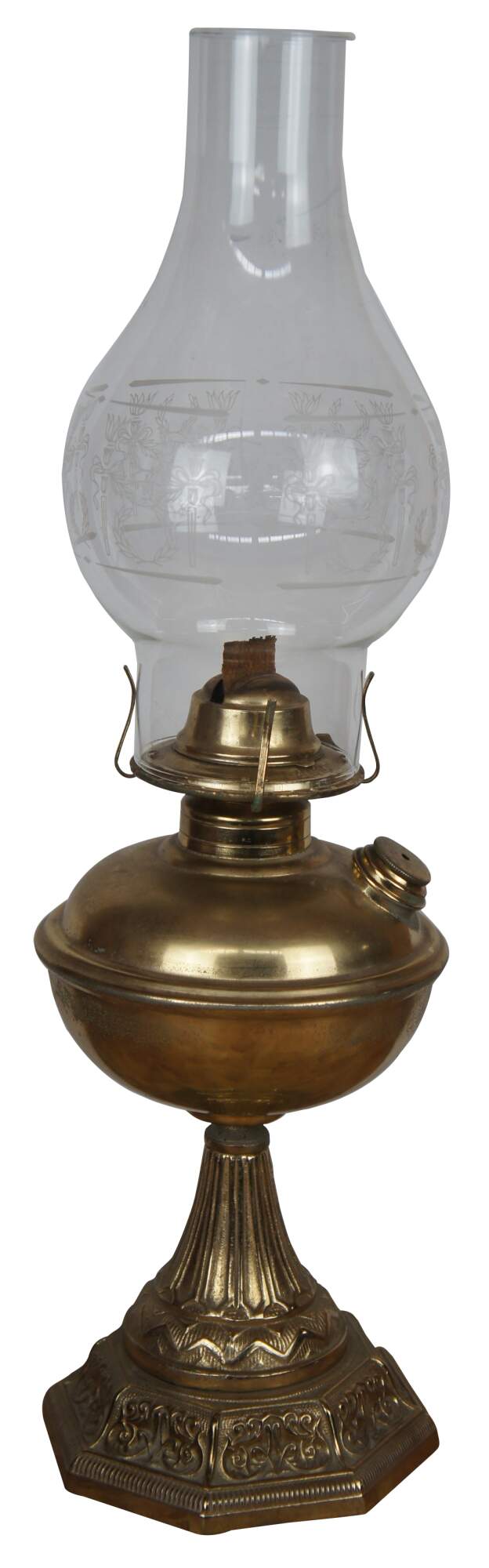Oil/Kerosene/Paraffin lamp featuring shiny brass finish, fluted column and clear etched neoclassical style hurricane.
