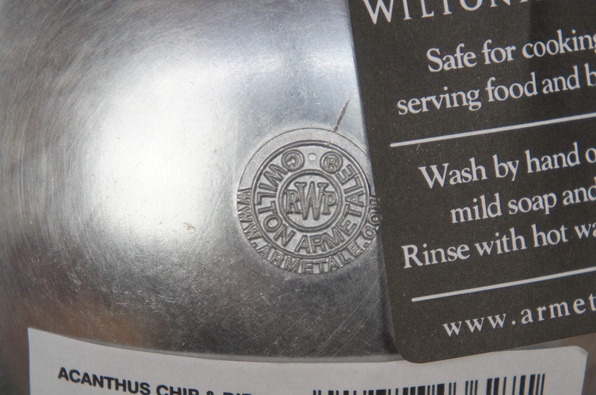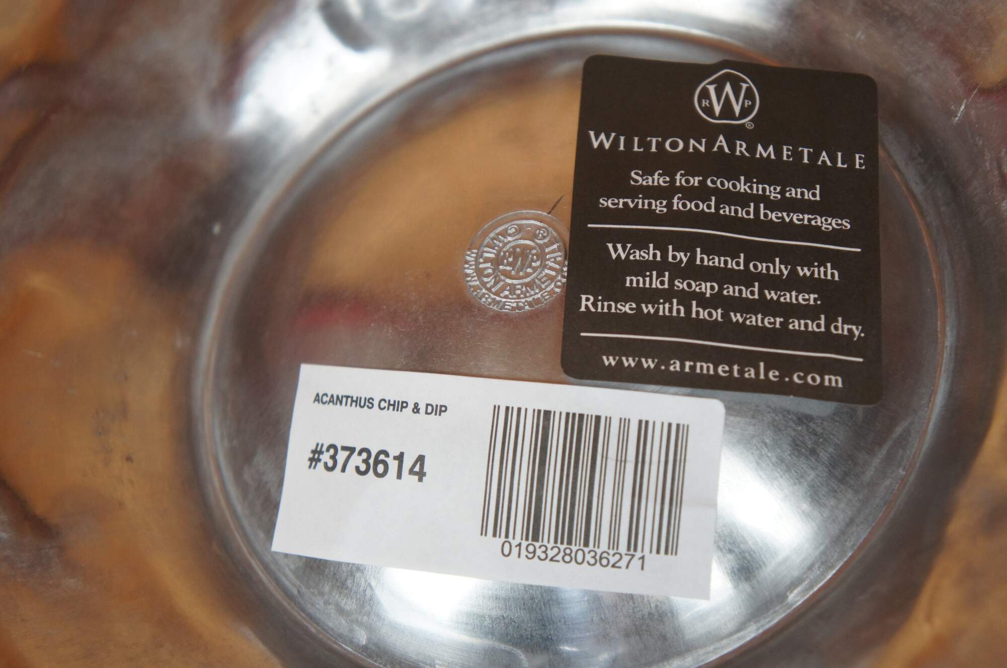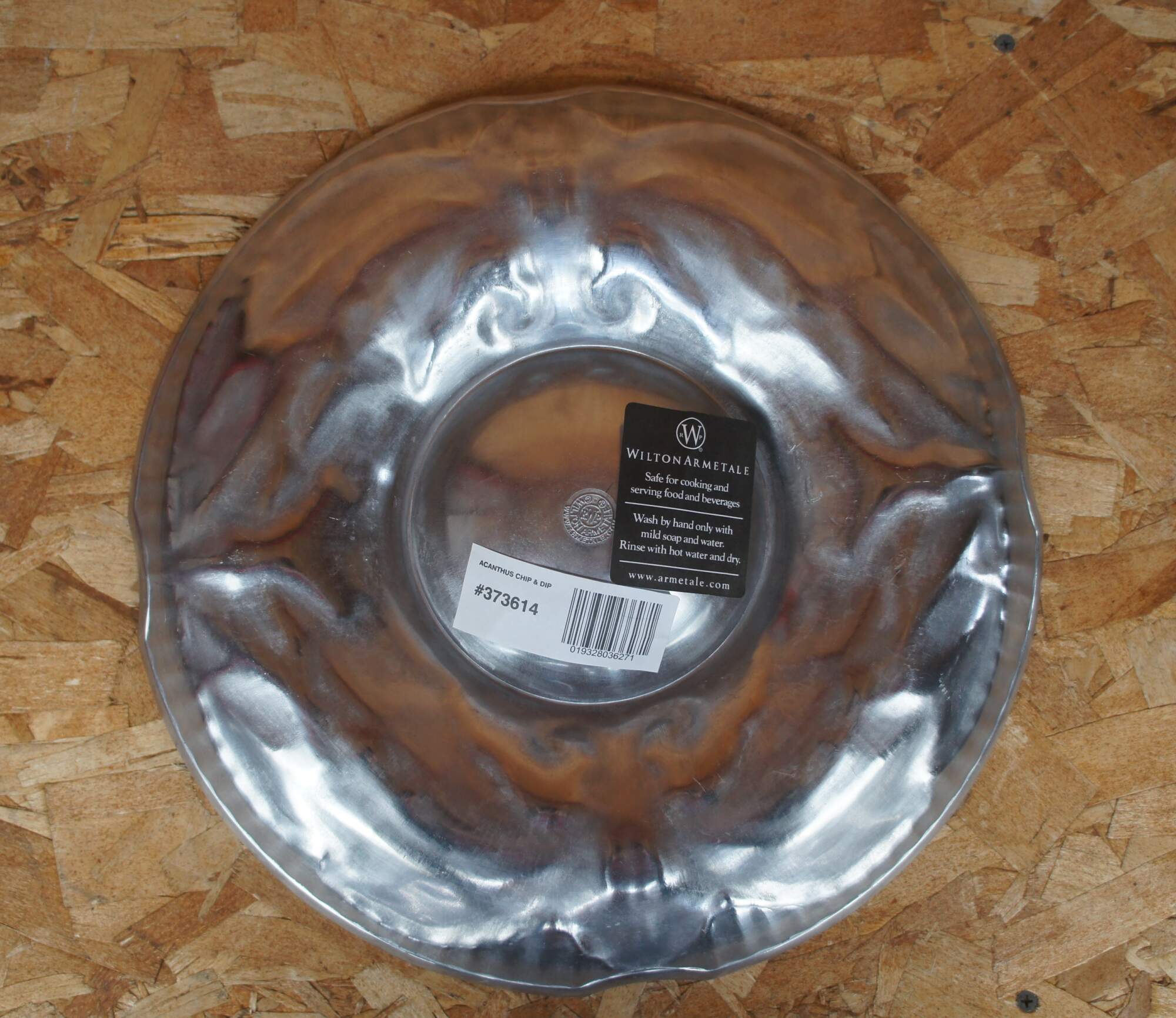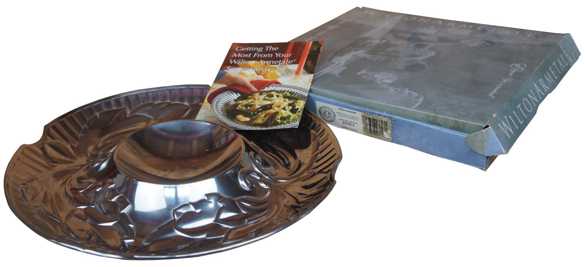 Wilton Armetale chip and dip tray appears to have never been used and comes in its original box. Tray features polished pewter with Acanthus leaf motif.