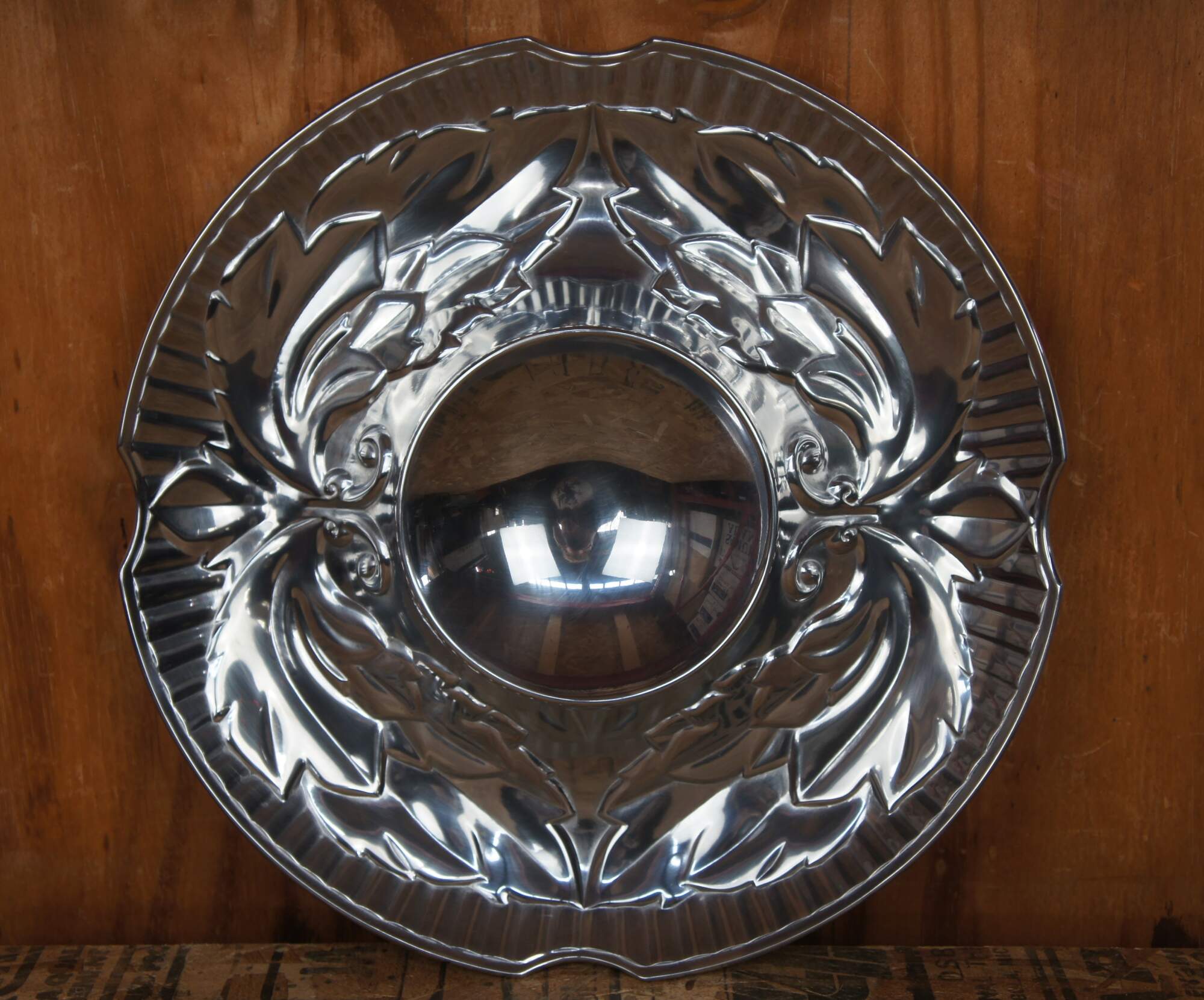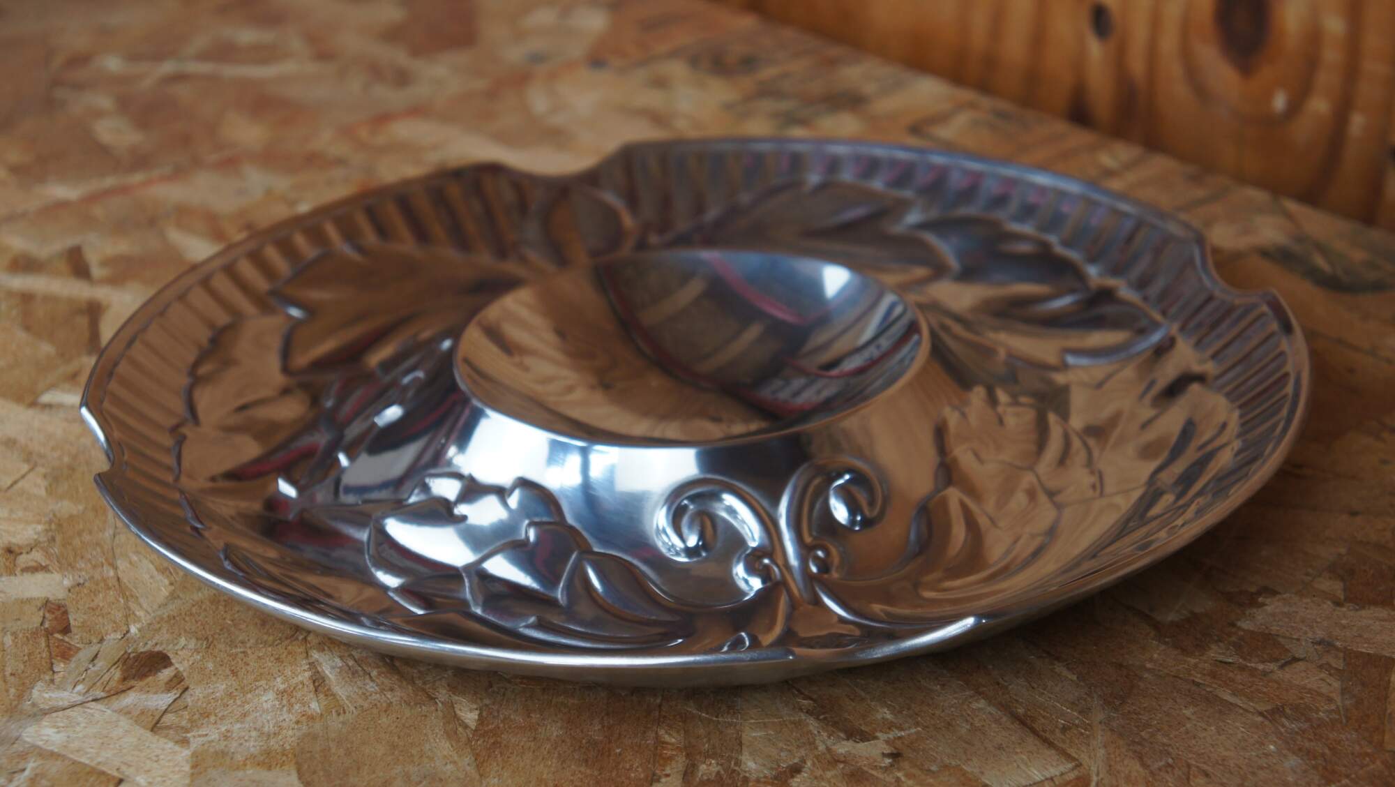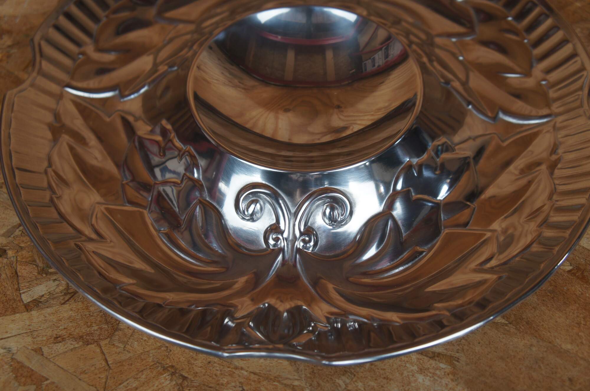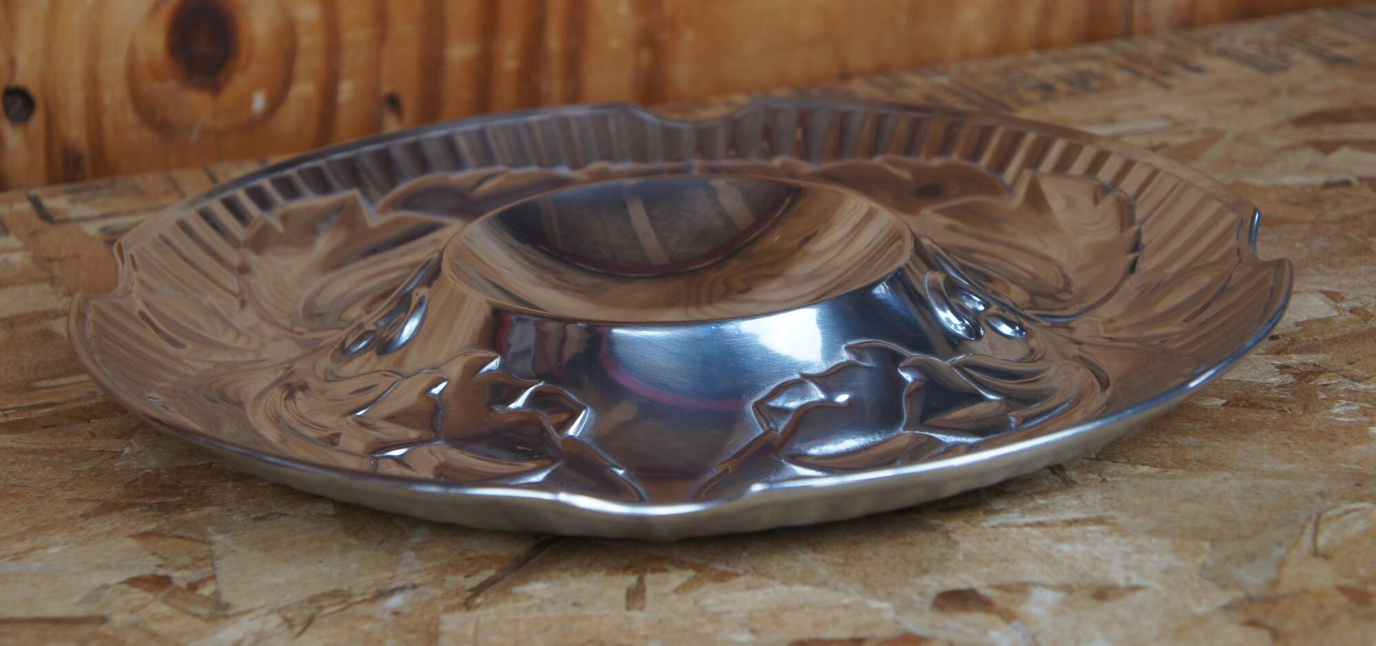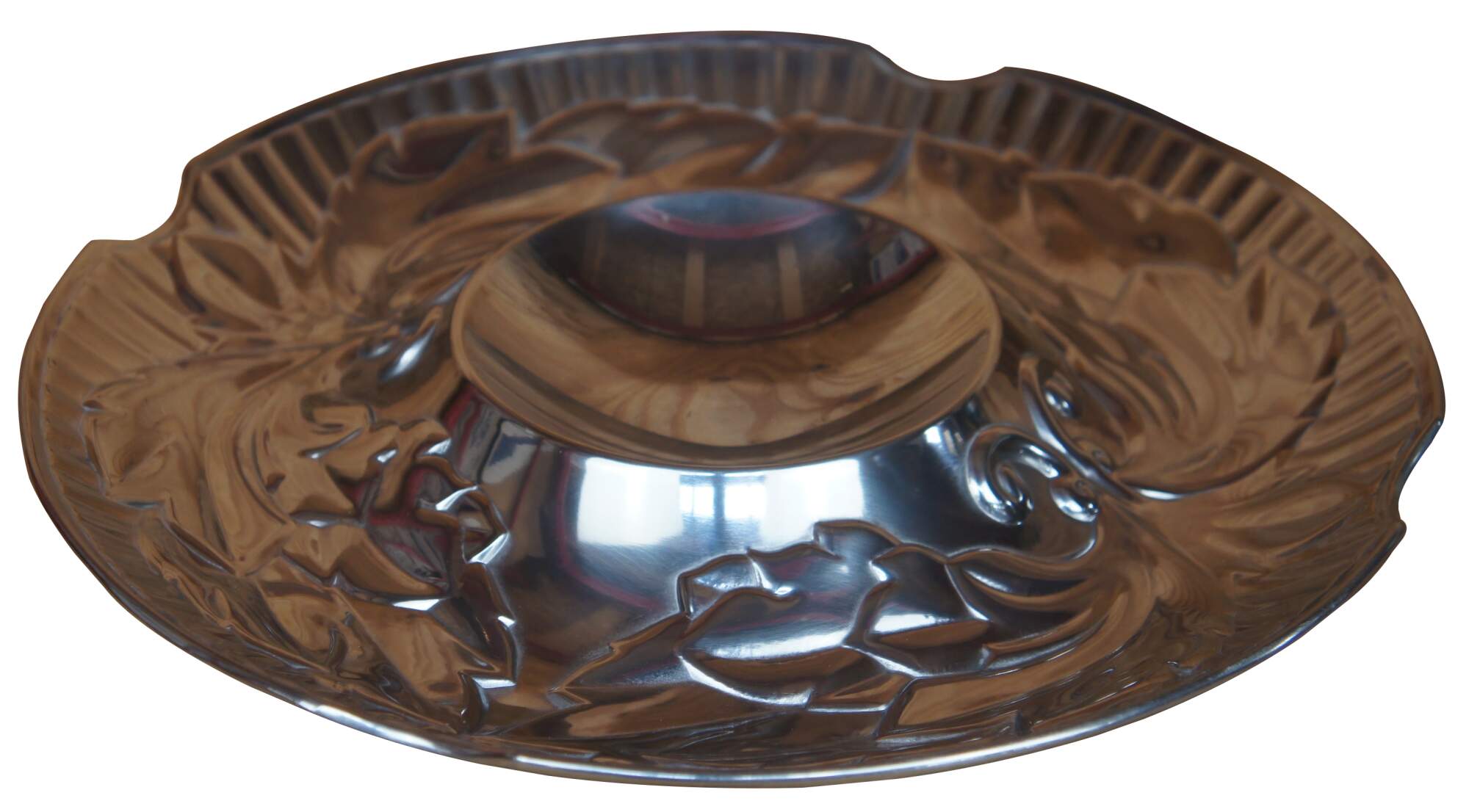 Wilton Armetale chip and dip tray appears to have never been used and comes in its original box. Tray features polished pewter with Acanthus leaf motif.