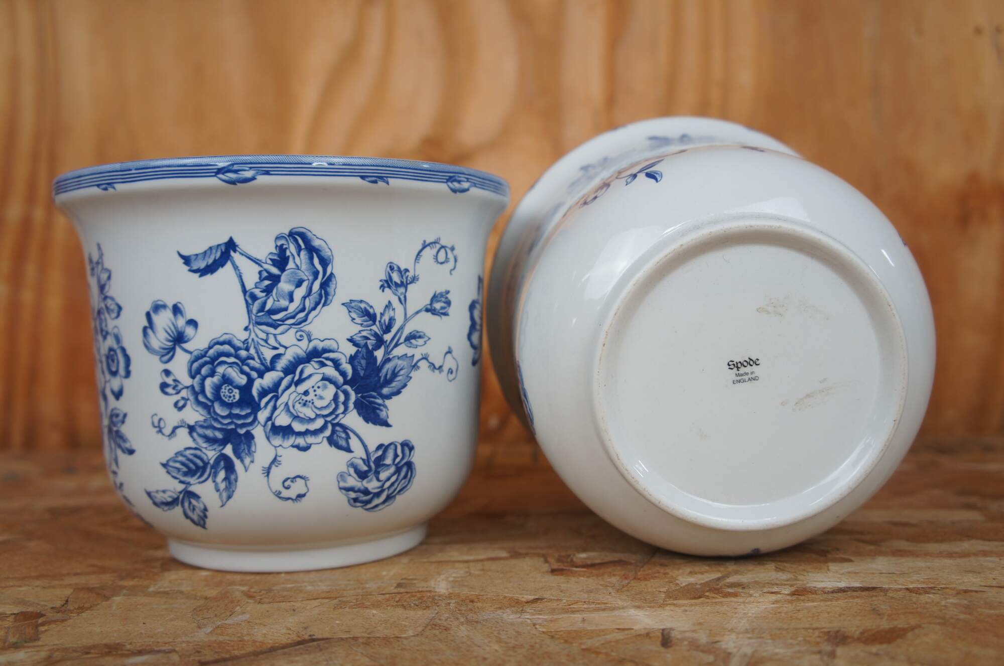2 Spode England Porcelain Cache Pot Planters. Blue and white with floral and foliate pattern.