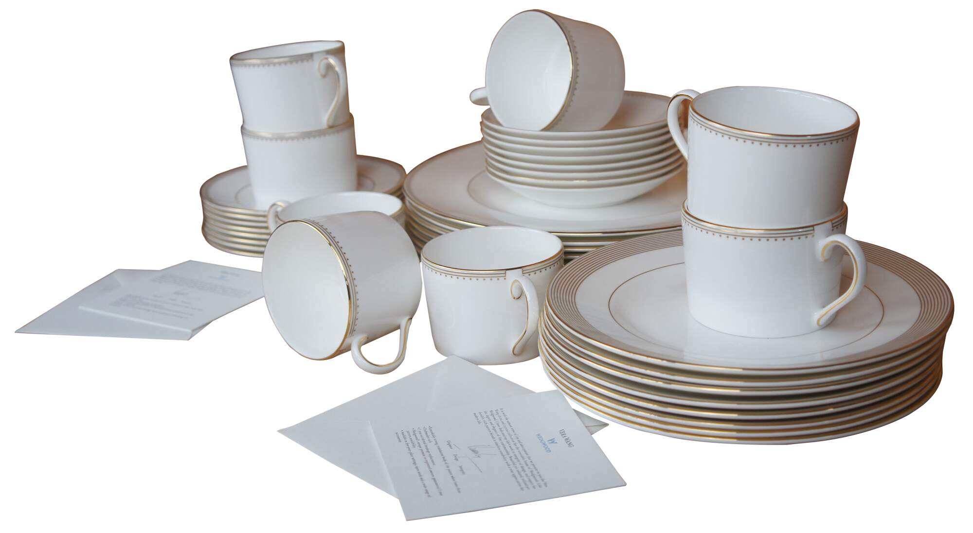Beautiful like new 40 piece china set, ‘Golden Grosgrain’ pattern by Vera Wang from Wedgwood China. Set includes place setting for 8, tea/coffee cups, saucers, bread plates, salad plates and dinner plates.