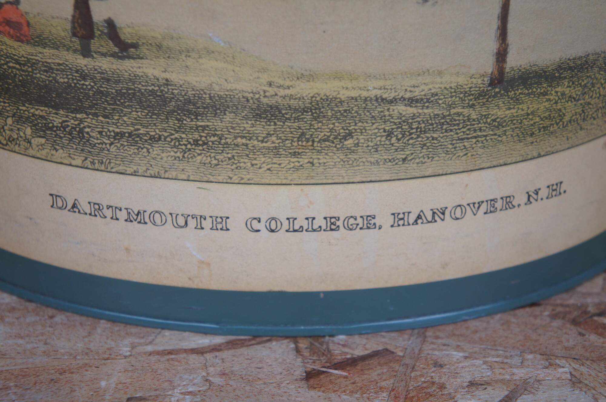 This waste can appears to be handmade and features a poster of Dartmouth College mâchéd to it. Made by Keller Charles of Philadelphia