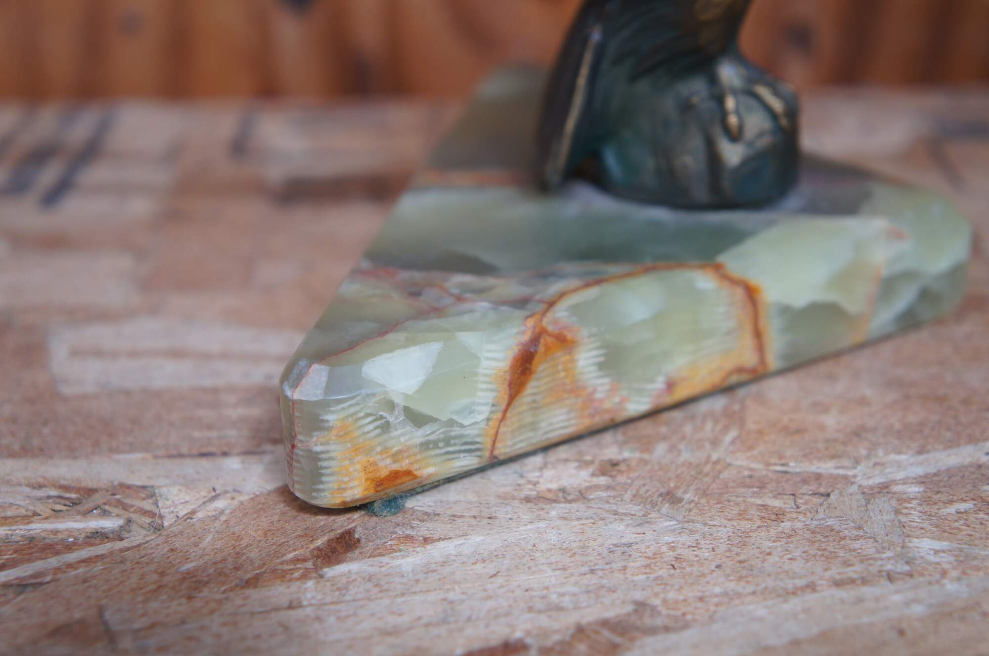 Pair of vintage brass eagle paperweights or bookends mounted on green stone triangular bases.