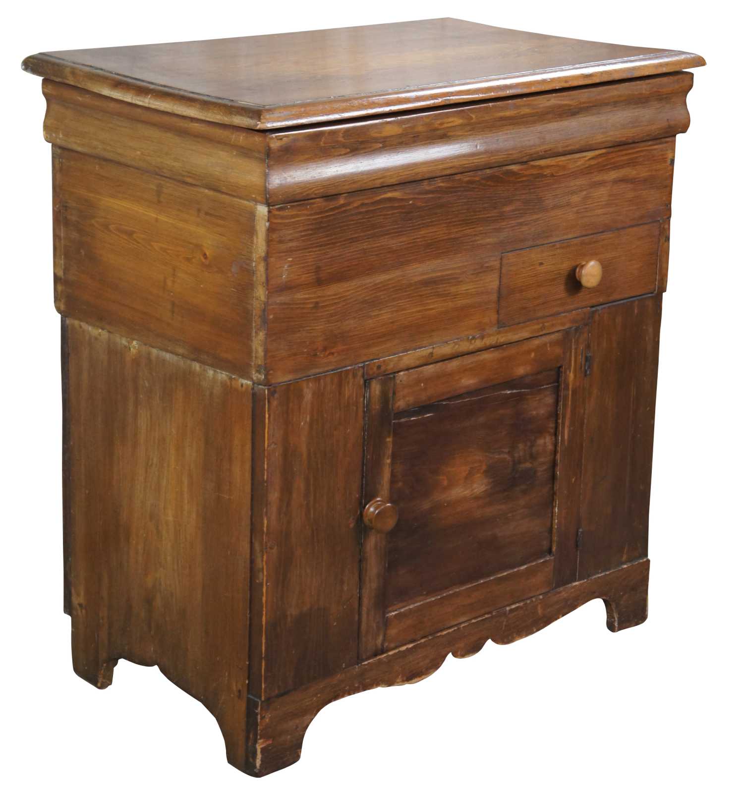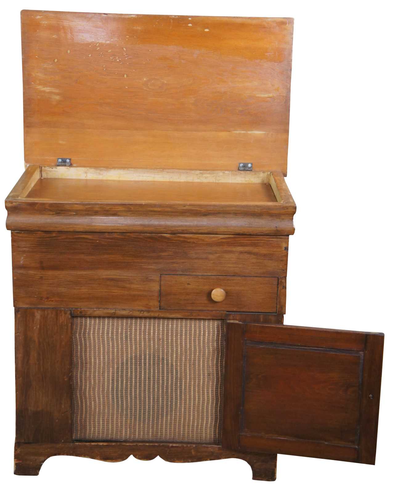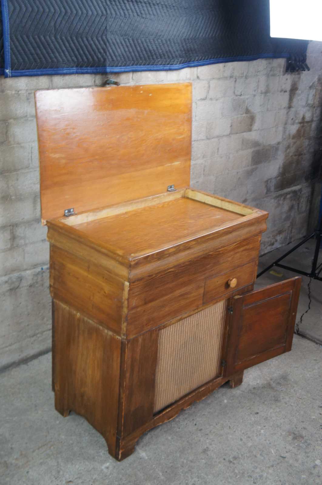 Converted antique dough chest. Made from pine with upper lid and lower cabinet with covered speaker. Rca connectors along the lower side of the bag.