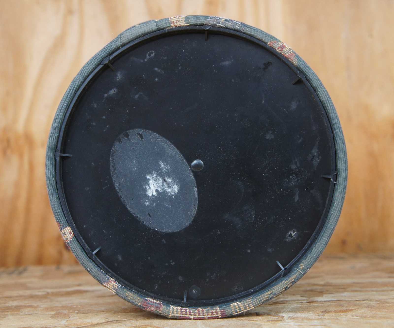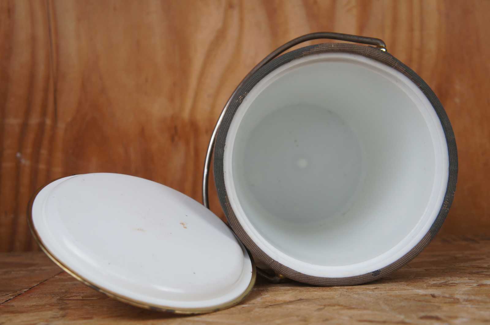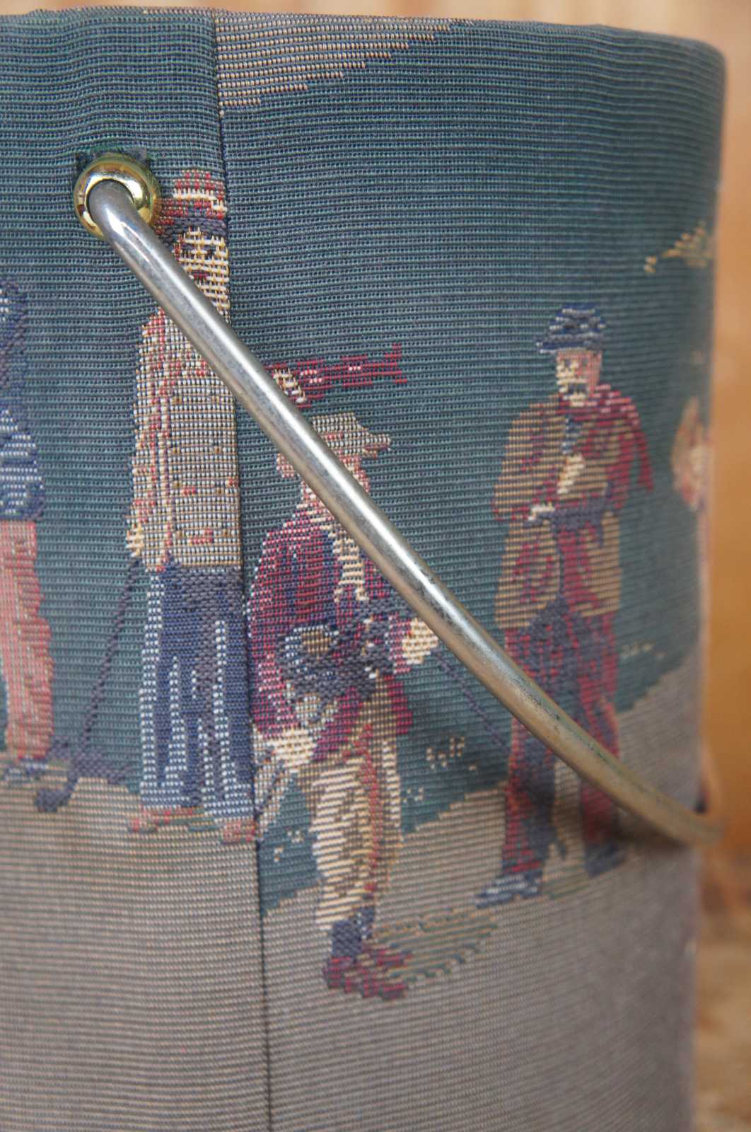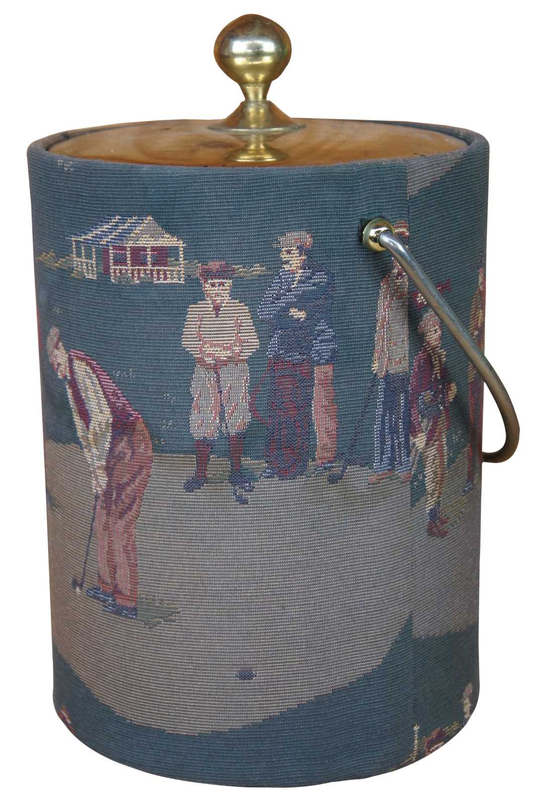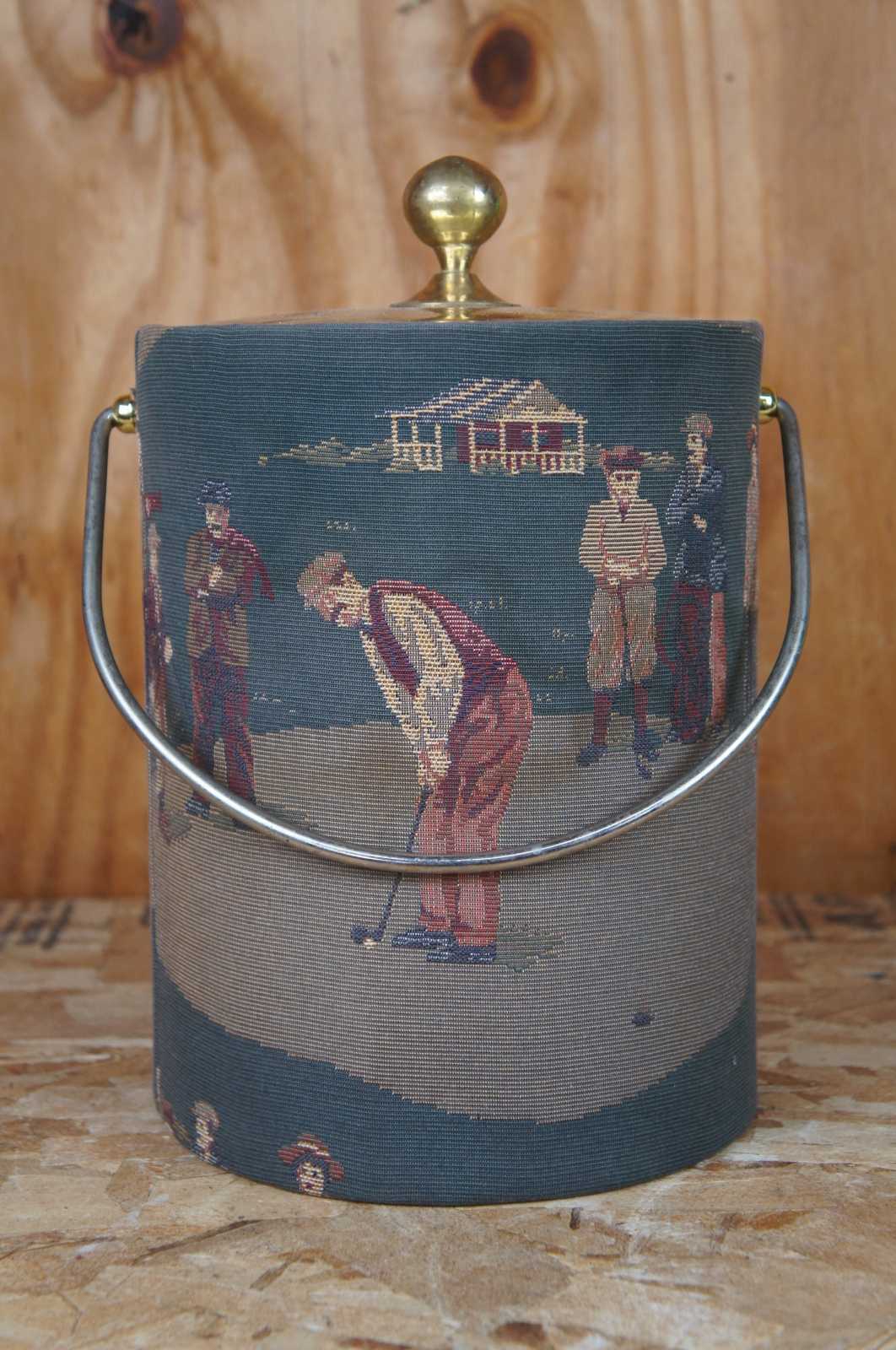 Vintage Kraftware Elegance ice bucket covered in needlepoint tapestry depicting a golfing scene.