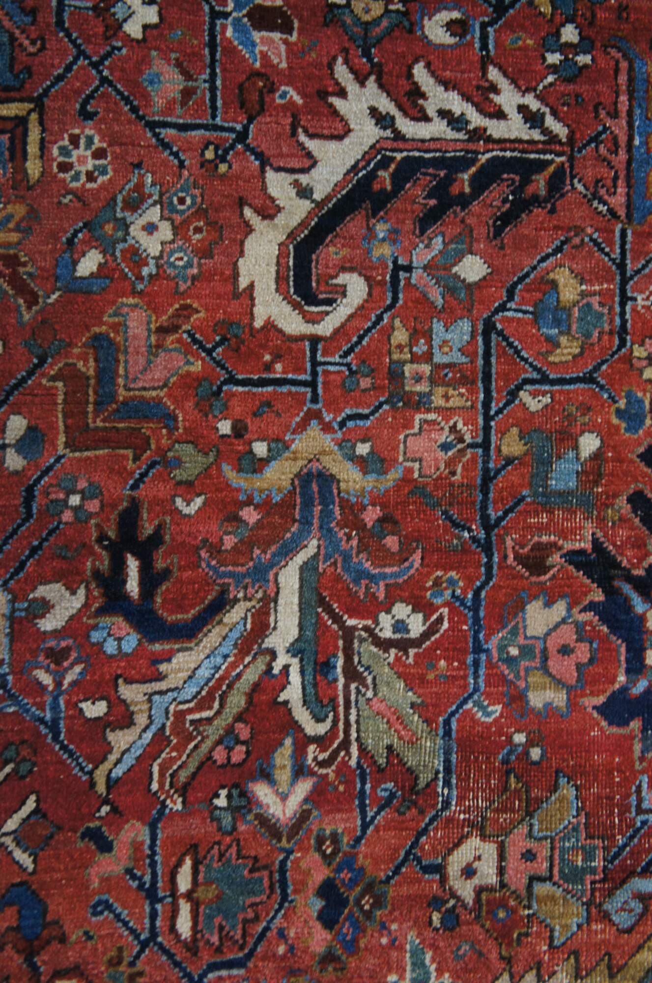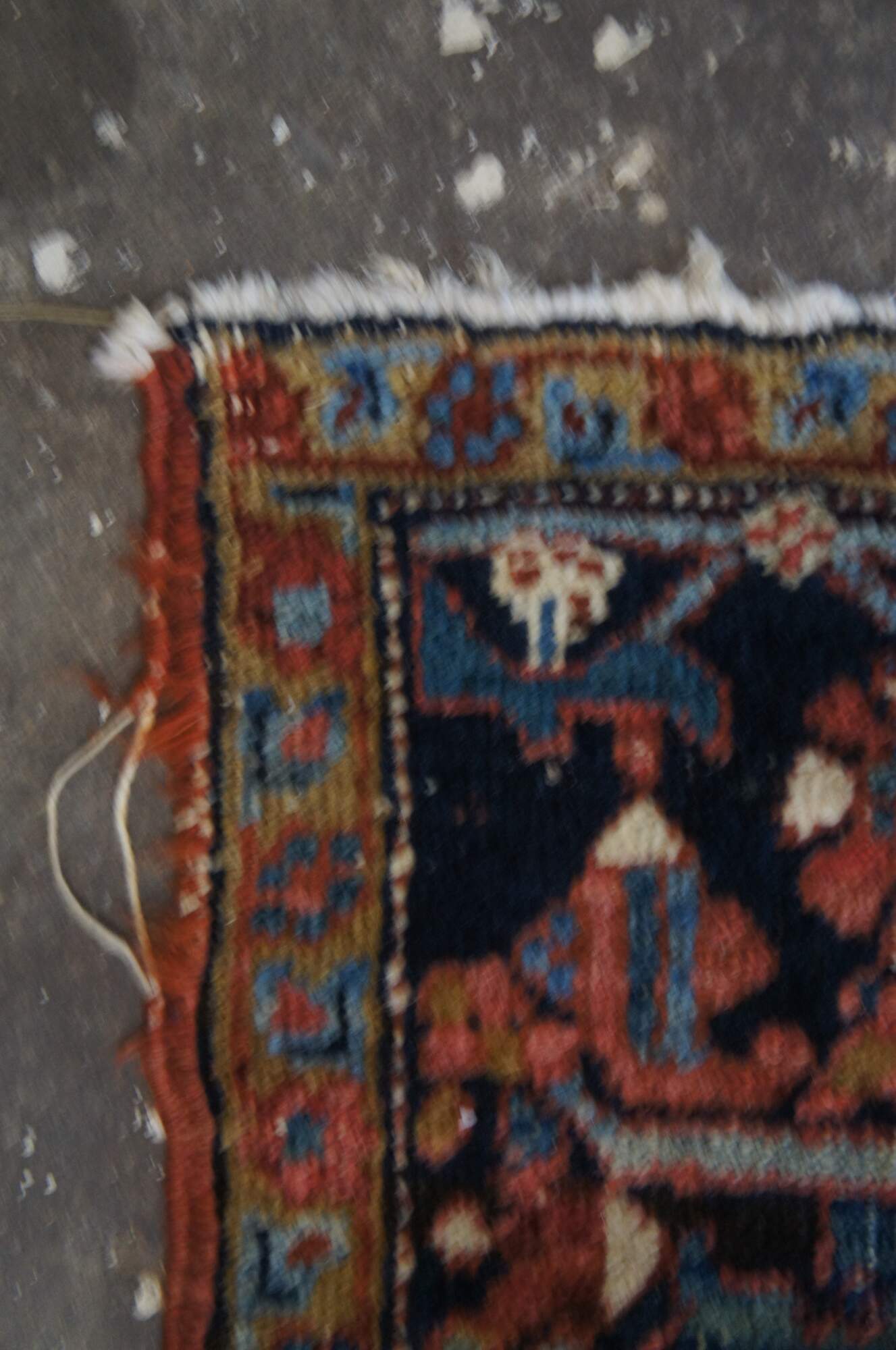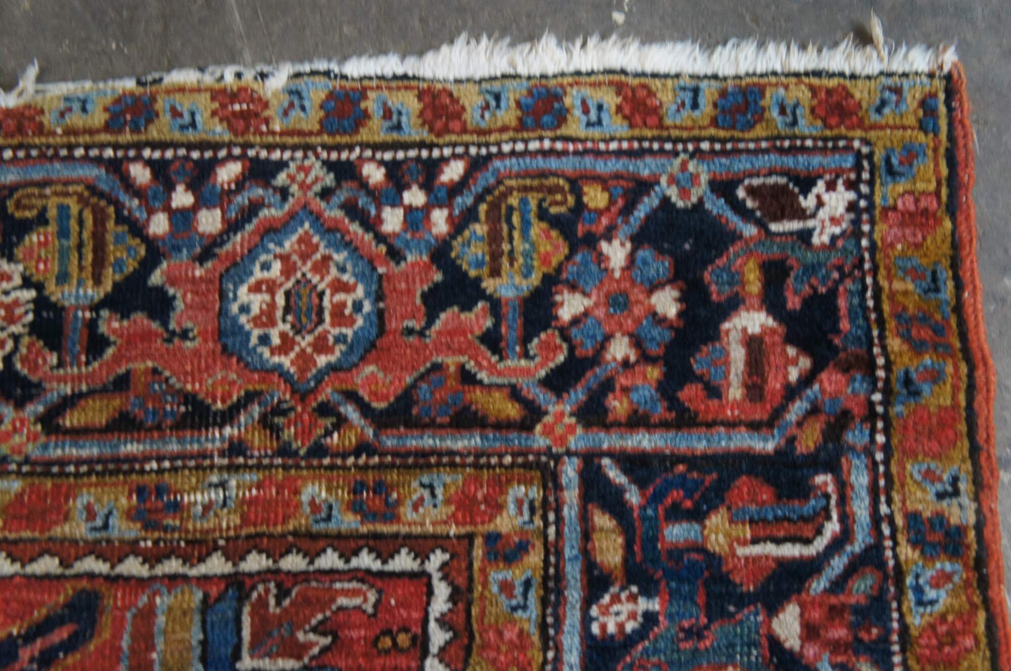 An impressive oriental hand knotted wool area rug. Features a geometric pattern with a floral all over pattern over a red field and blue border. Includes green and beige colors. 81-100 kpsi