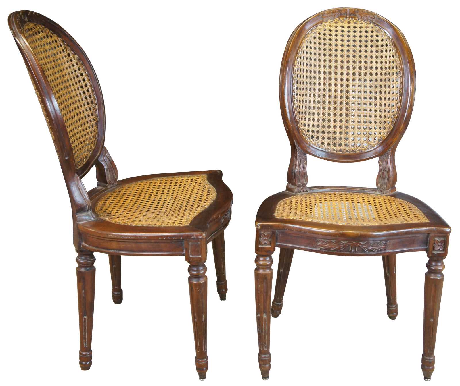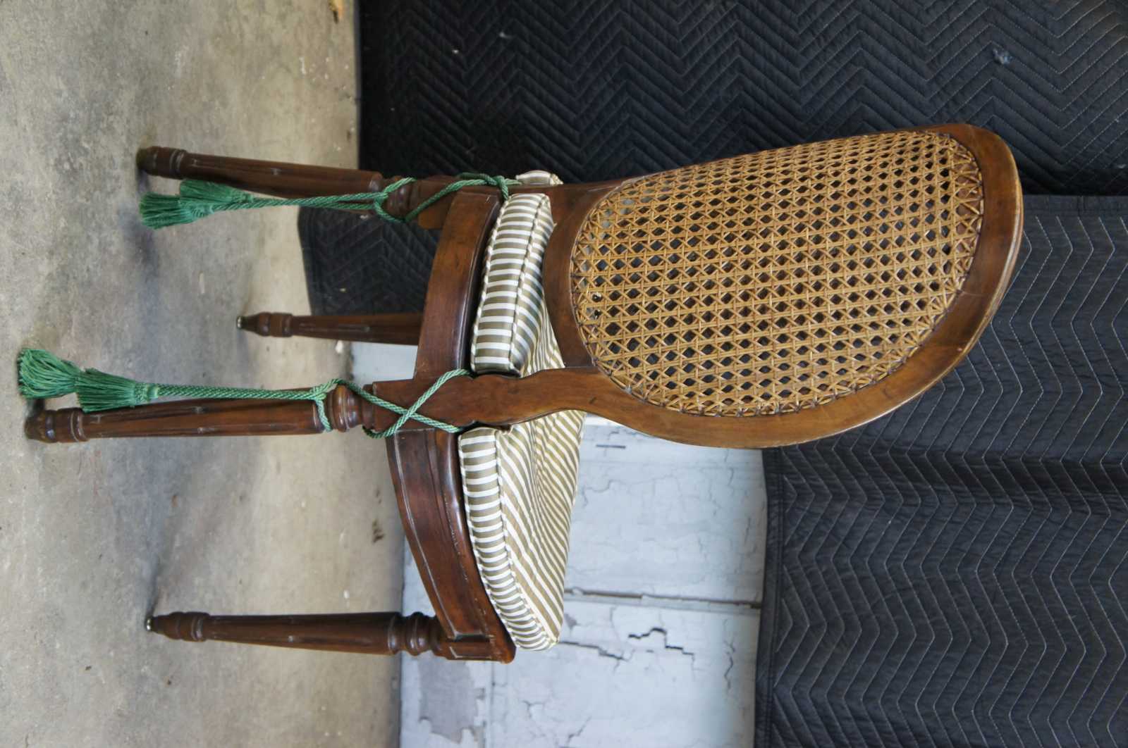 Pair of two antique double caned dining or side chairs. Made of walnut featuring oval form back with carved floral and acanthus accents and fluted tapered legs. Includes striped upholstered down filled cushions with tassels. Made in Italy.