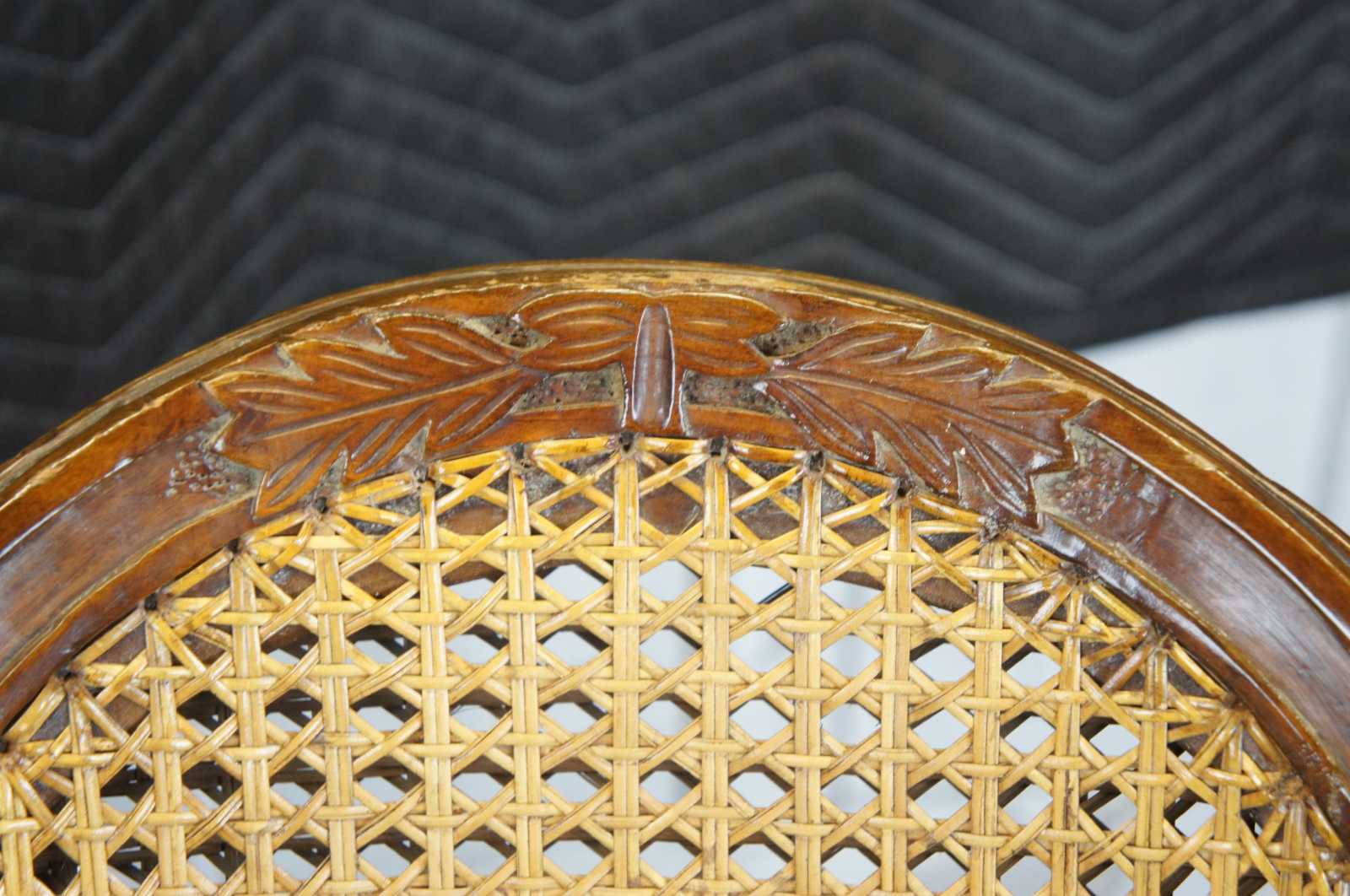 Good antique condition, wear and distressing commensurate with age and use, warping to cane, staining to cushions.