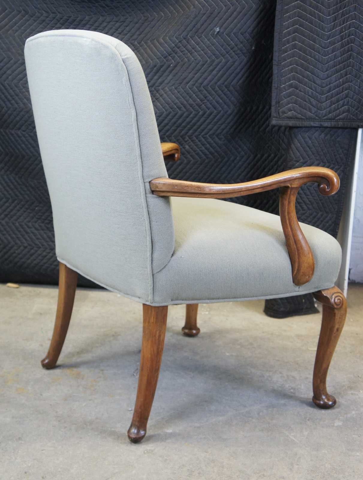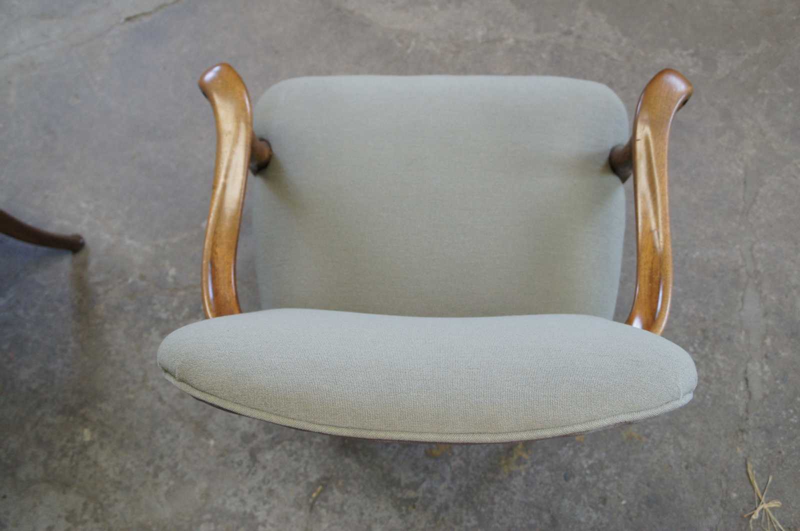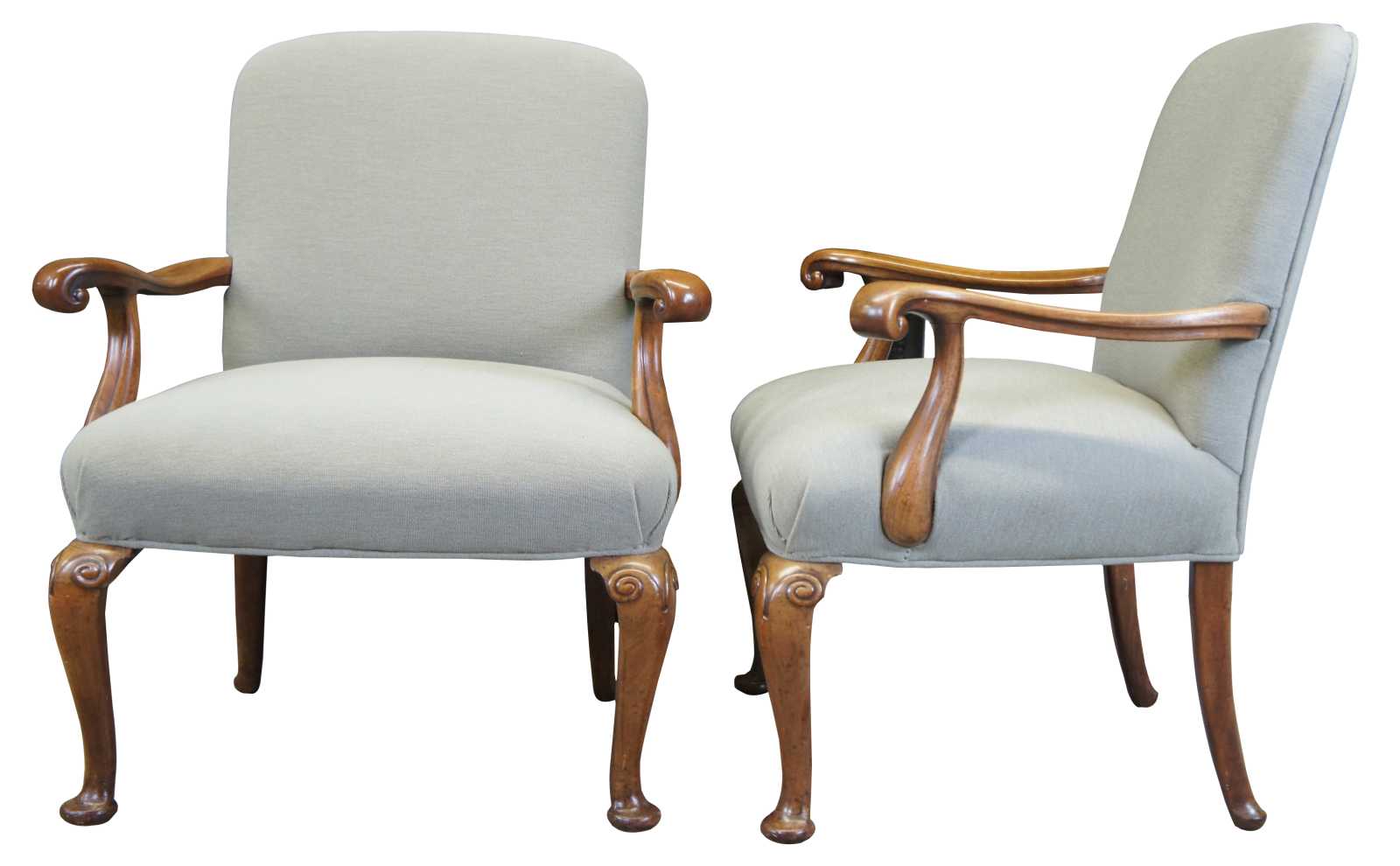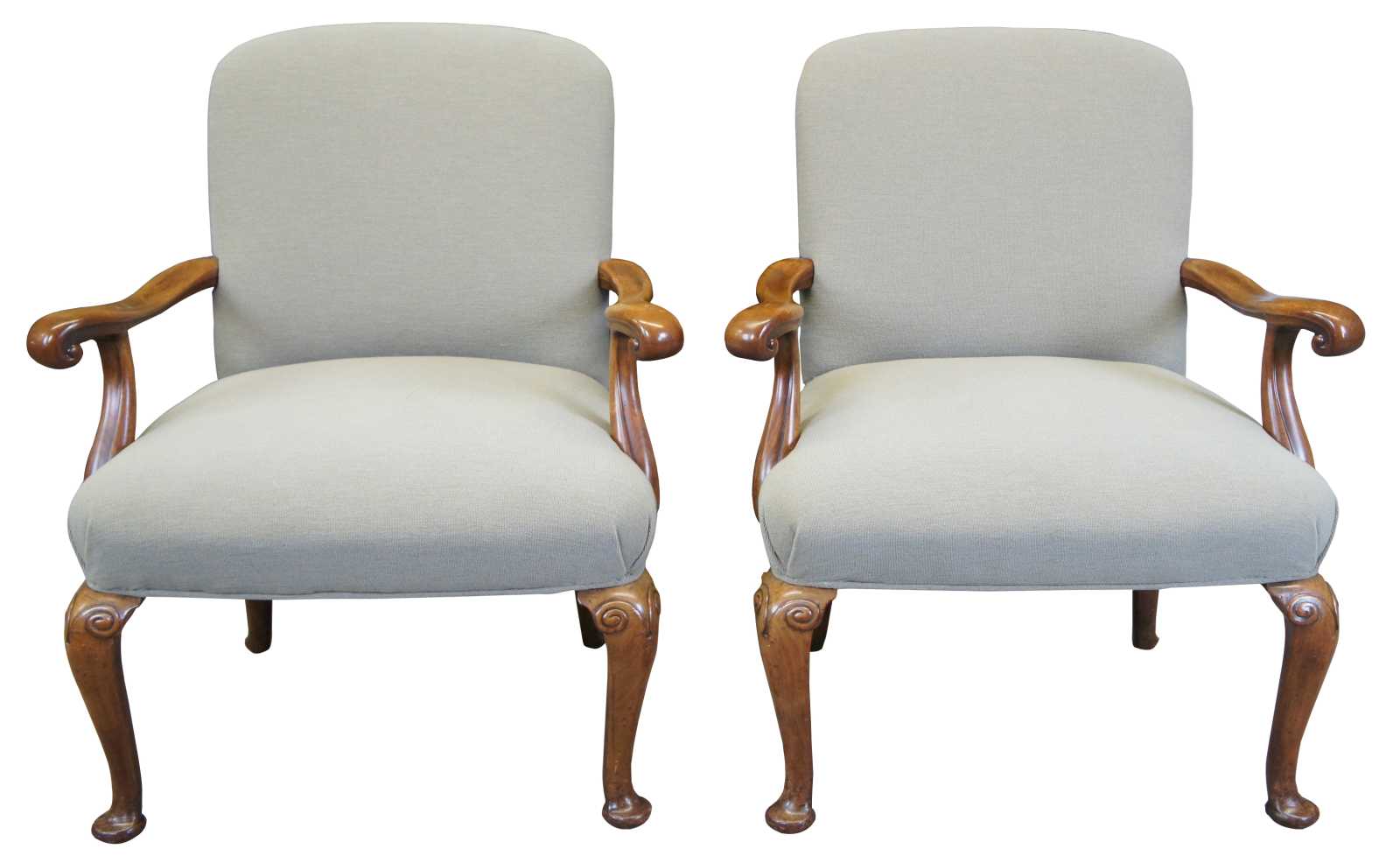 Two vintage French armchairs. Made of mahogany featuring serpentine form with plush upholstered back and seat, and ram carved accents over pad feet.