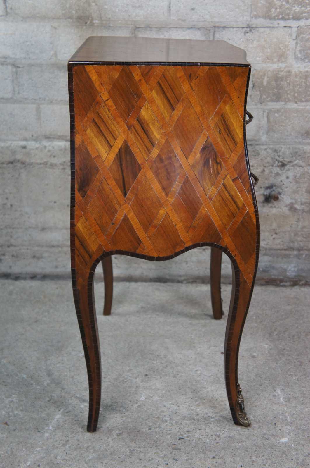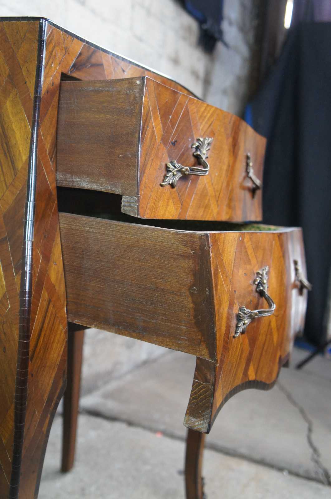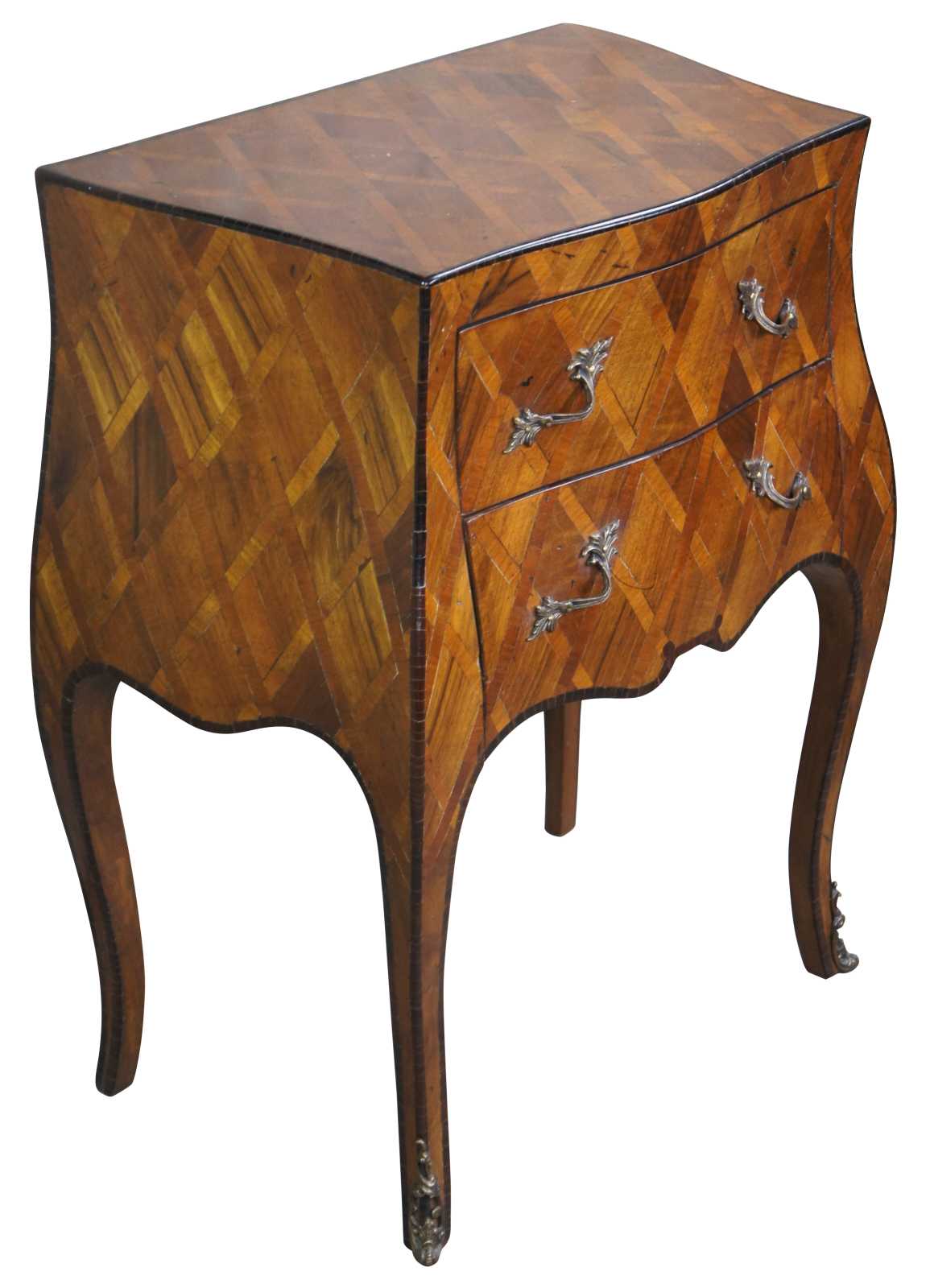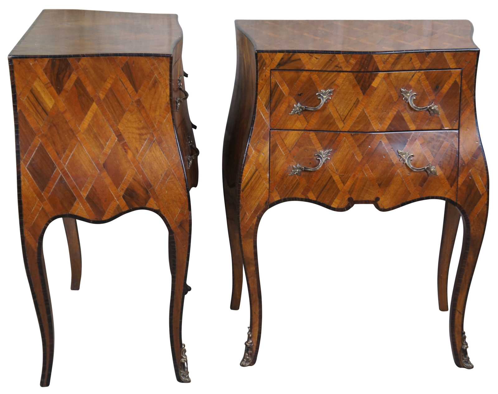 Petite Pair of antique Italian bombe nightstands, circa 1940s. A serpentine form made from walnut with lattice inlaid geometric parquetry design. Features two paper lined drawers, long cabriole legs and ormolu mounts. The chests are perfectly framed with an ebonized trim. Inspired by the Louis XV & Neoclassical designs. Great for use as bedside, end or occasional tables.