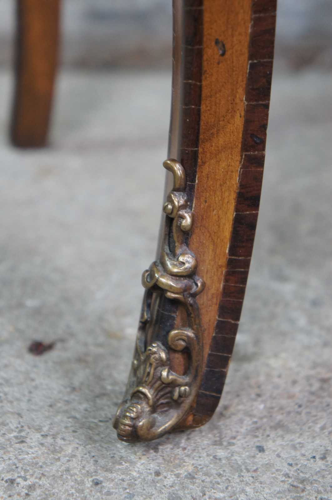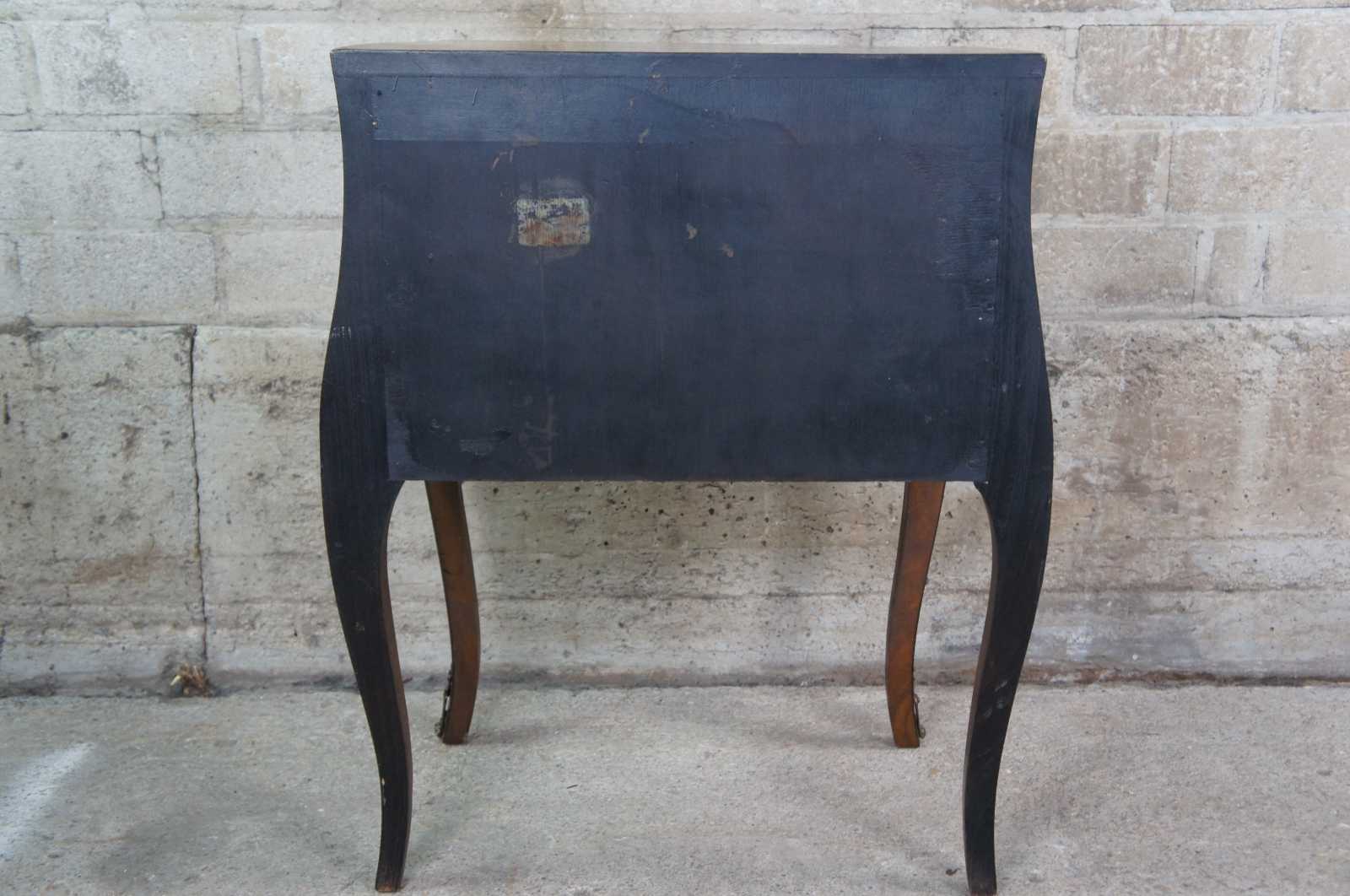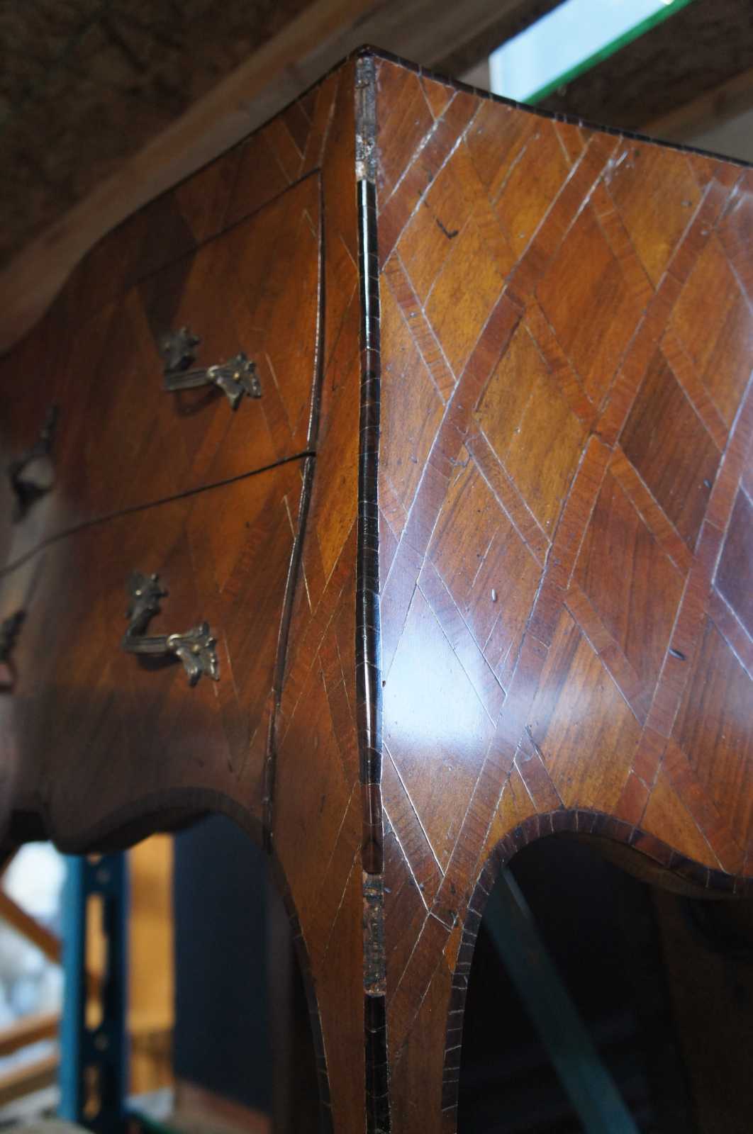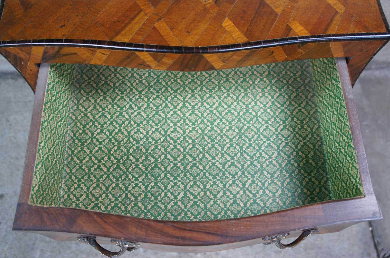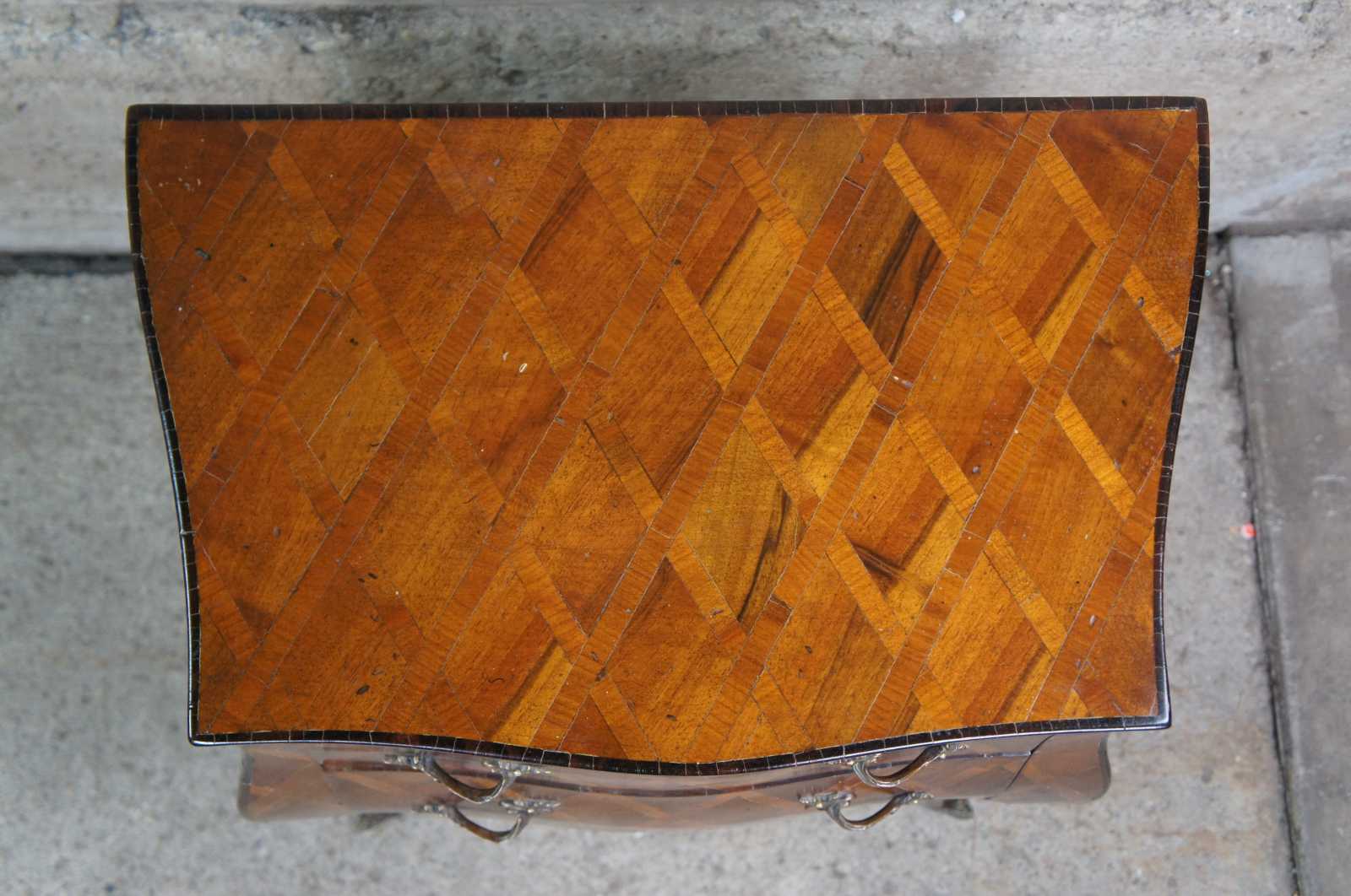Petite Pair of antique Italian bombe nightstands, circa 1940s. A serpentine form made from walnut with lattice inlaid geometric parquetry design. Features two paper lined drawers, long cabriole legs and ormolu mounts. The chests are perfectly framed with an ebonized trim. Inspired by the Louis XV & Neoclassical designs. Great for use as bedside, end or occasional tables.
