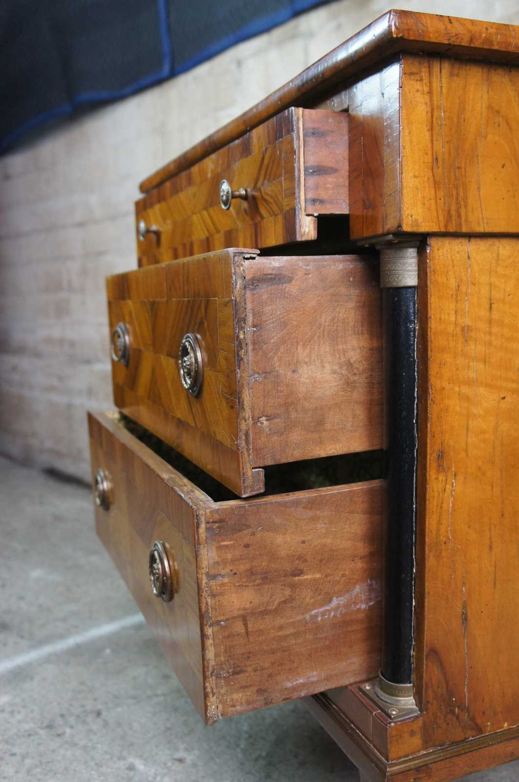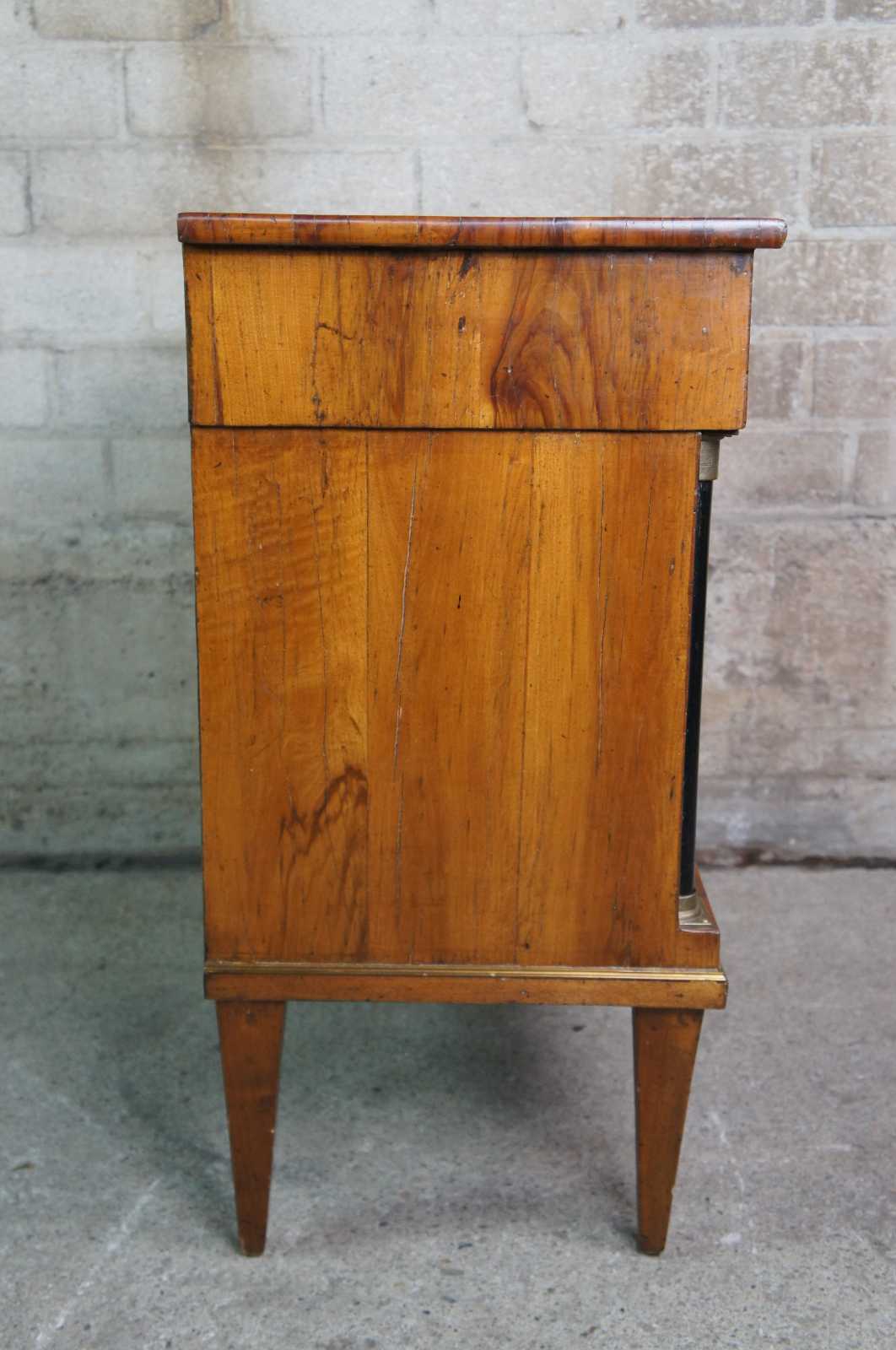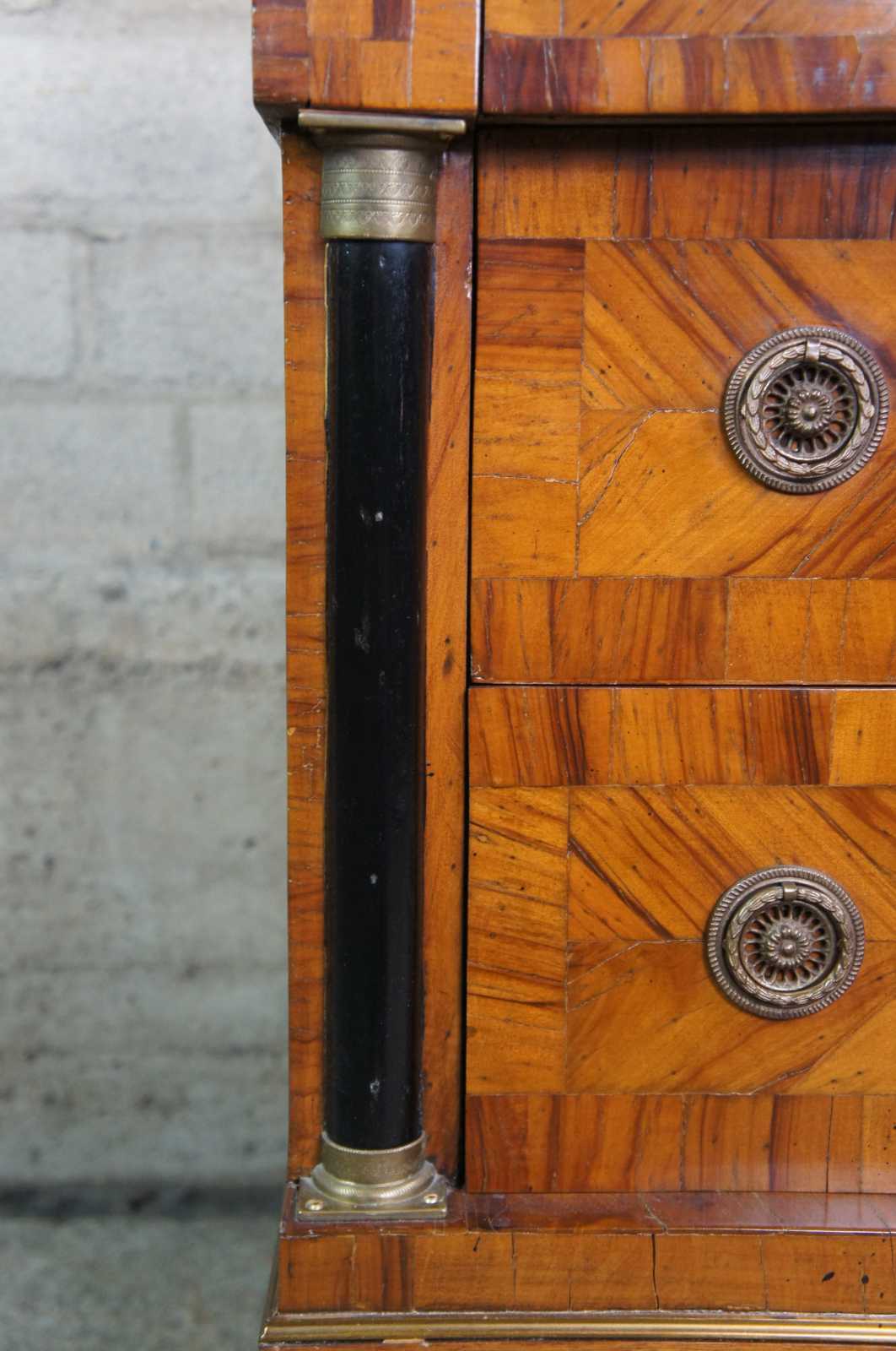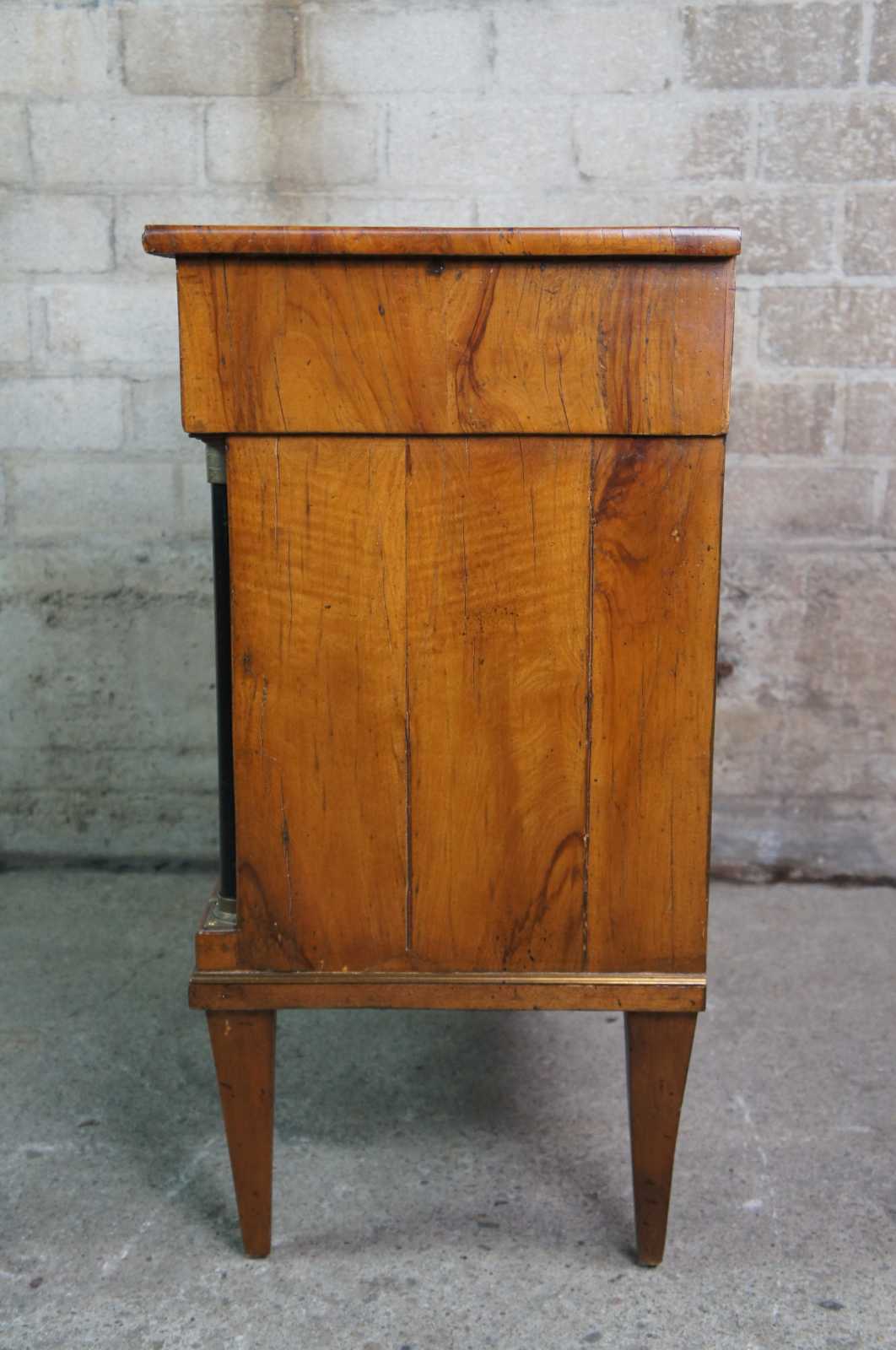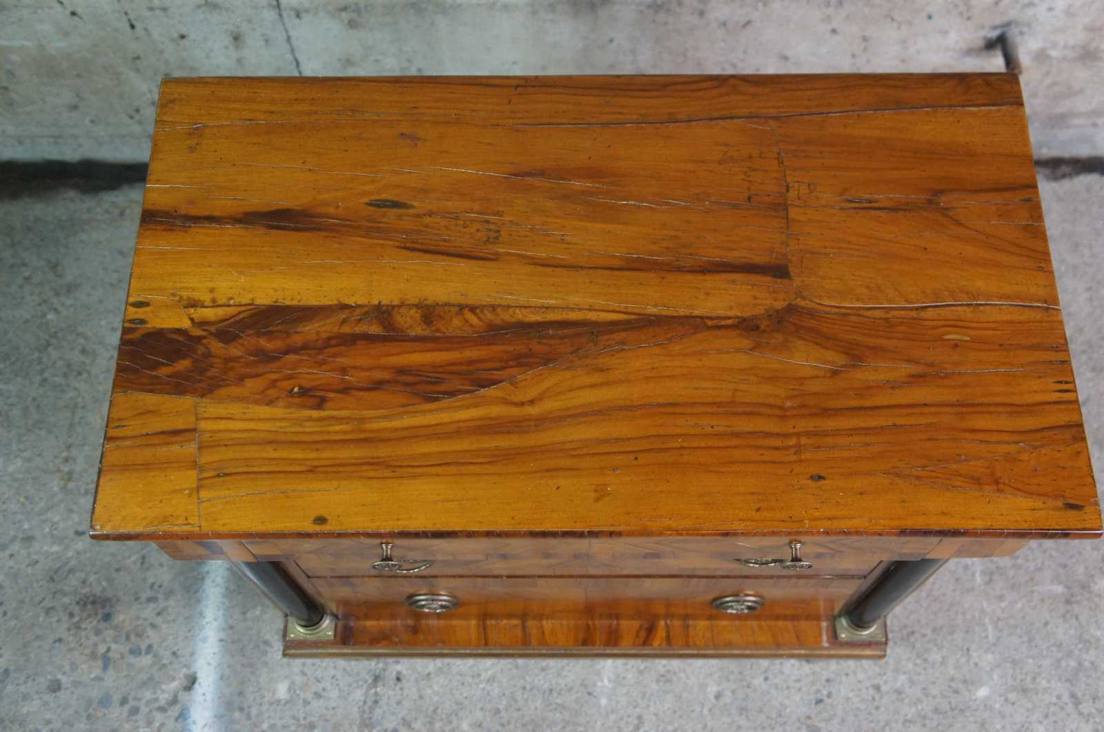 Pair of antique Italian Empire nighstands or side tables. Made of olive wood featuring matchbook veneer, quartered ebonized columns with brass capitals and neoclassical drawer pulls. The chests are supported by square tapered legs.