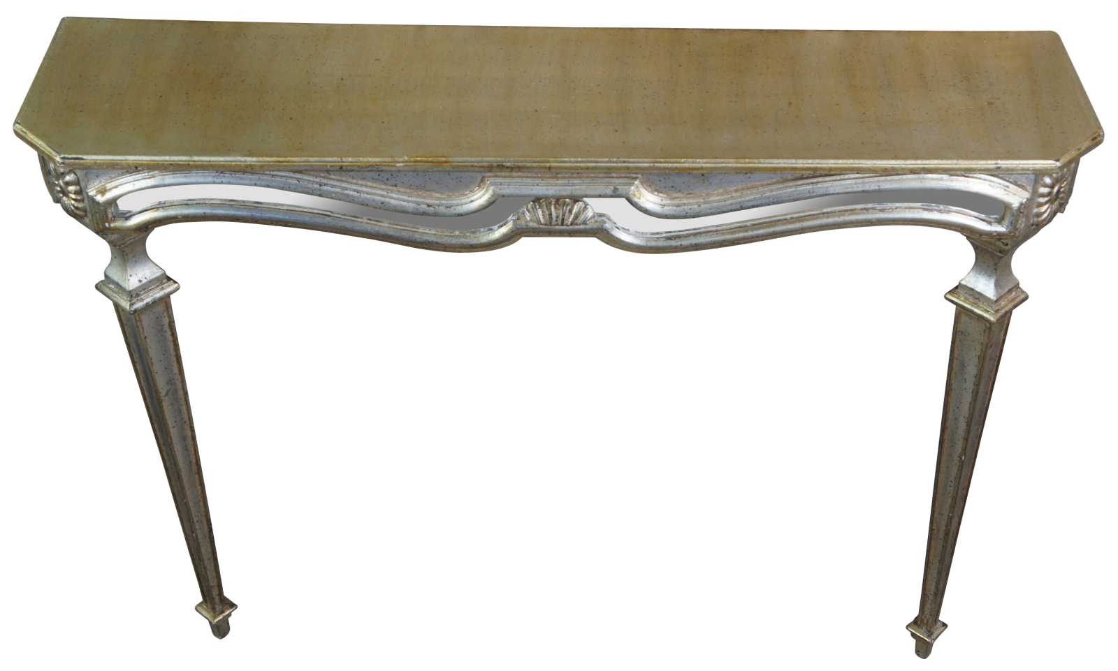 Vintage mirrored wall mount entry console table feauring low profile with distressed silver and champagne finish. Made in Italy.