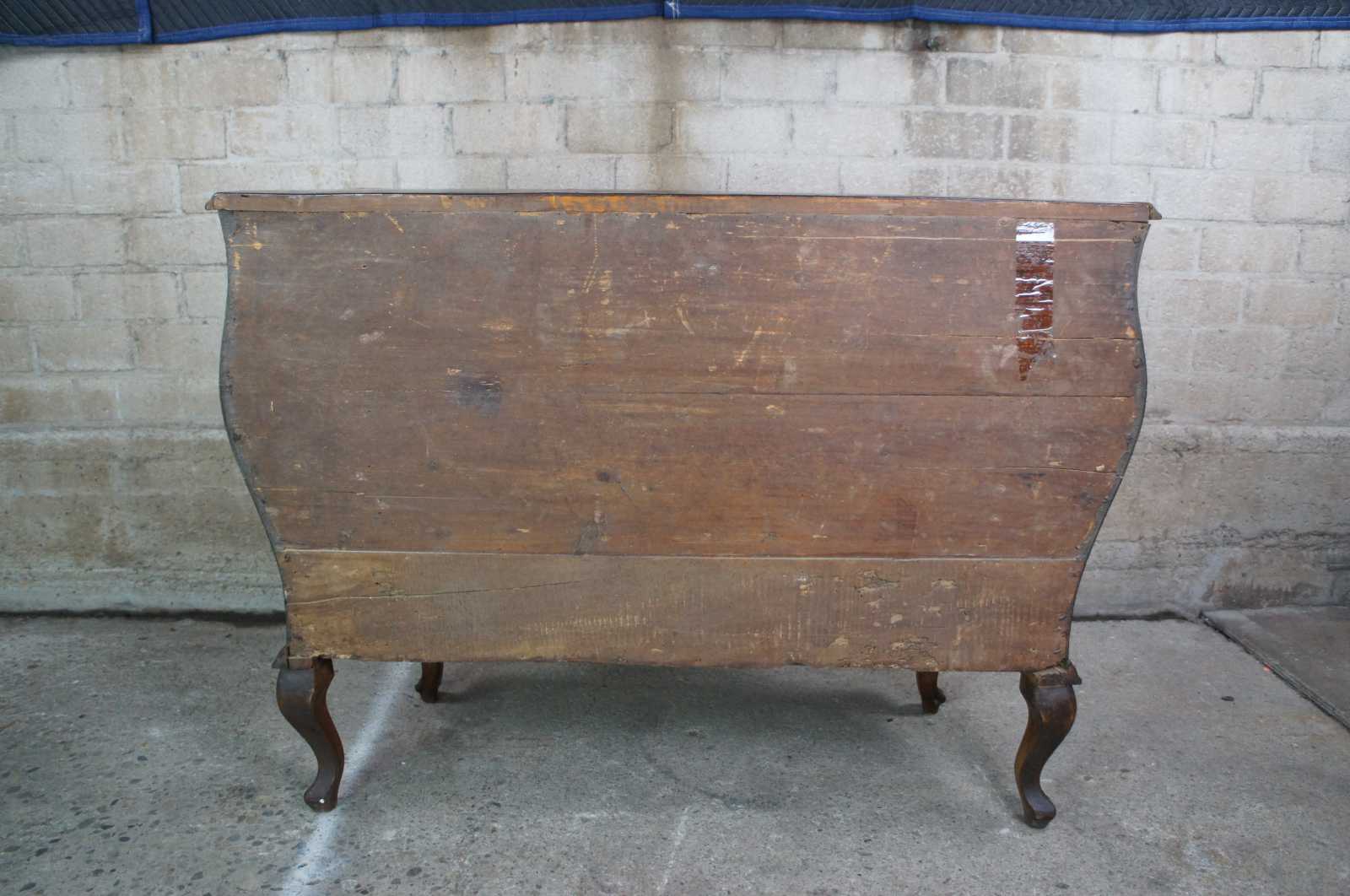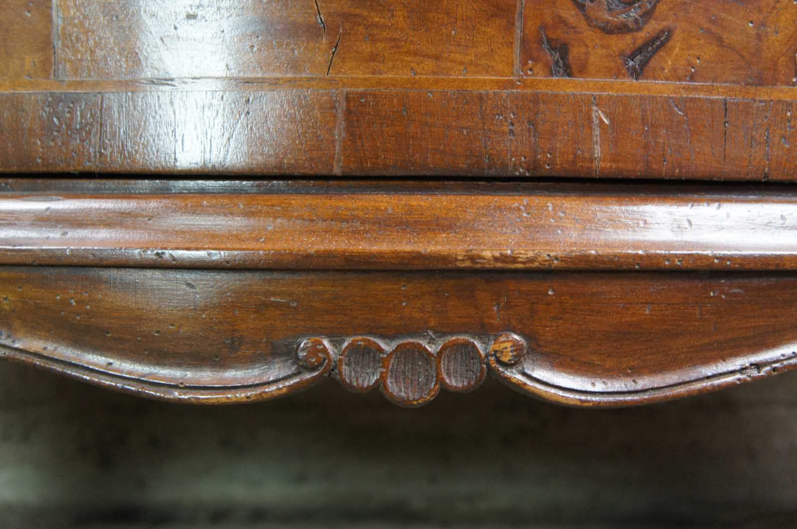 Antique Italian bombe, commode or chest, circa first half 19th century. Made of walnut and olive wood with natural distressing. Features serpentine demilune form with inlaid accents, brass hardware and hand cut nails.