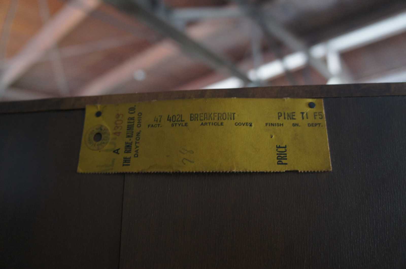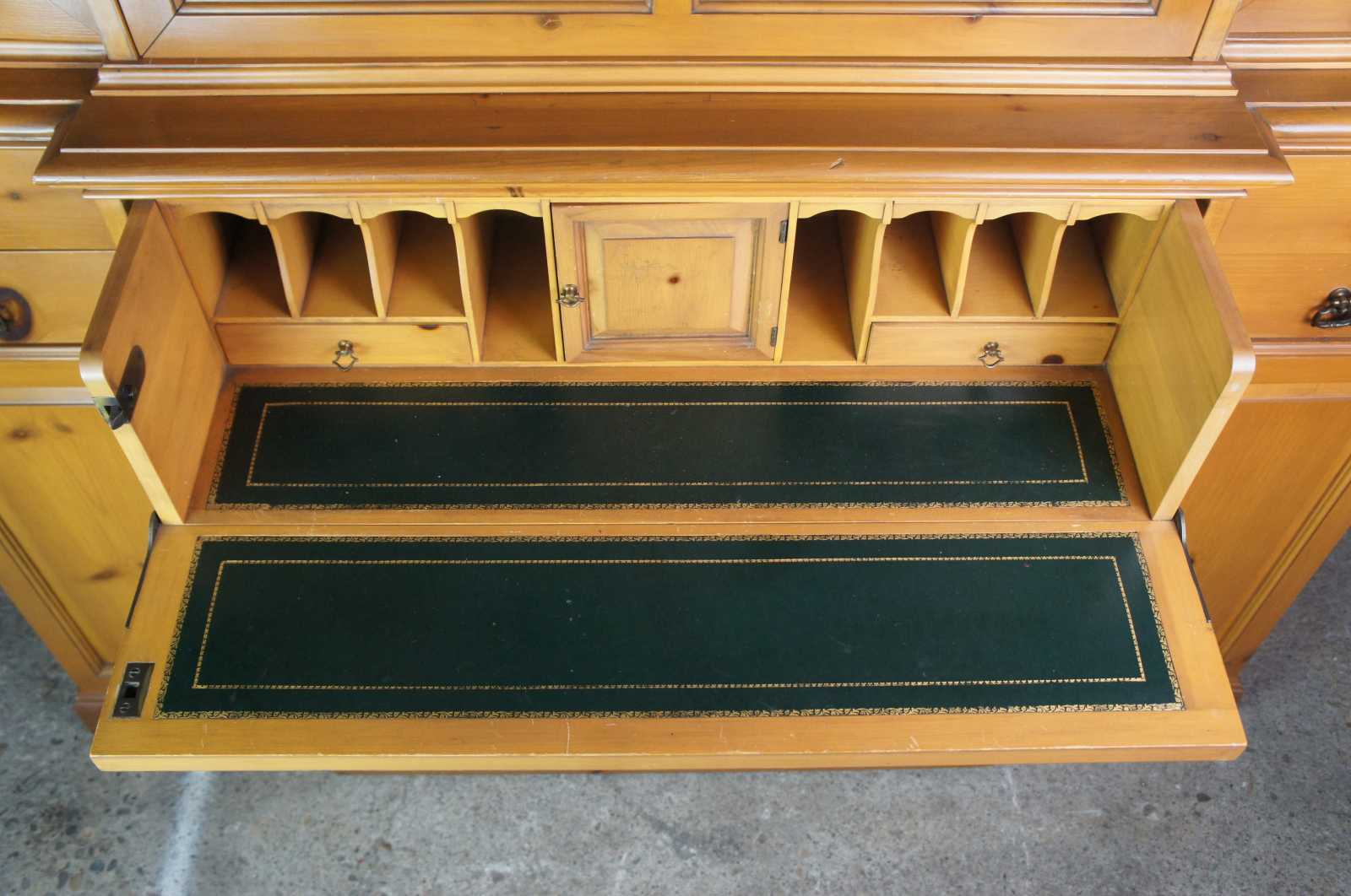 Colonial Manufacturing Company Treasure House breakfront, circa mid 20th century Made from pine featuring drop front leather butler writing surface with multiple cubbies and drawers, with side cabinets, lower drawers, and brass lattice doors with green painted interior. Purchased from the Rike Kumler Co in Dayton Ohio.br