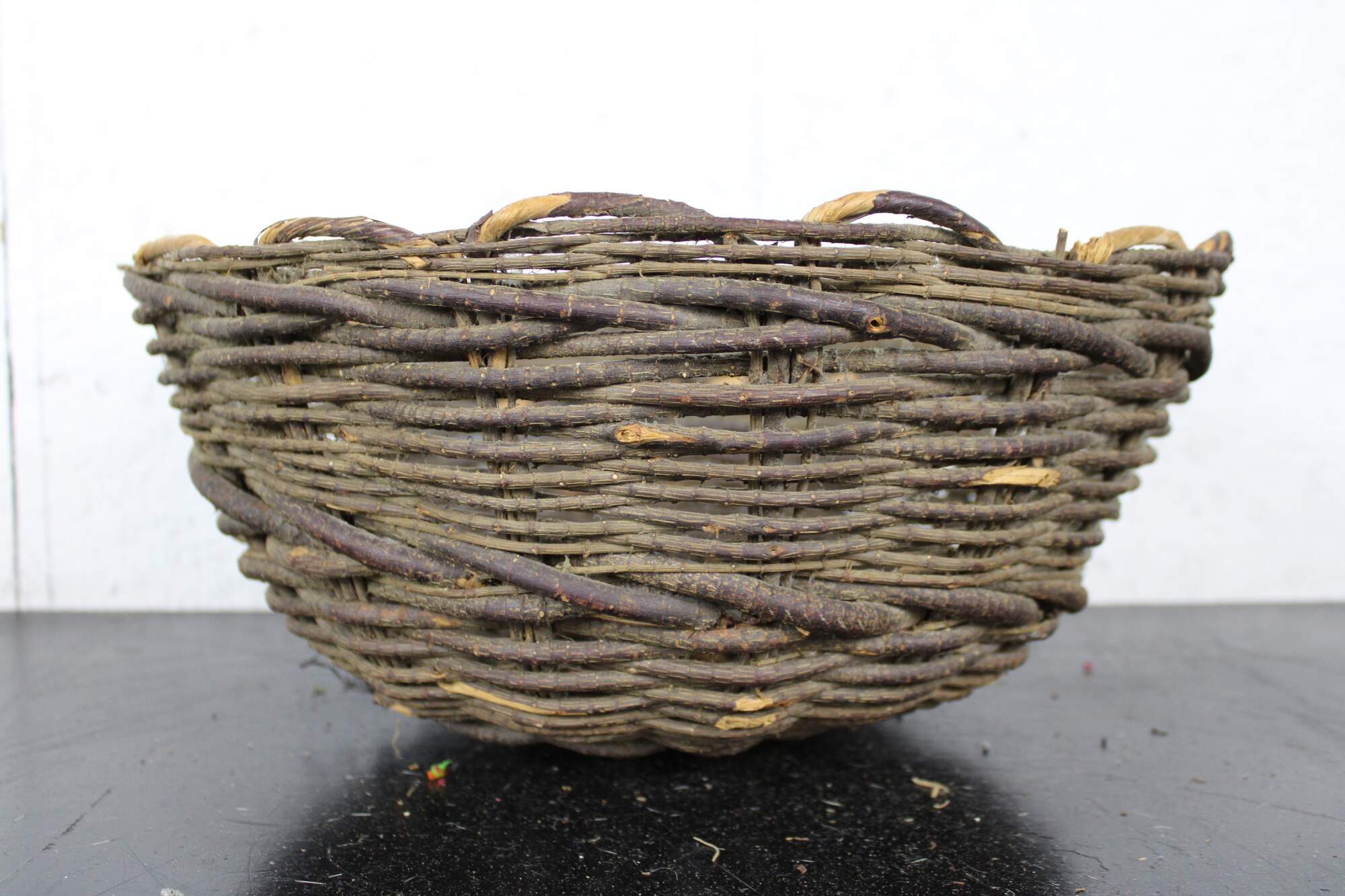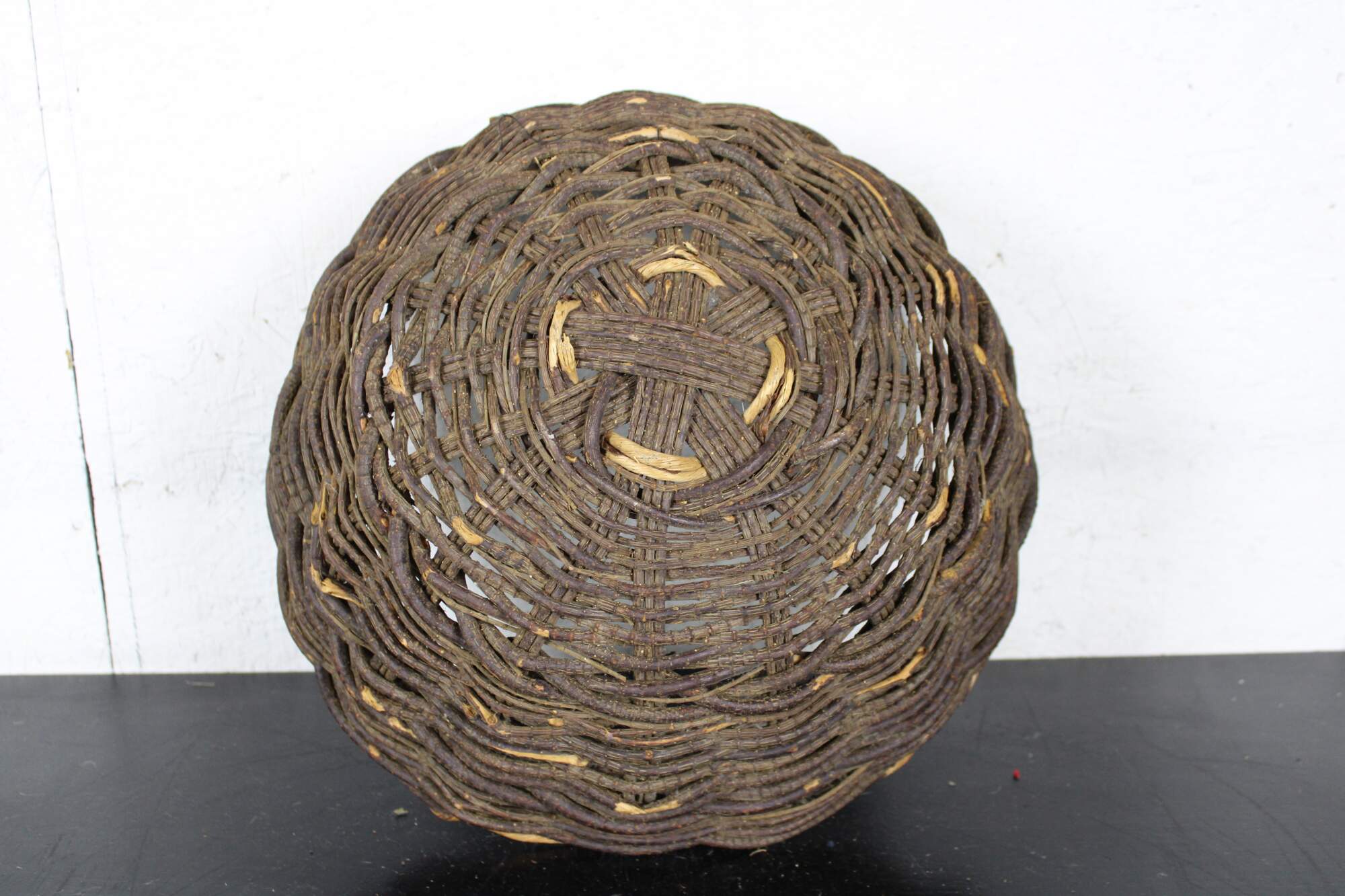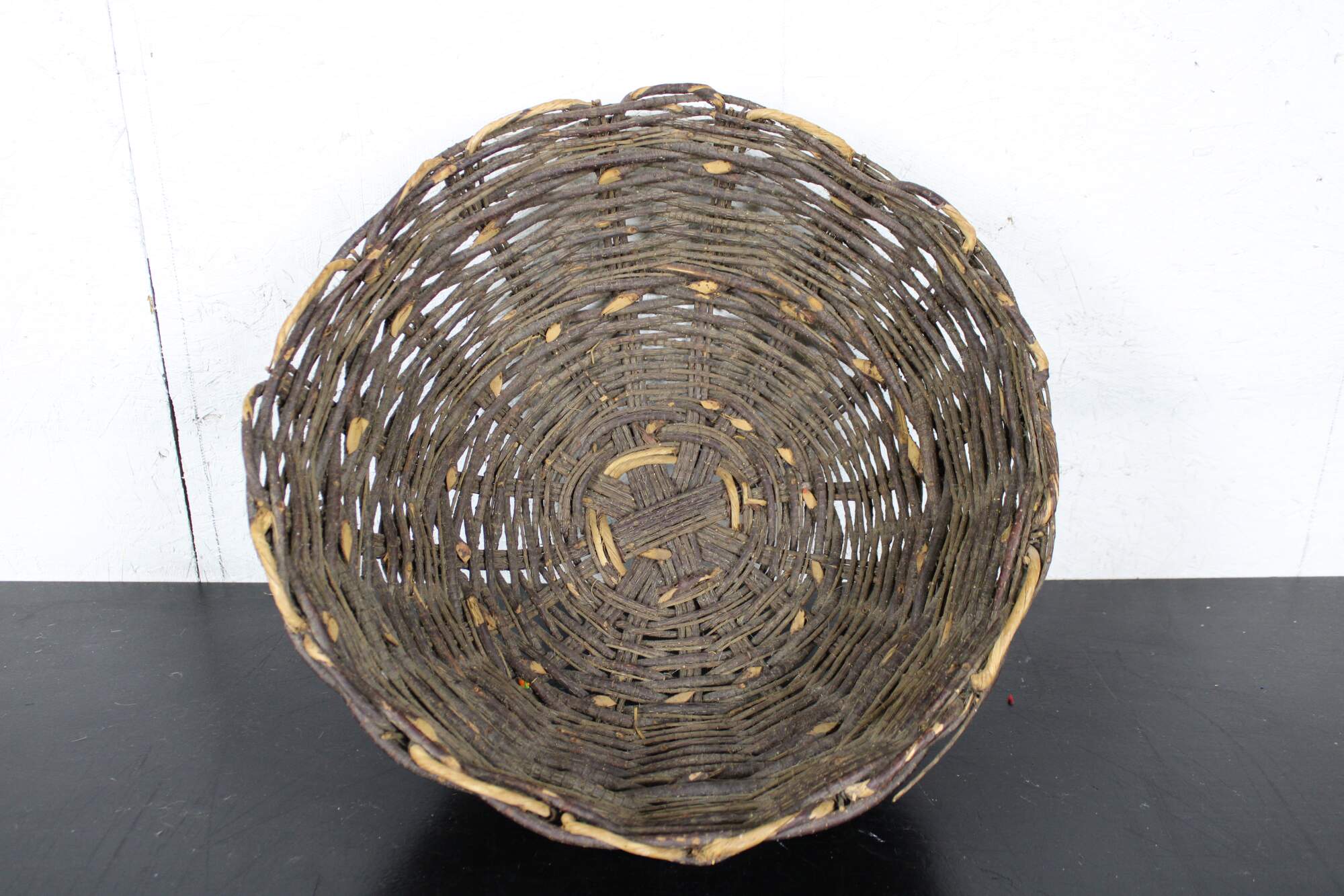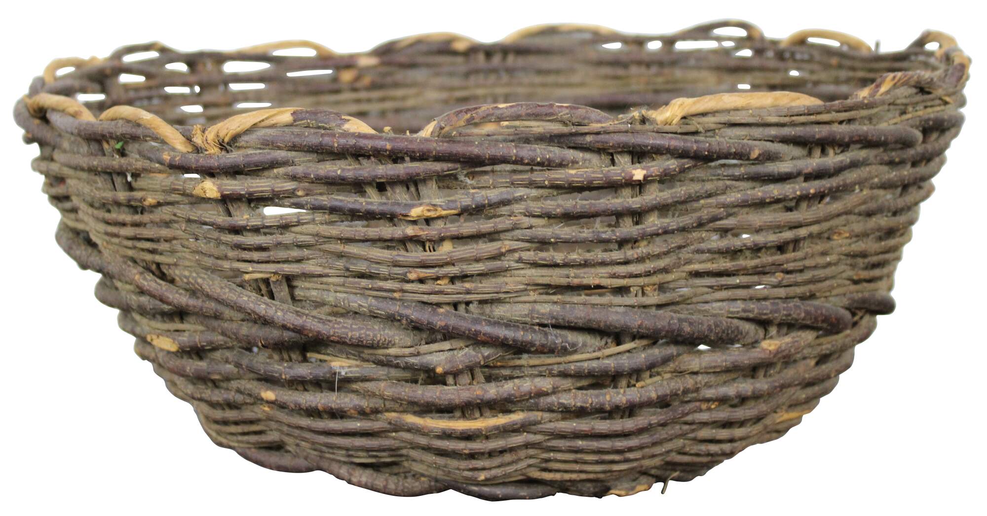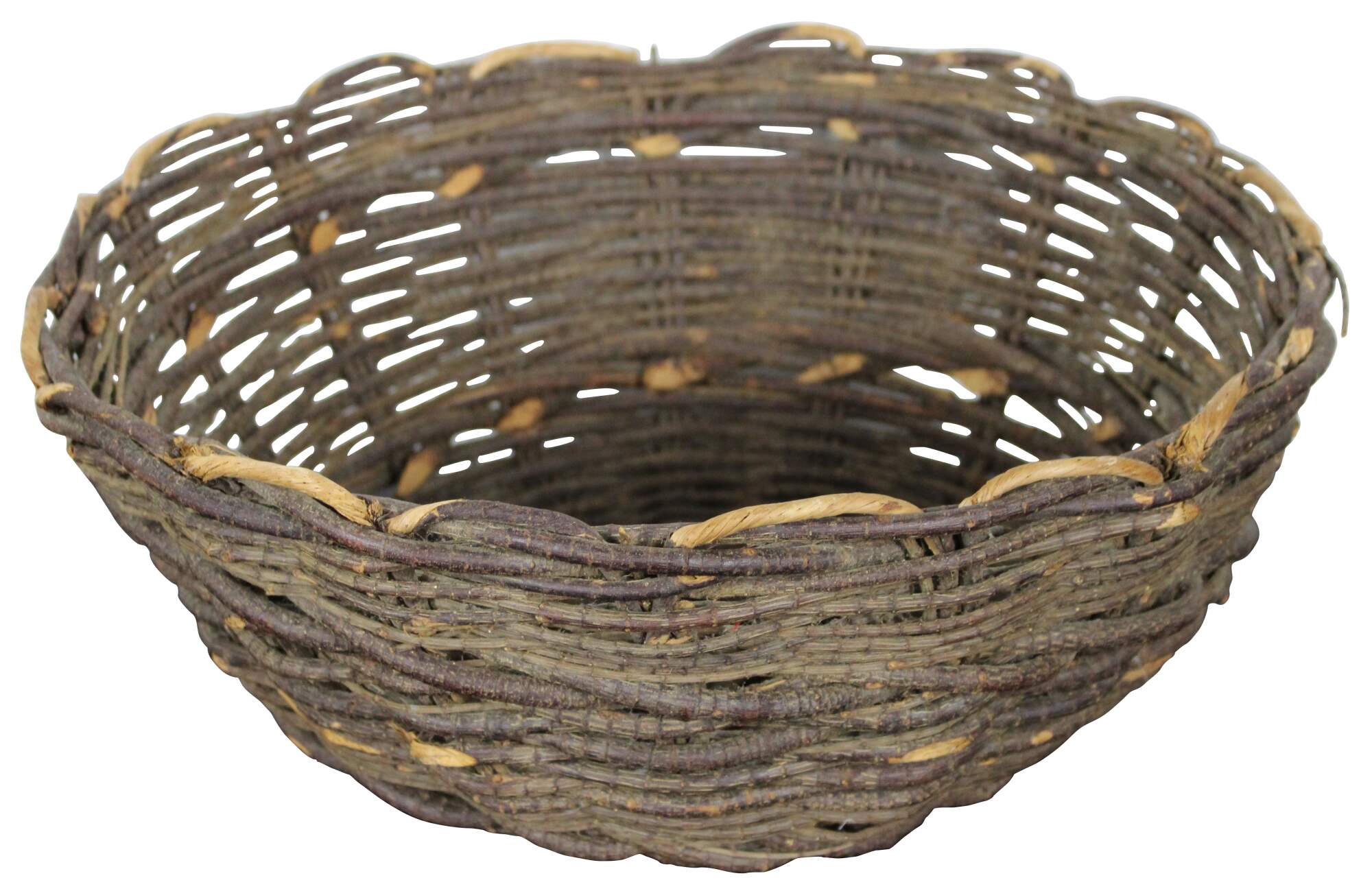 Antique primitive hand woven willow basket with no handles and a gently scalloped top edge.