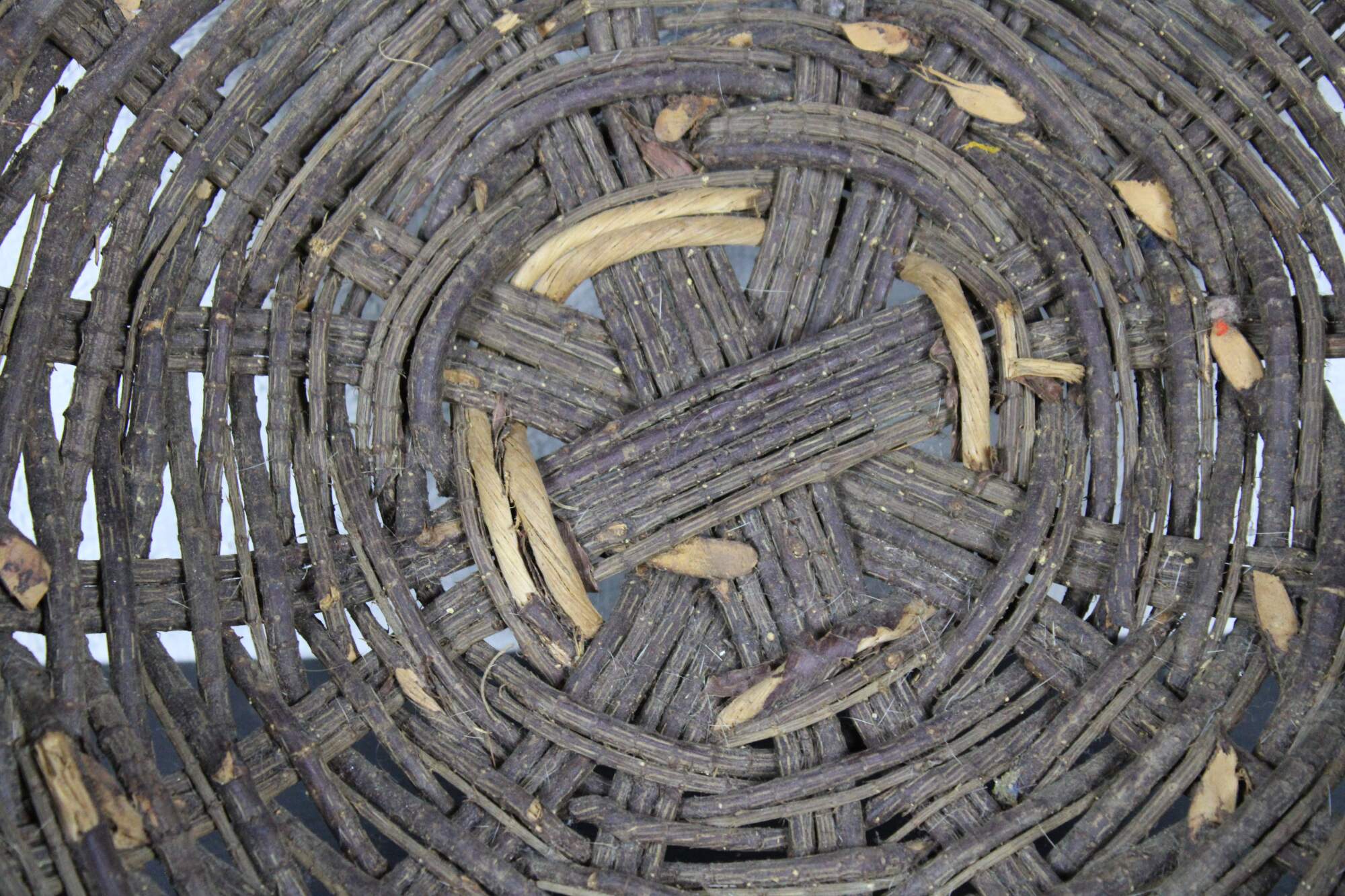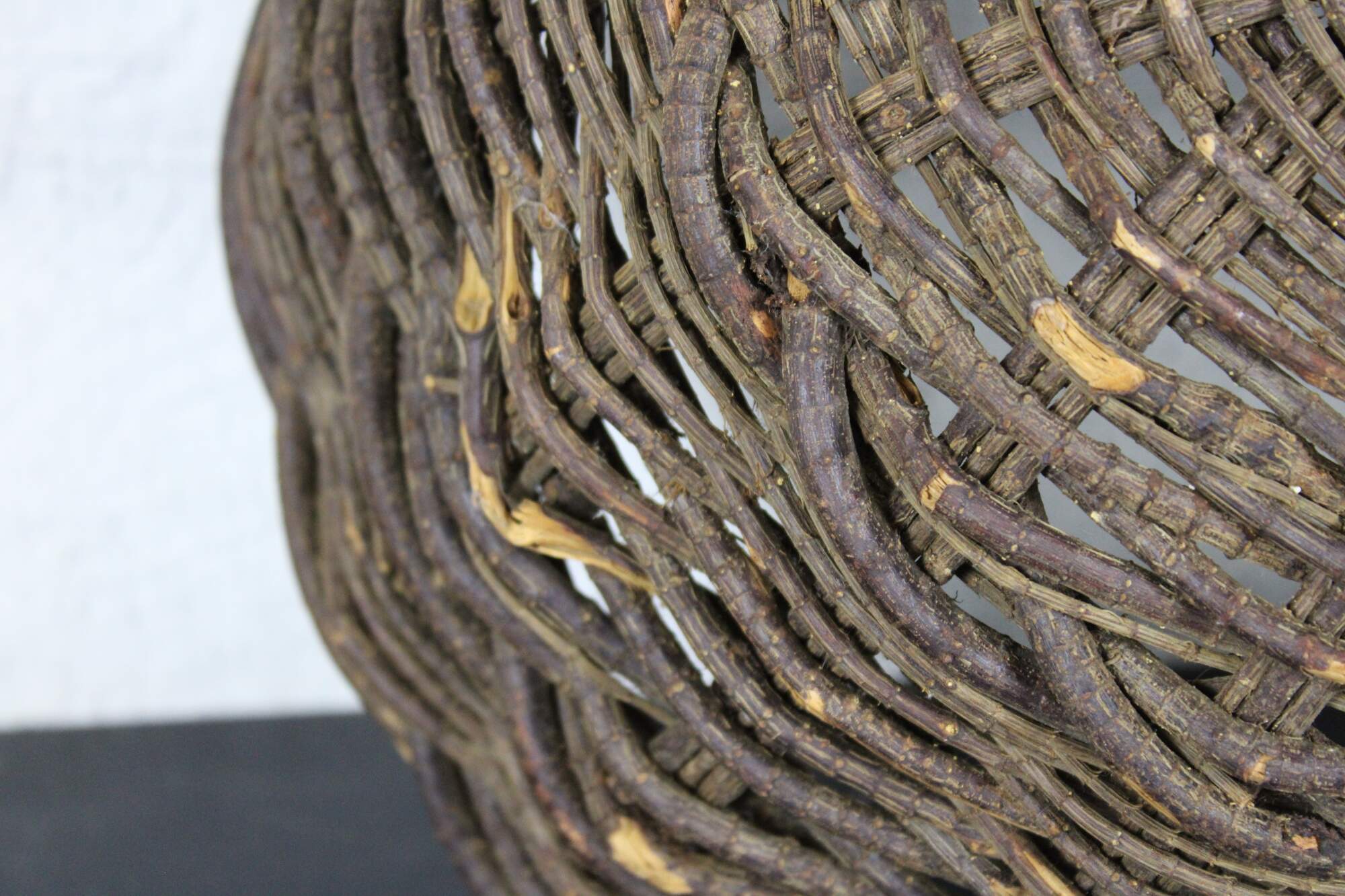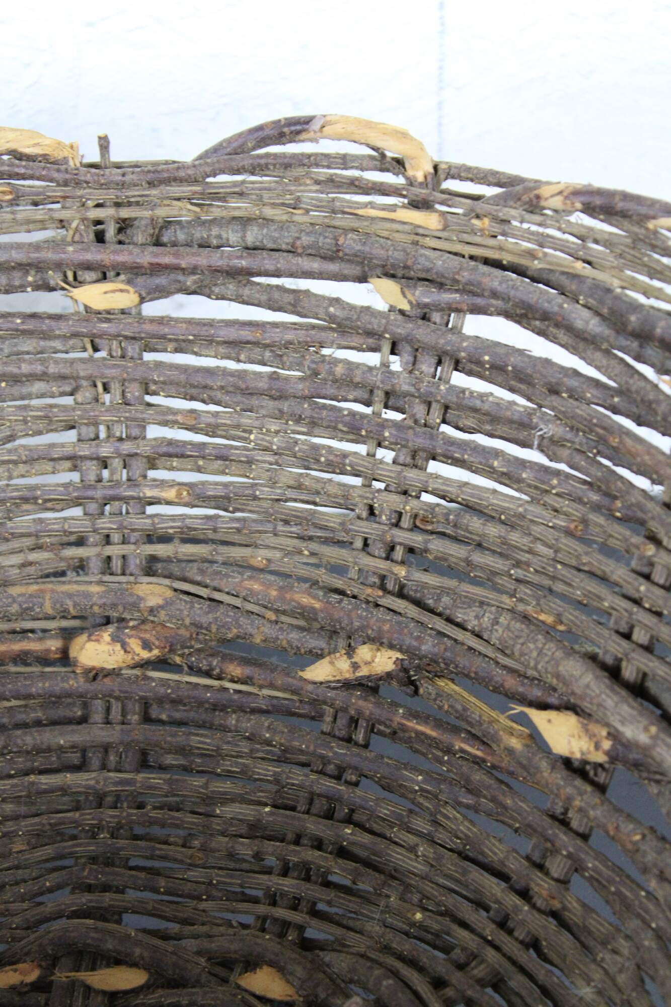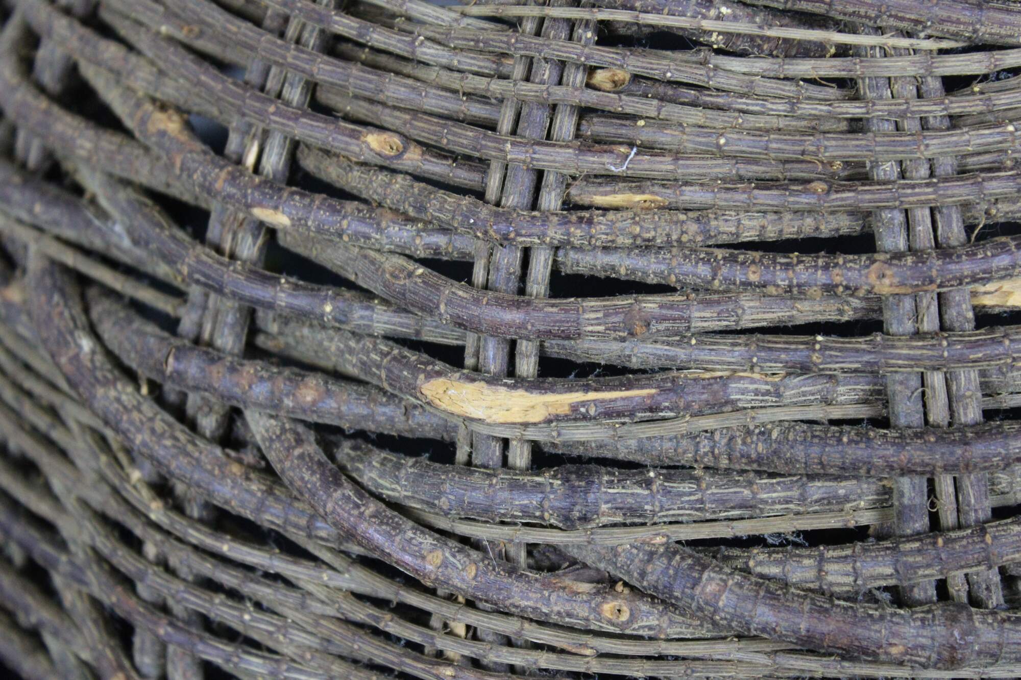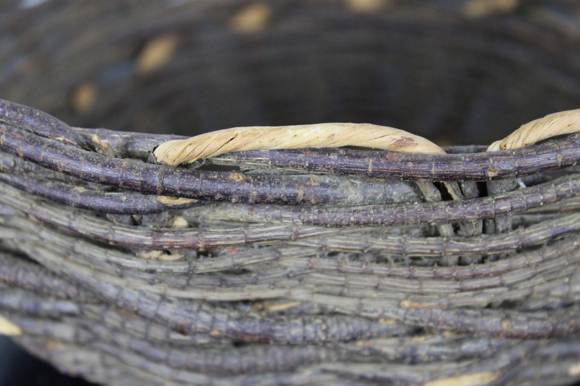 Antique primitive hand woven willow basket with no handles and a gently scalloped top edge.