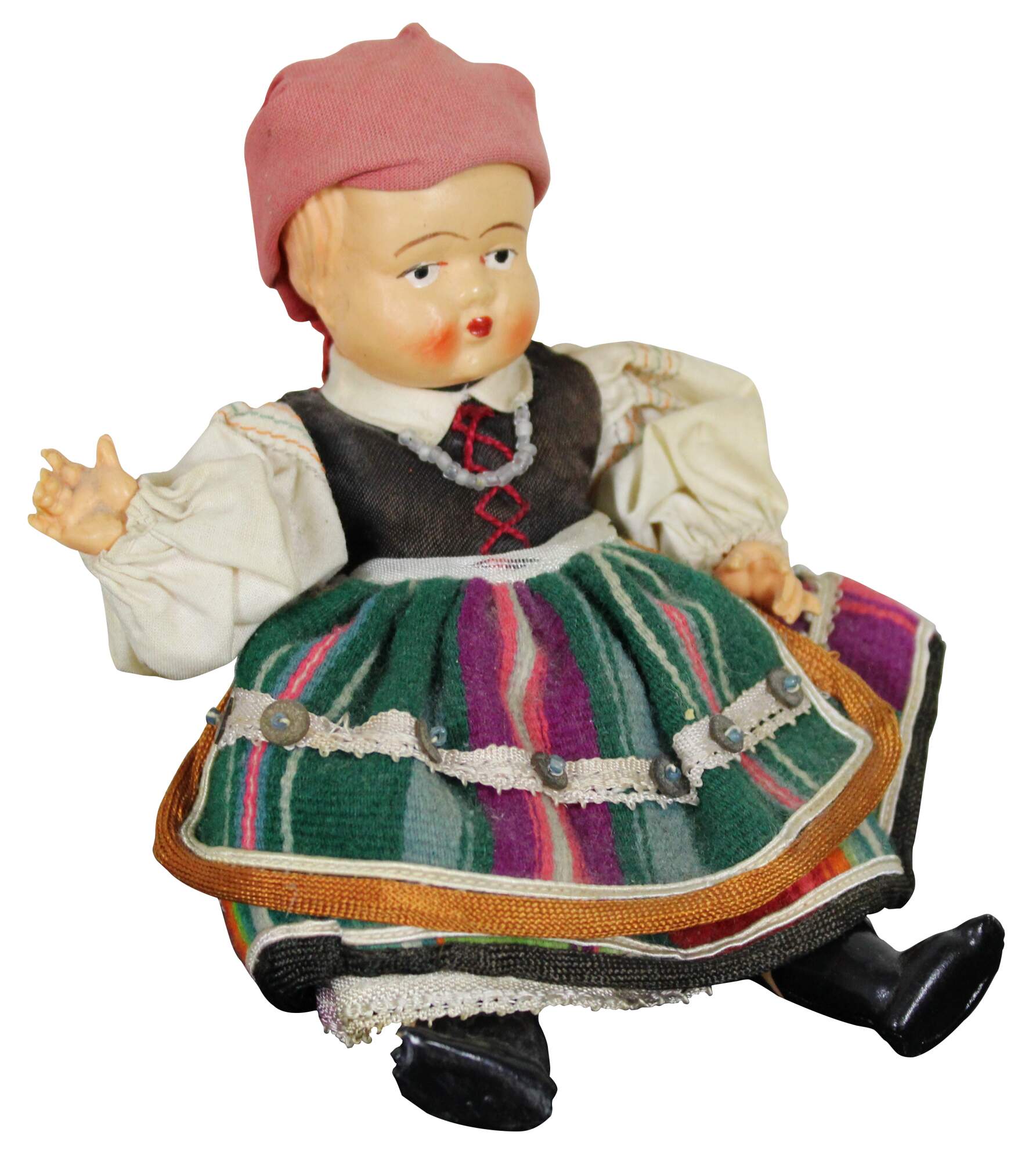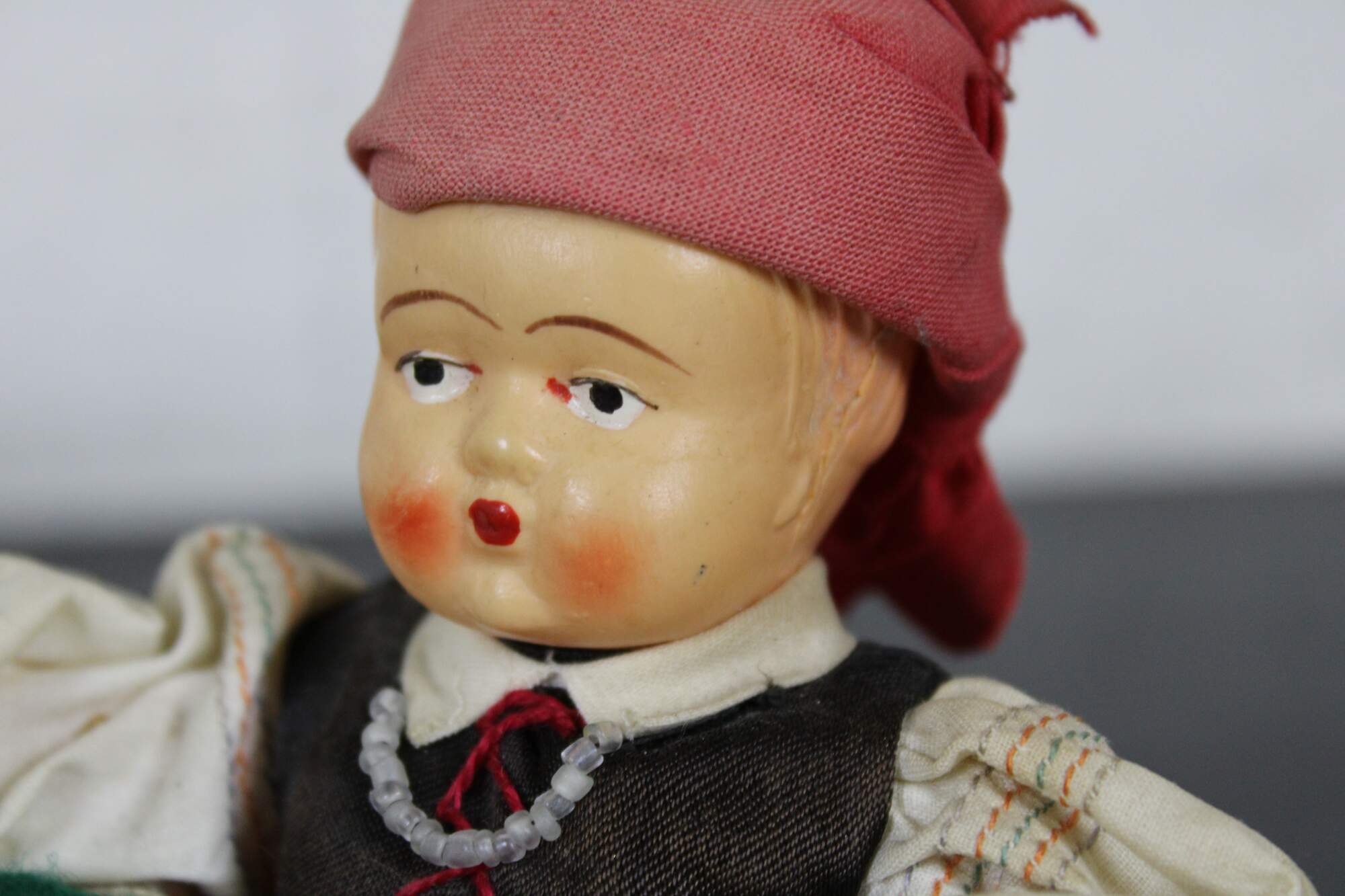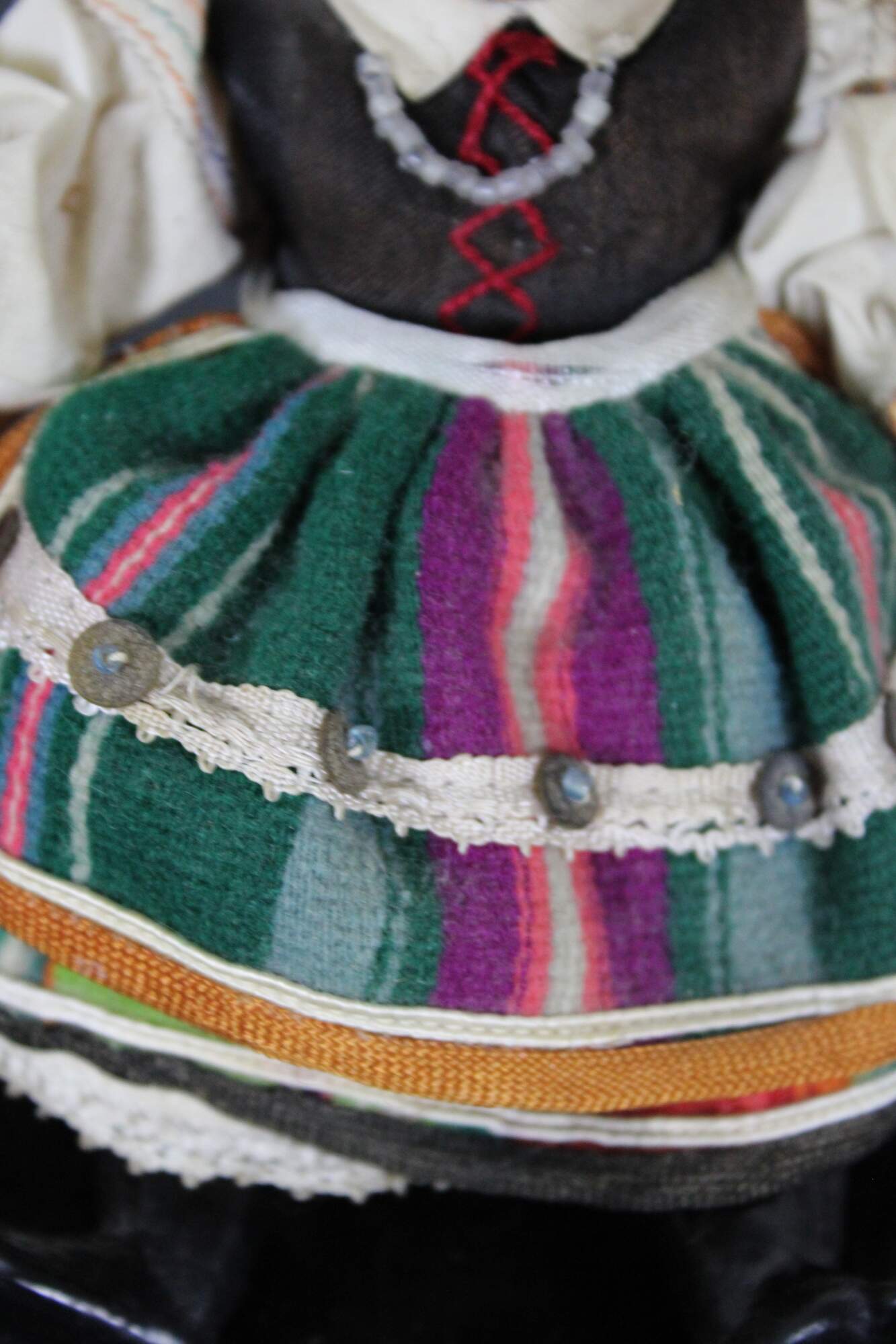 Pair of vintage mid to late 20th century dolls in traditional Greek folk dress with woolen capes.