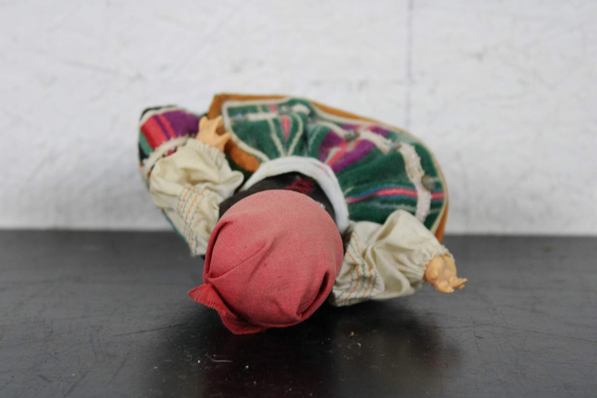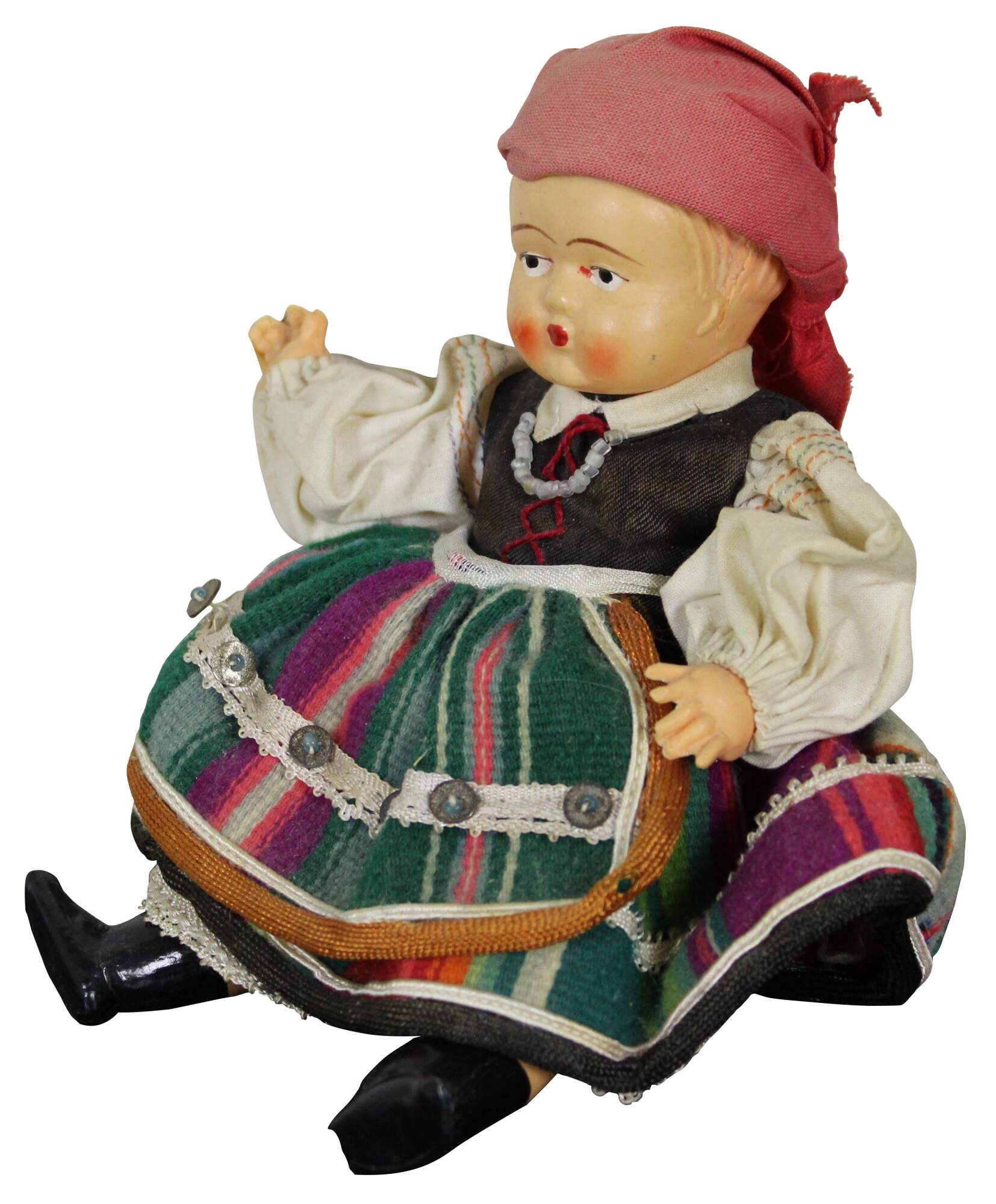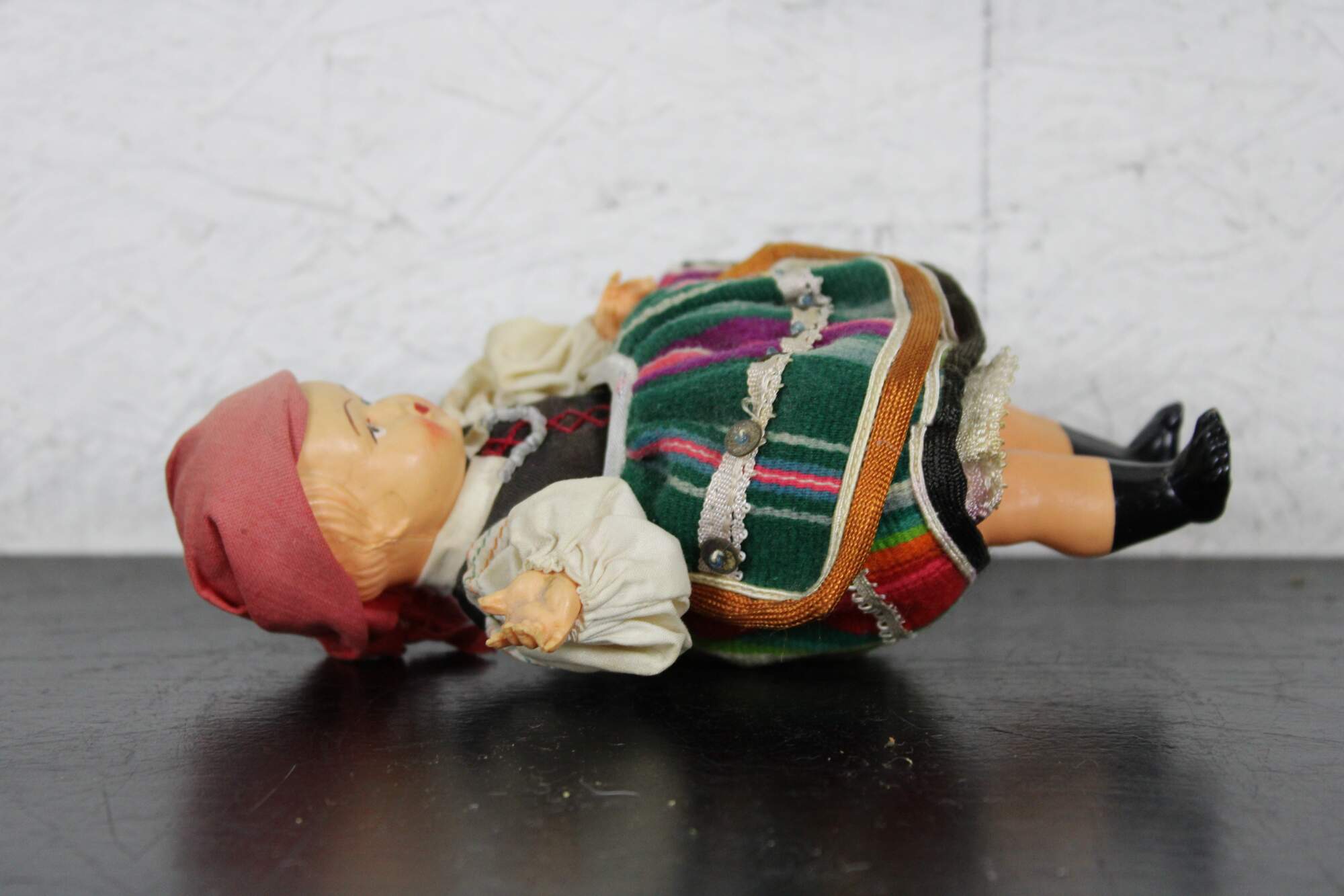 Pair of vintage mid to late 20th century dolls in traditional Greek folk dress with woolen capes.