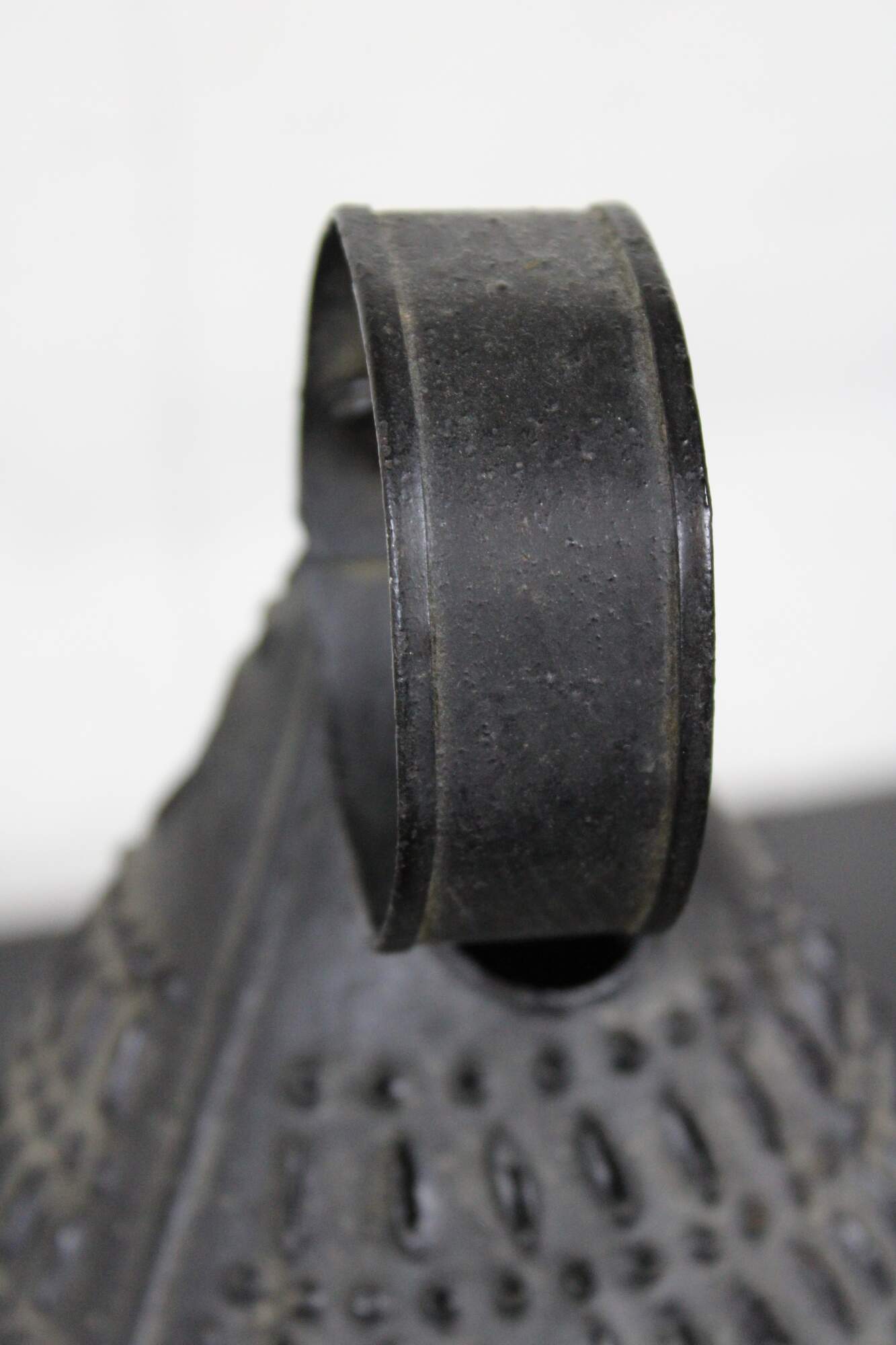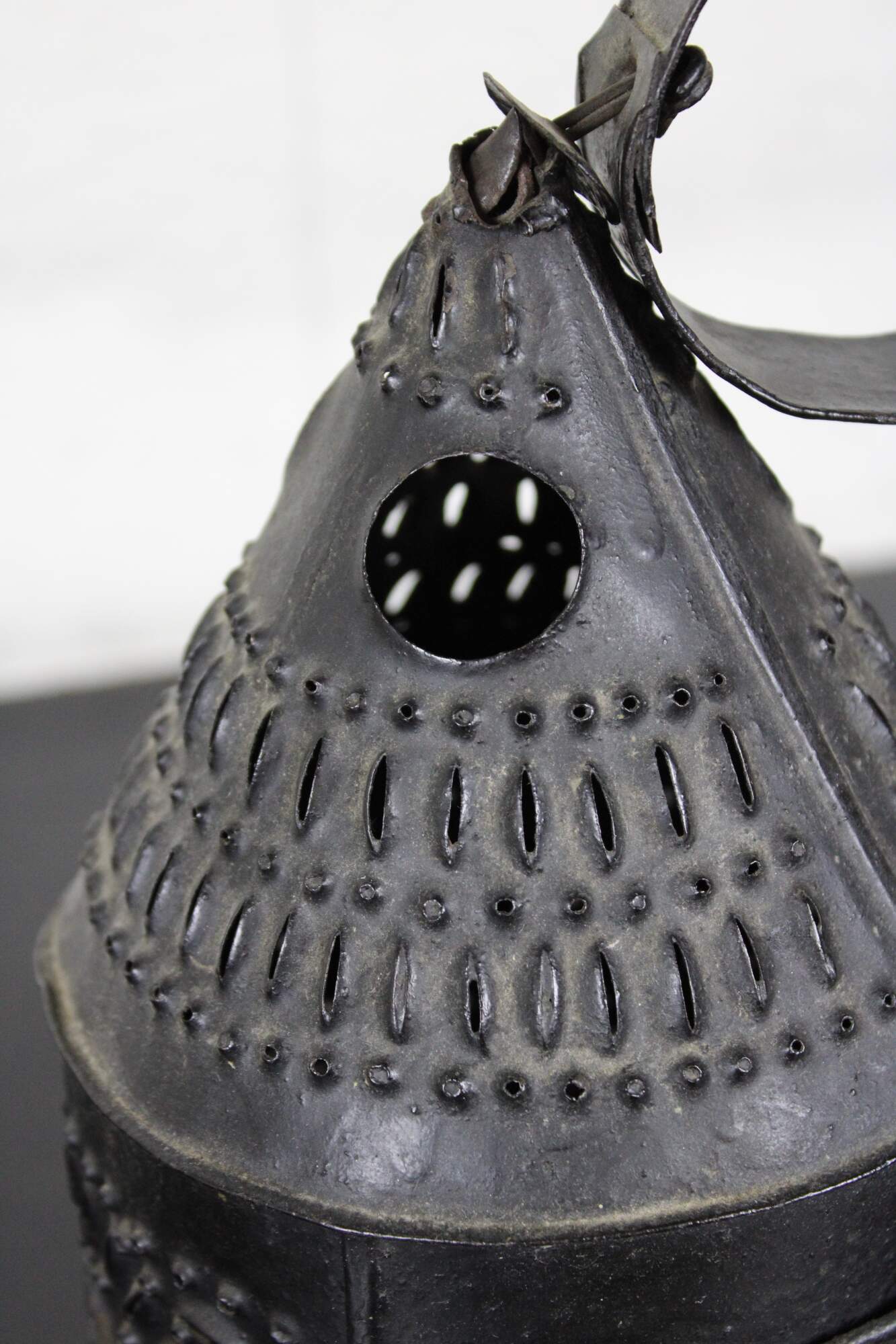 Antique late 18th / early 19th century black pierced or punched tin candle lantern with ring for carrying or hanging.