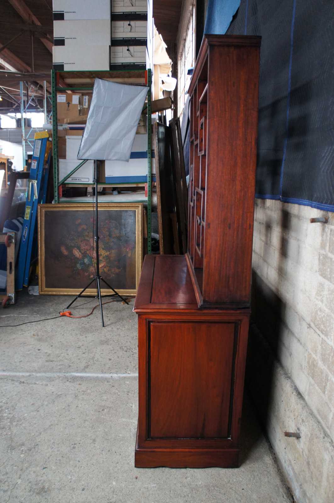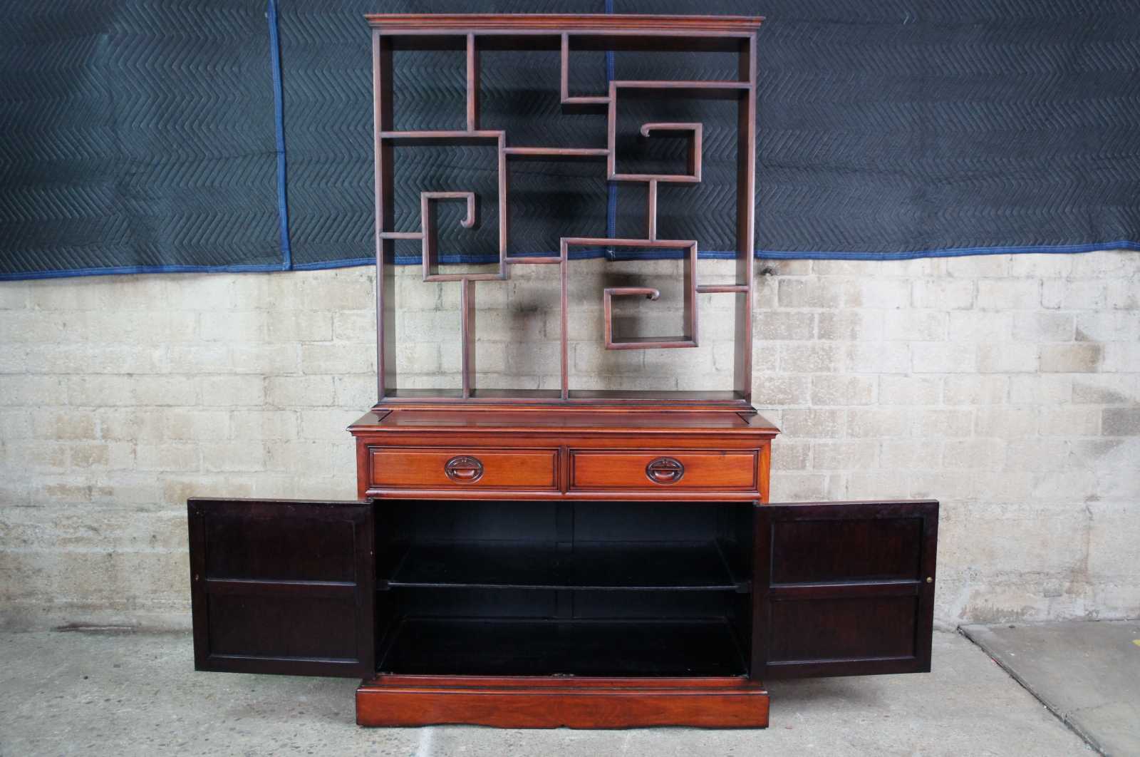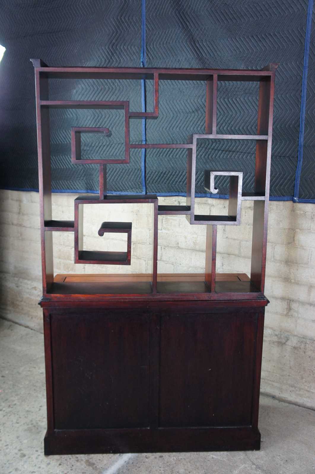 Antique Chinese Chinoiserie Ming Rosewood etagere cabinet. Made of solid rosewood featuring tiered upper bookcase curio shelving with two lower drawers and one cabinet.
