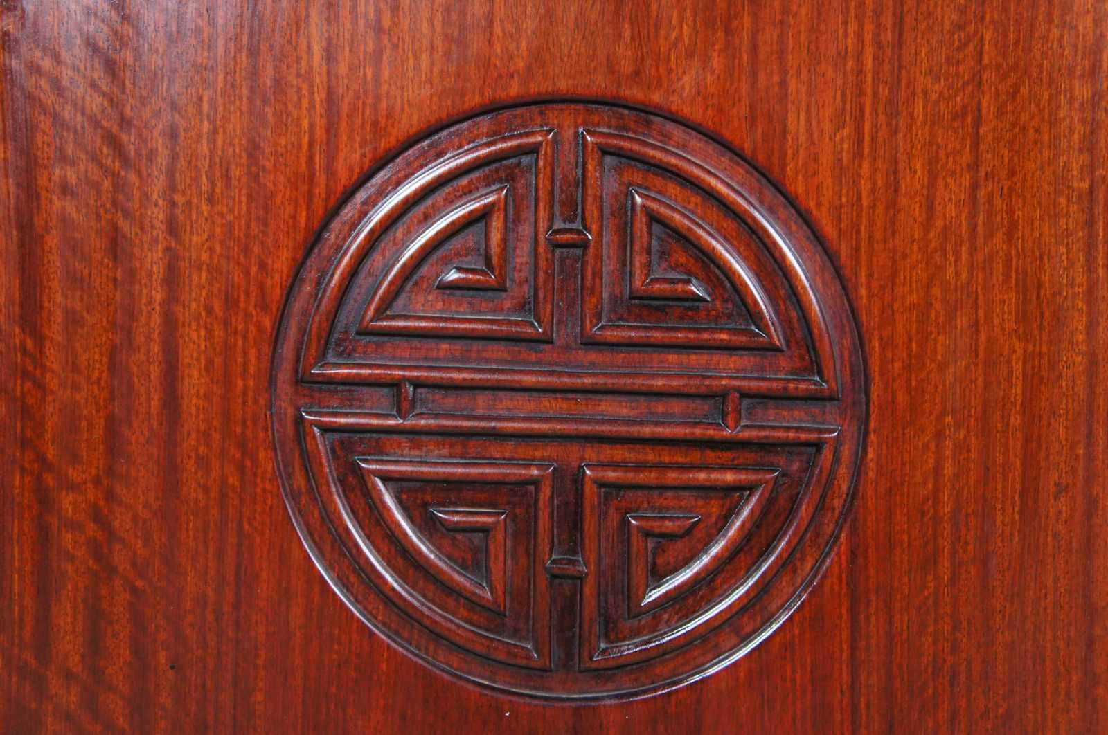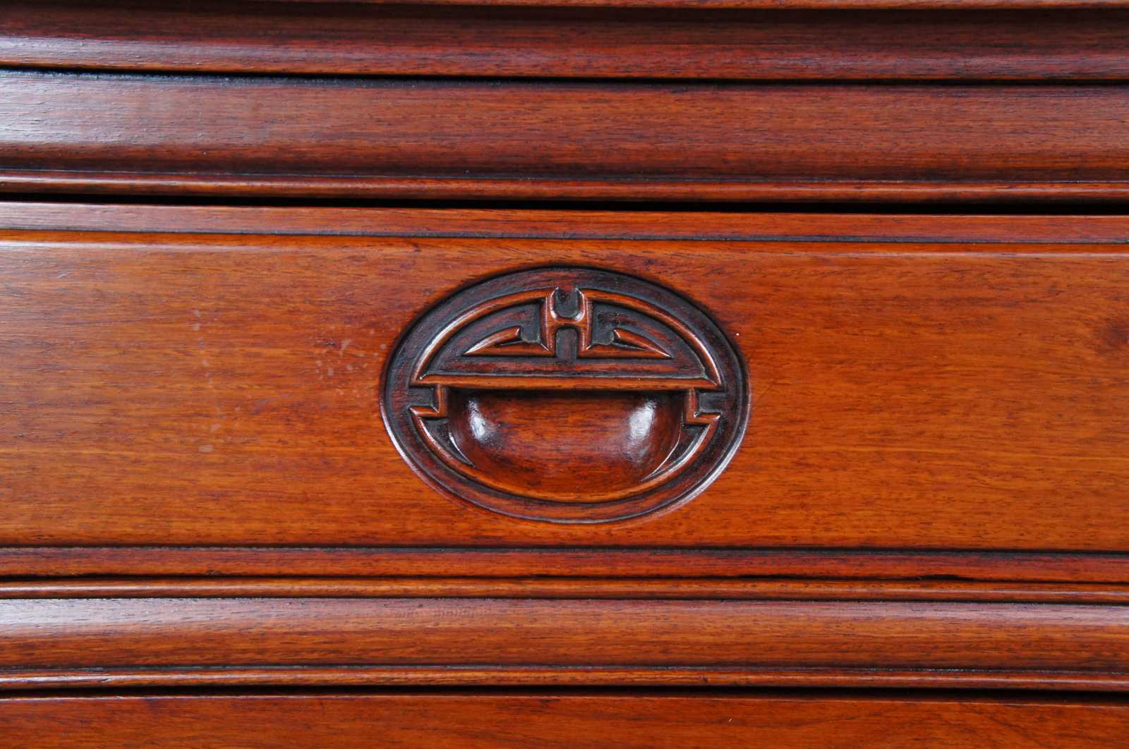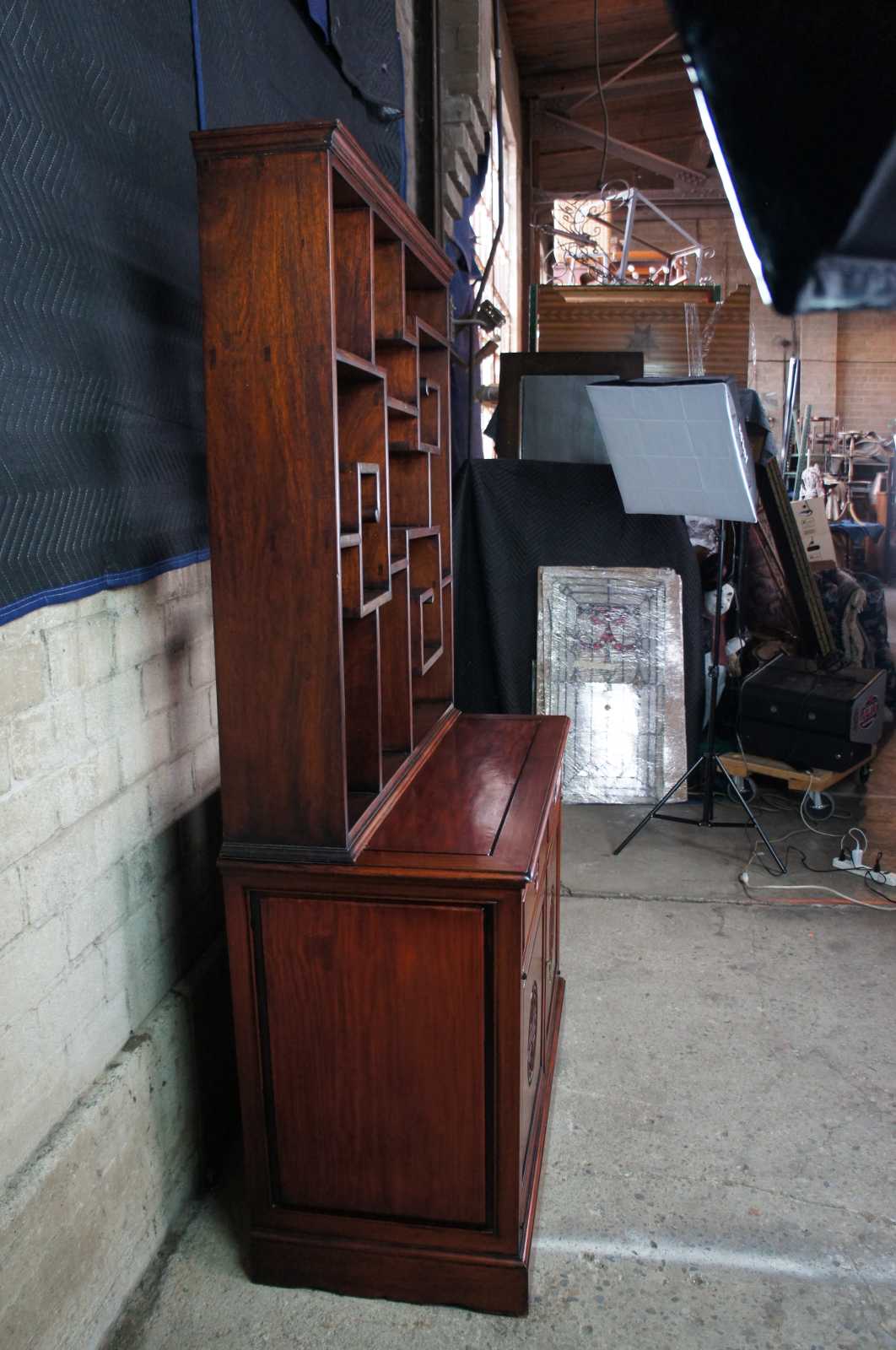 Antique Chinese Chinoiserie Ming Rosewood etagere cabinet. Made of solid rosewood featuring tiered upper bookcase curio shelving with two lower drawers and one cabinet.