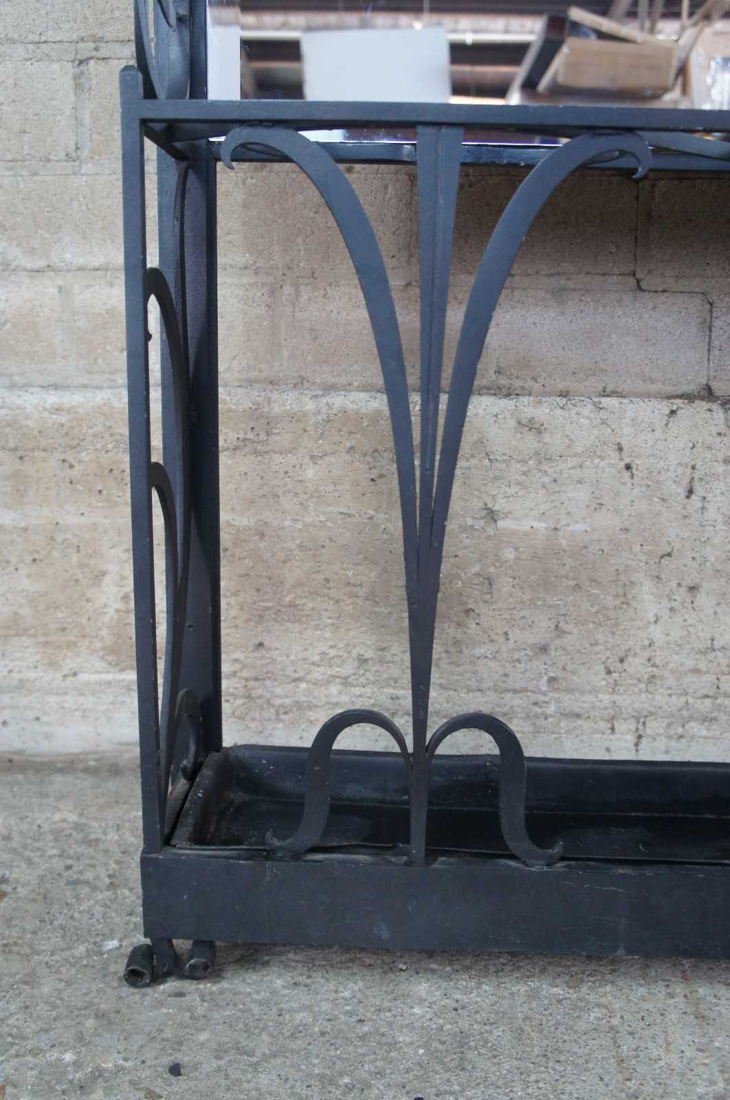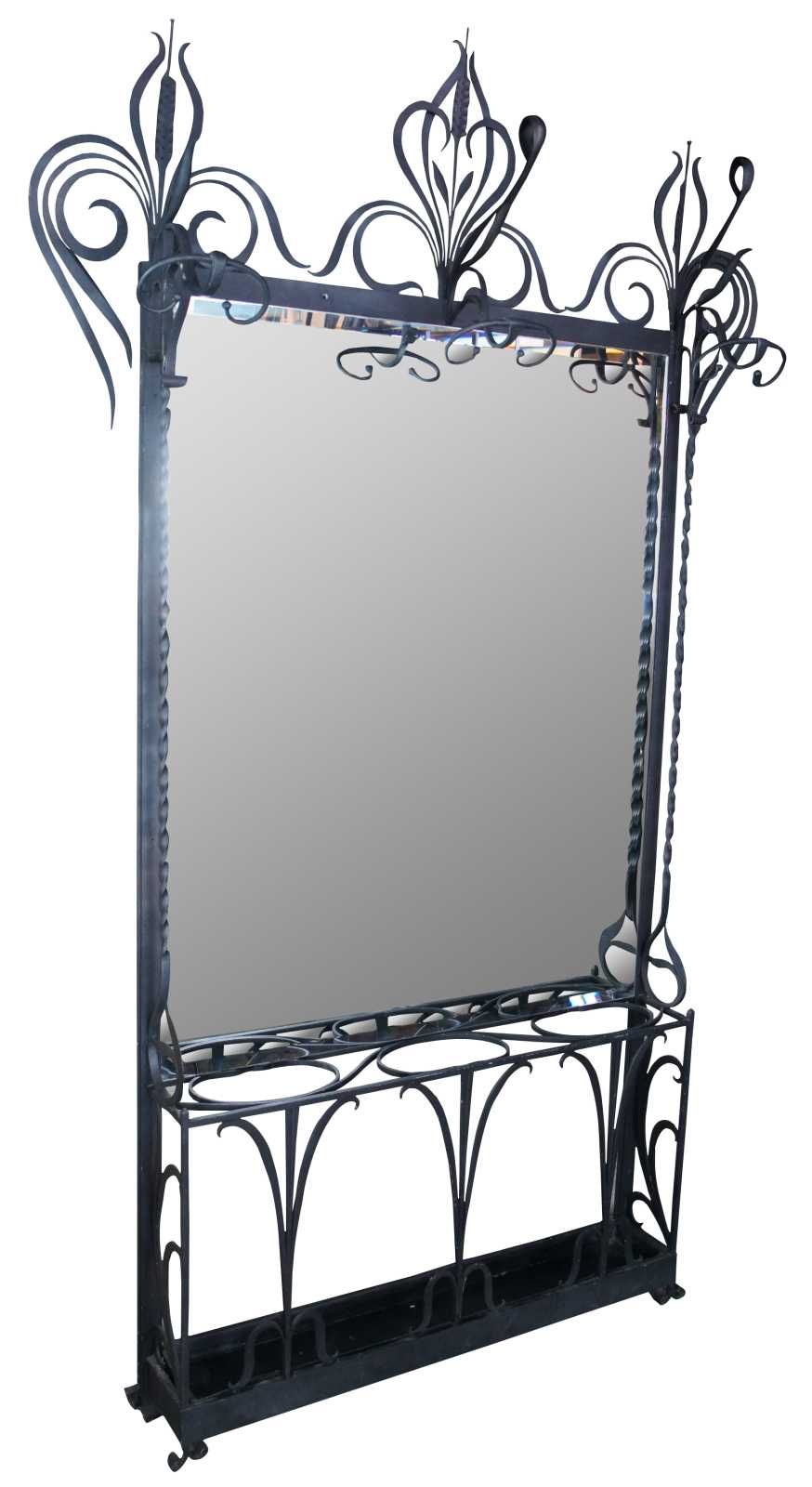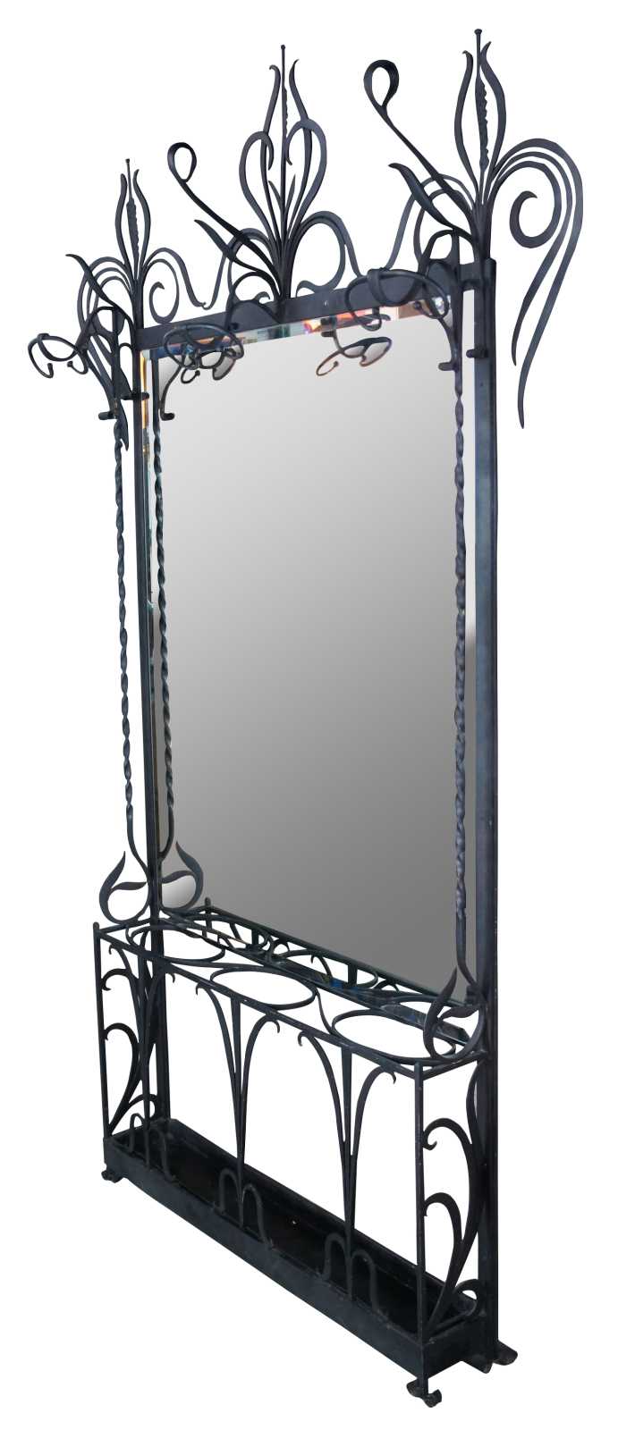 Monumental French hall tree, coat rack or umbrella / cane stand. Made of wrought iron featuring a sleek low profile with scrolled and twisted accents, large beveled mirror, and multiple areas for storage and hanging.