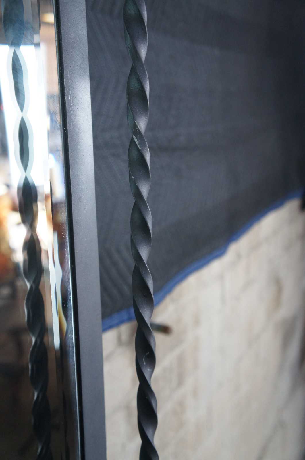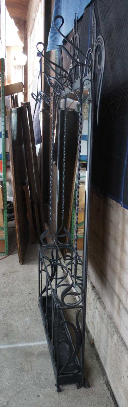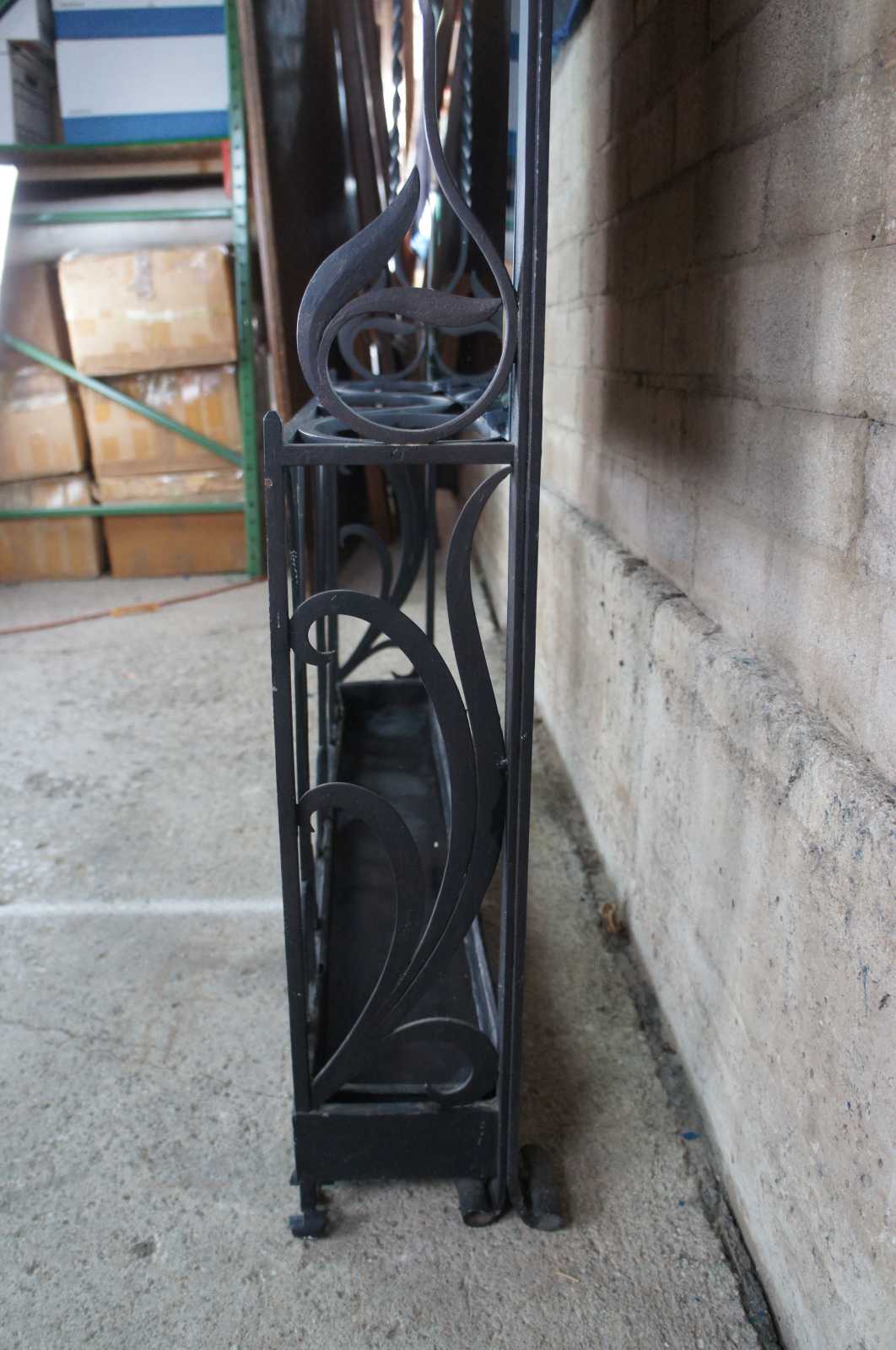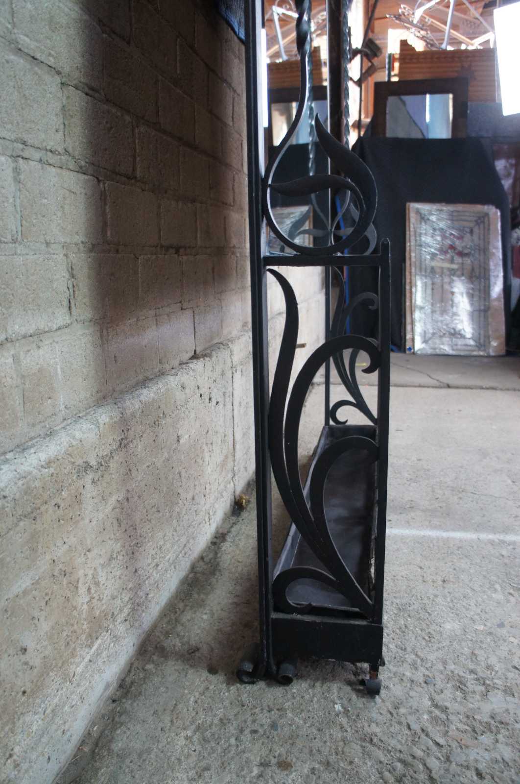 Monumental French hall tree, coat rack or umbrella / cane stand. Made of wrought iron featuring a sleek low profile with scrolled and twisted accents, large beveled mirror, and multiple areas for storage and hanging.