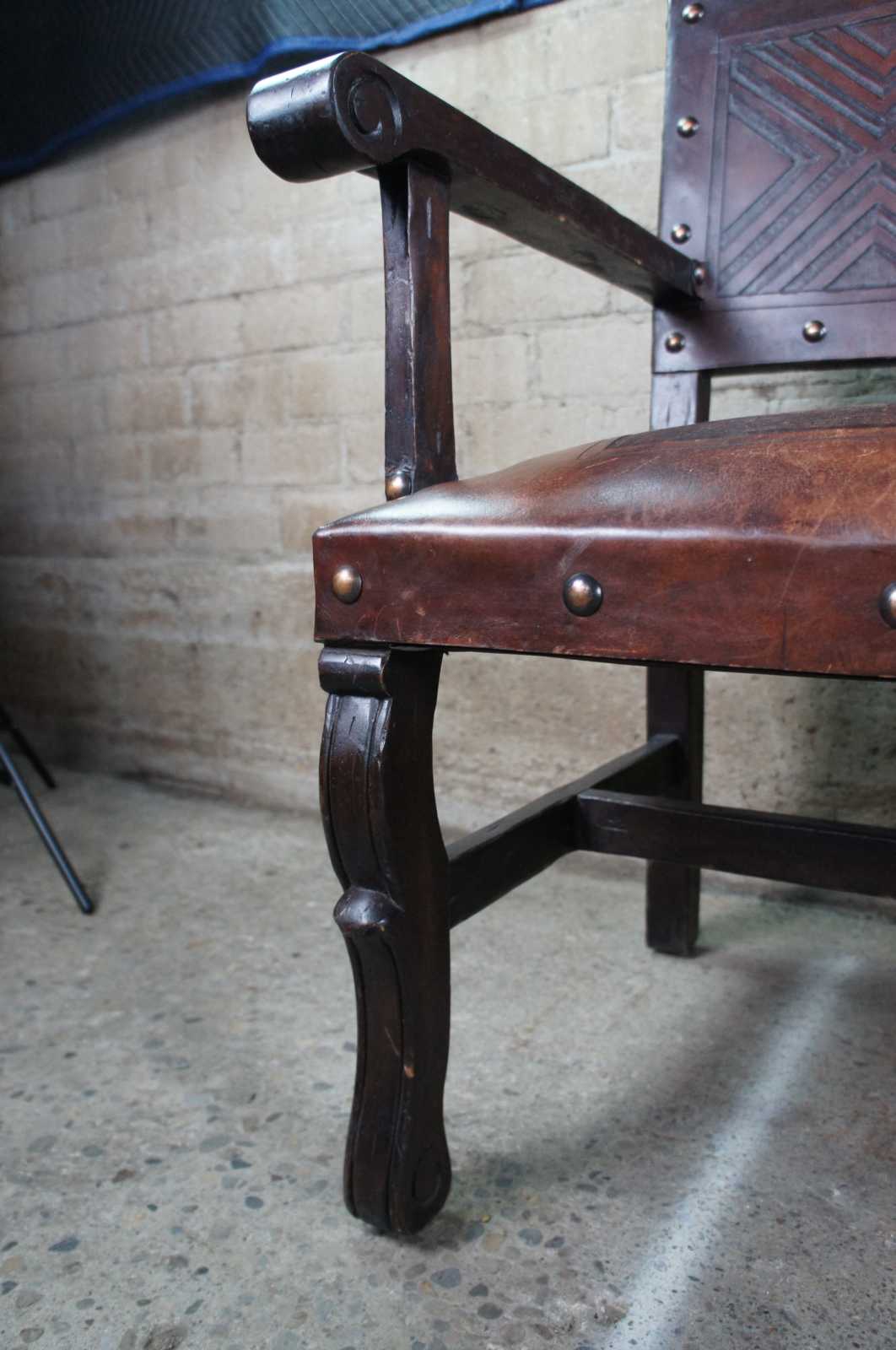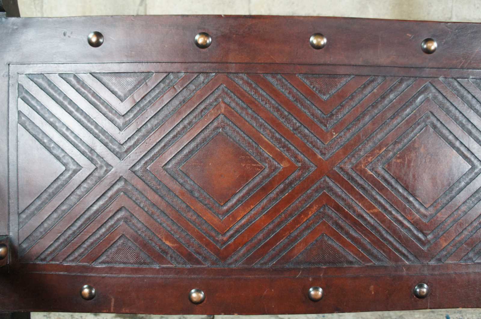 Vintage Spanish Heritage tooled leather bench featuring geometric diamond and nailhead design.