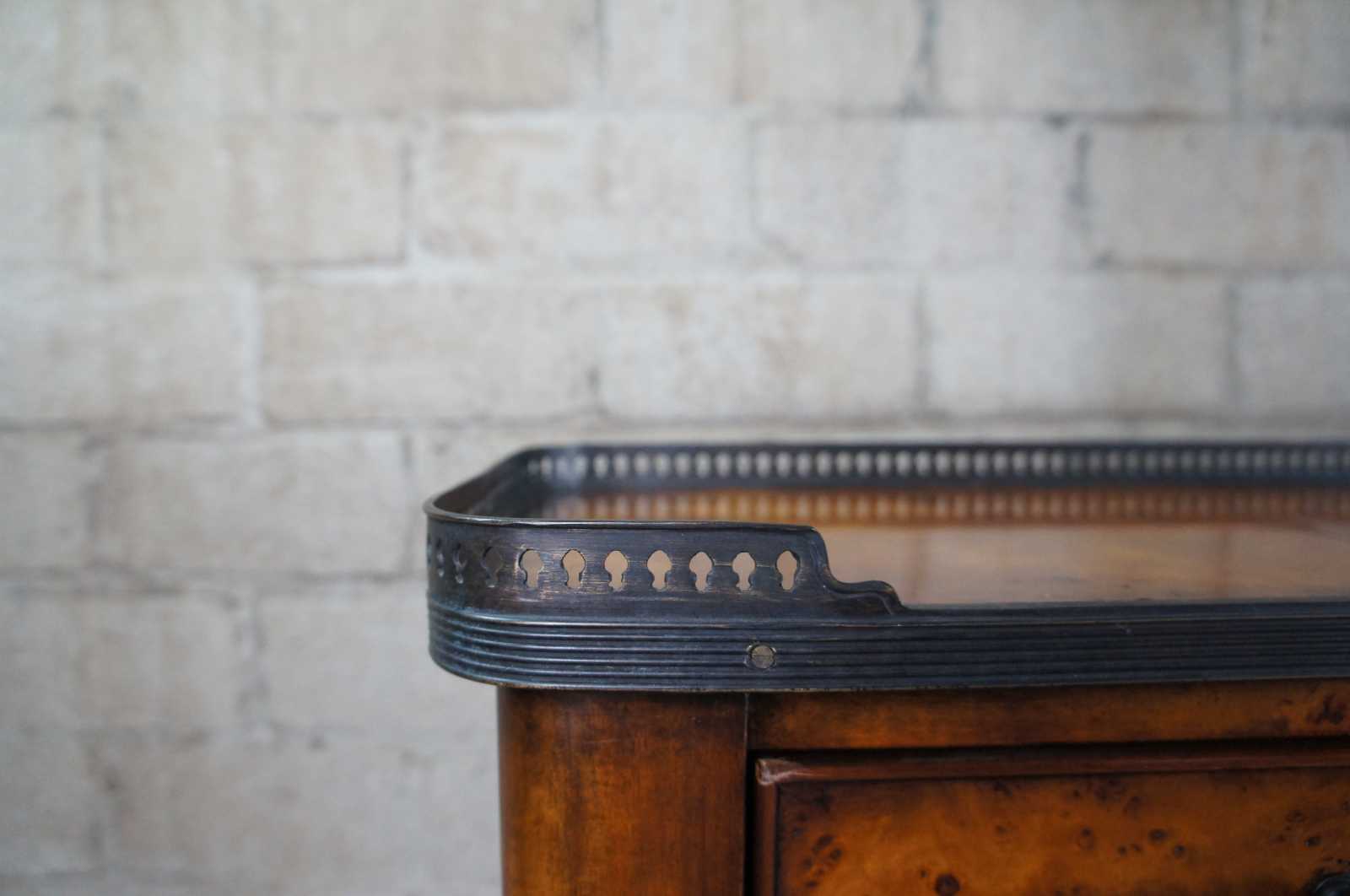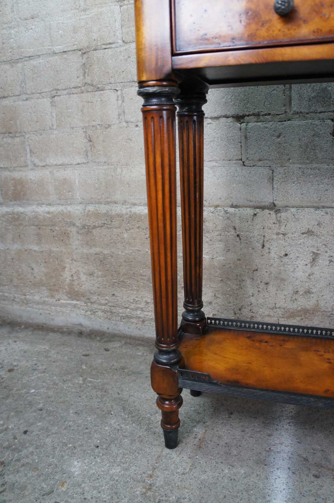 Vintage Theodore Alexander Louis XV style console or sideboard table featuring rectangular form with a narrow profile. The burl veneer and acacia console table has rounded corners and a brass gallery, above four frieze drawers, supported on six turned and fluted legs joined by a galleried undertier, on block and turned peg legs terminating in brass cappings.