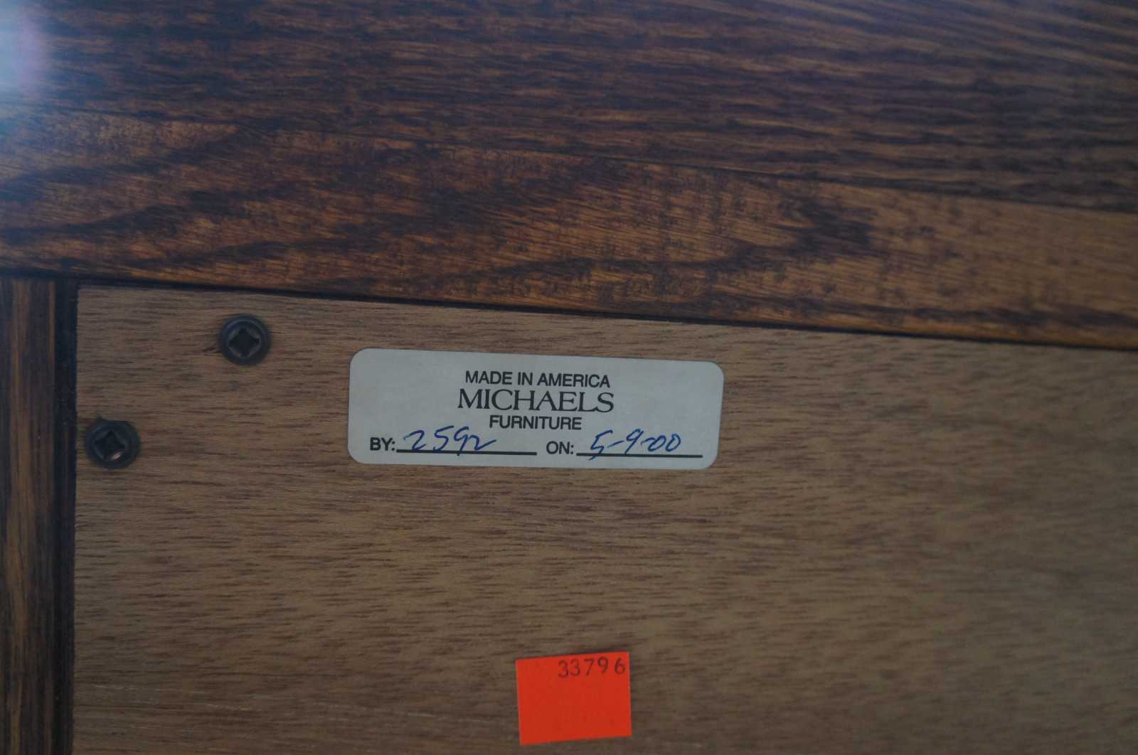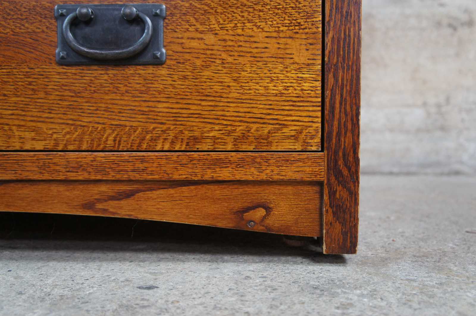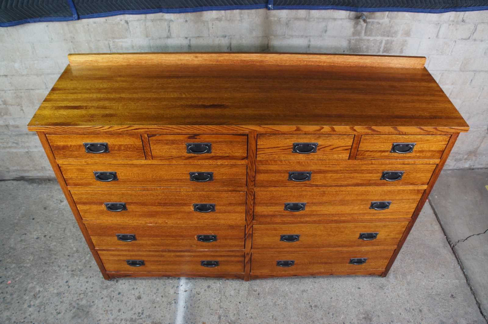 Vintage American made Amish mule style chest or double dresser. Made of quartersawn oak featuring mission styling with twelve drawers, paneled sides, and iron hardware. Michaels / Bungalow / Trend Manor #3108 / Circa 2000.
