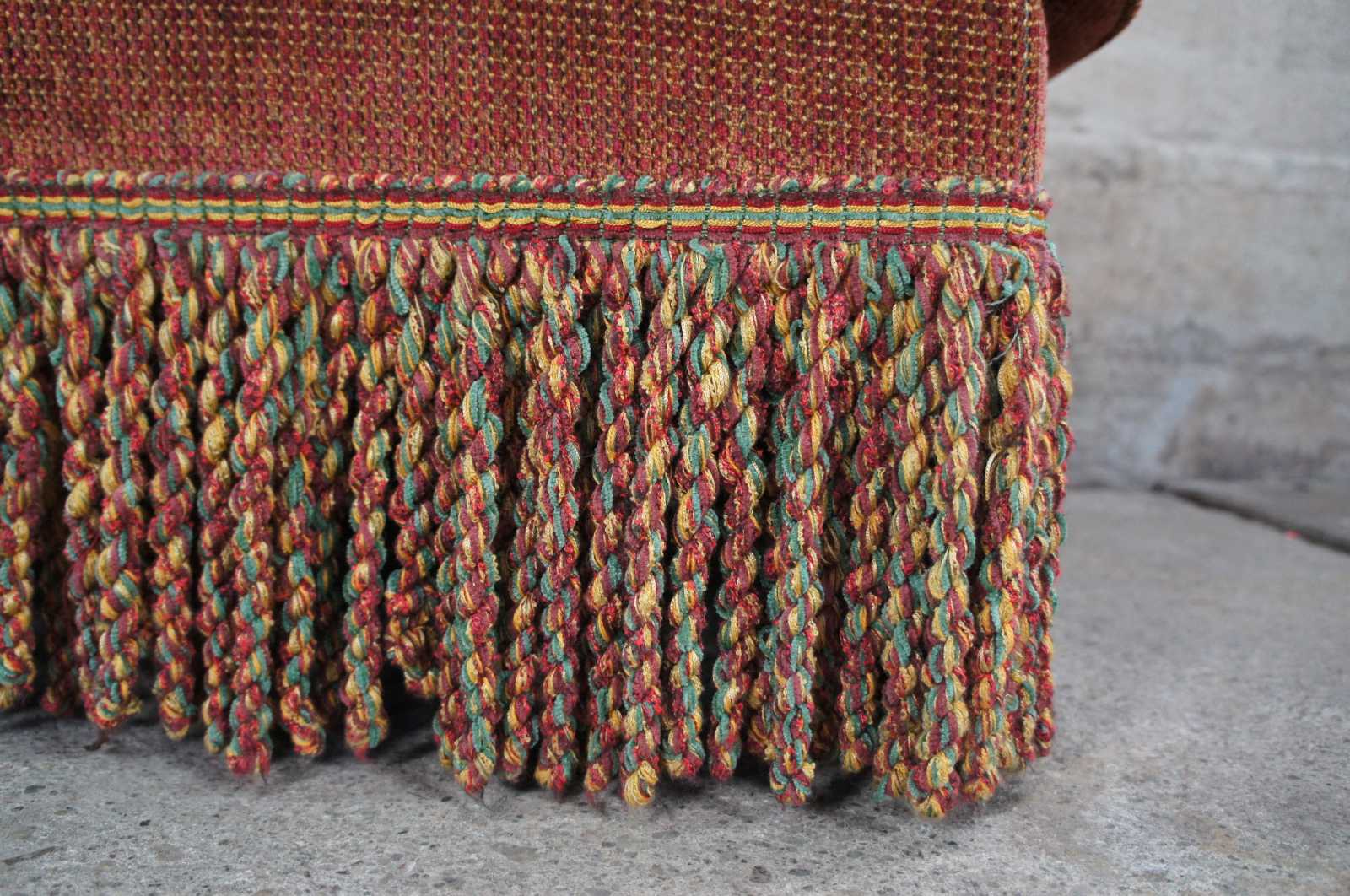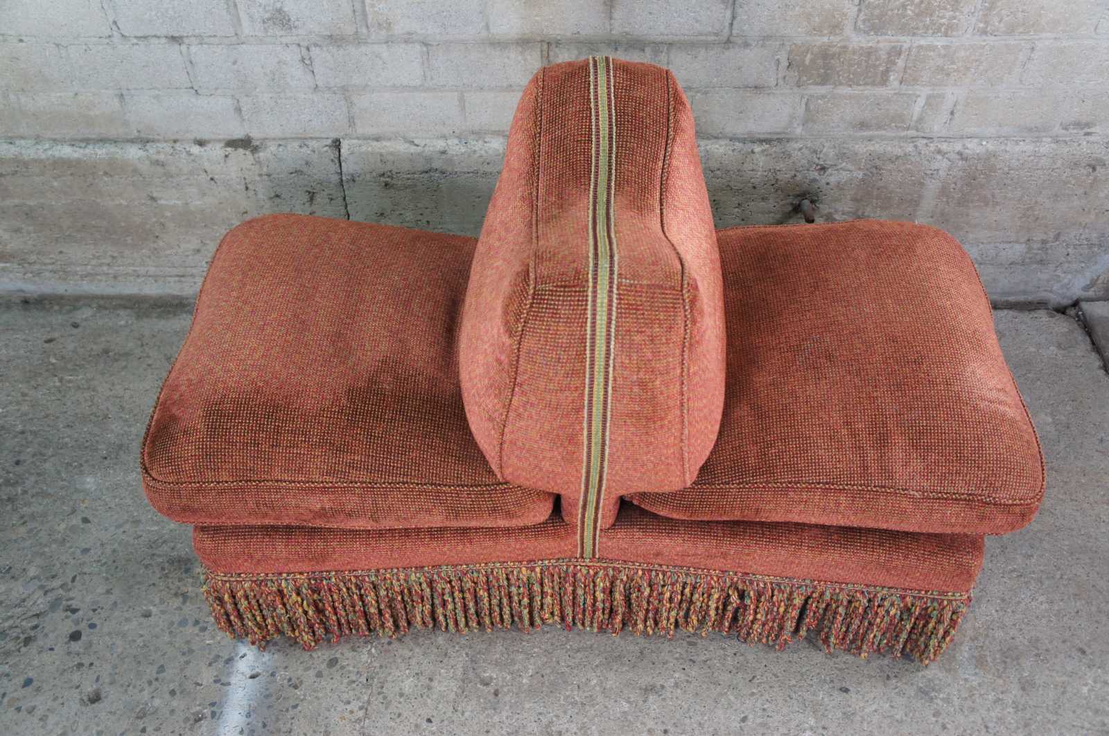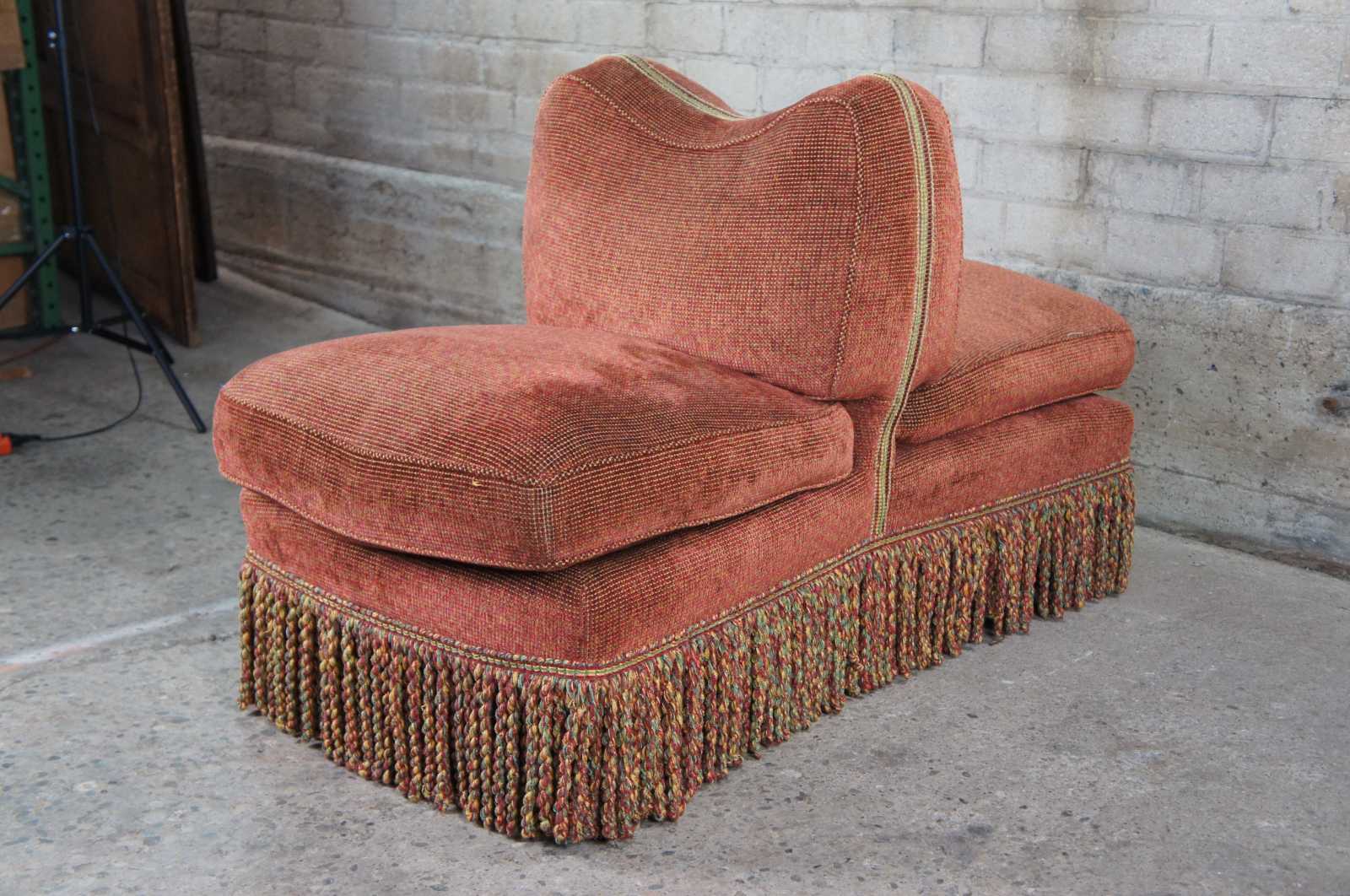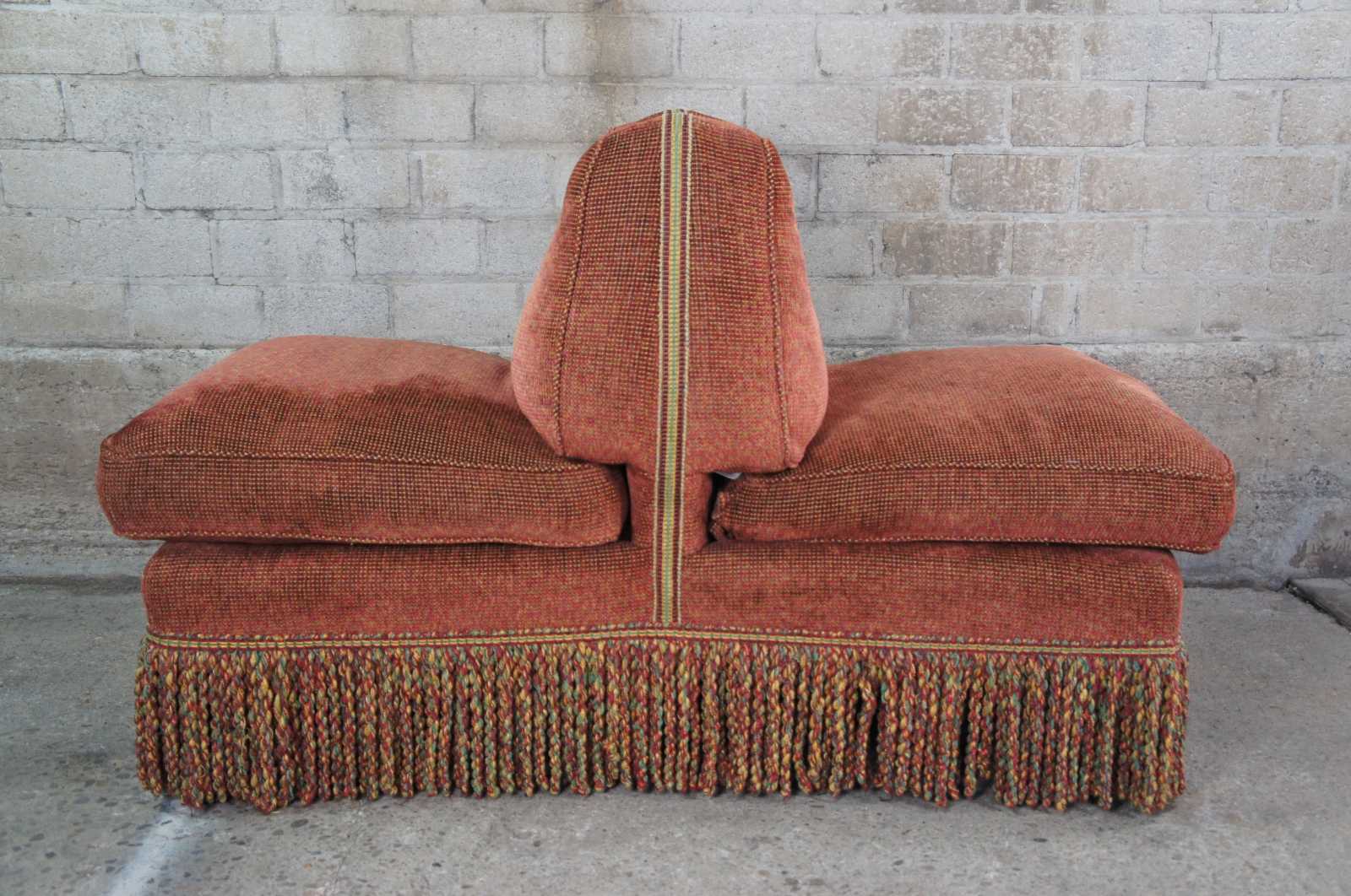 Vintage Scalamandre Tete-a-tete or settee bench chair. A unique duck down filled conversation seat featuring a sloped camelback, ornate twisted rope fringe and six legs with brass castors. Made in Hickory North Carolina, SL-3509.
