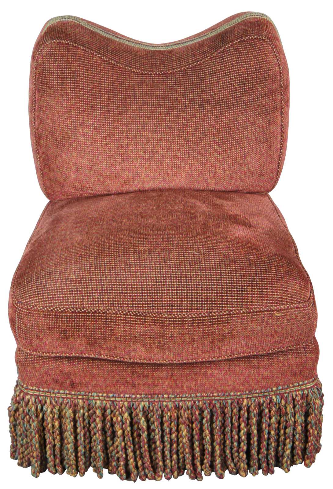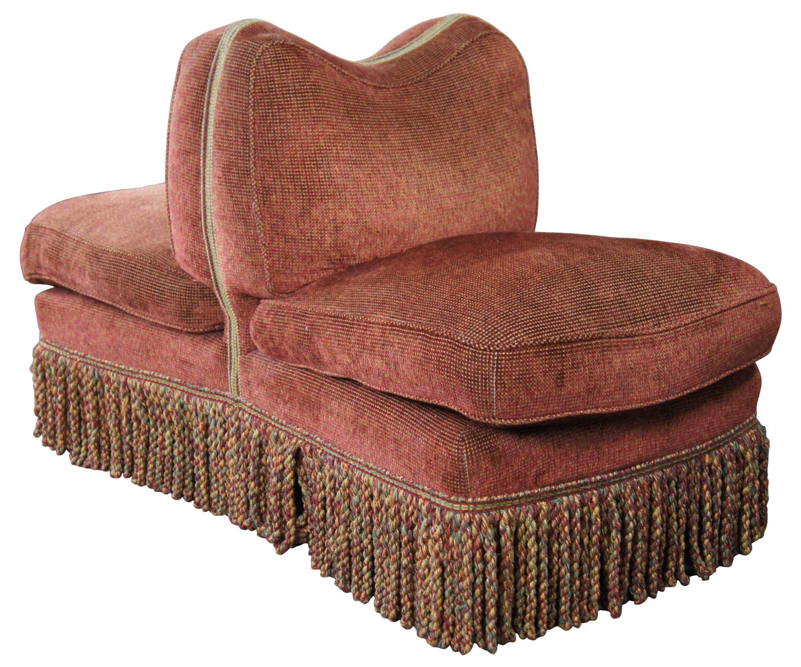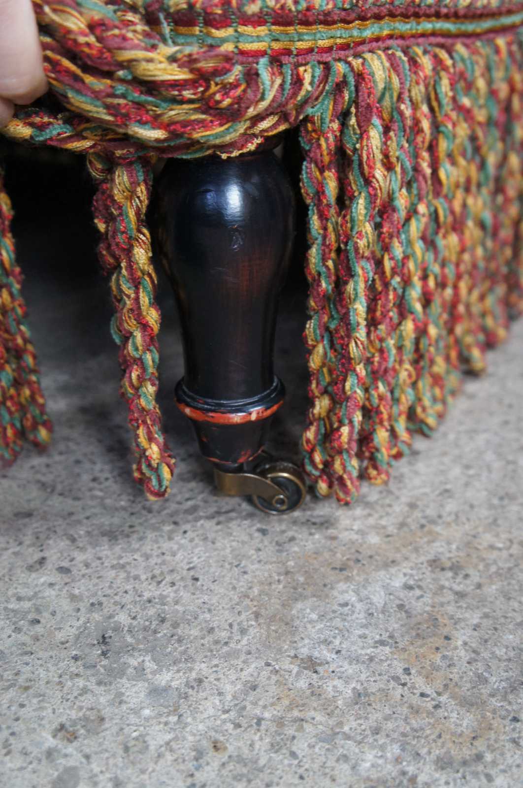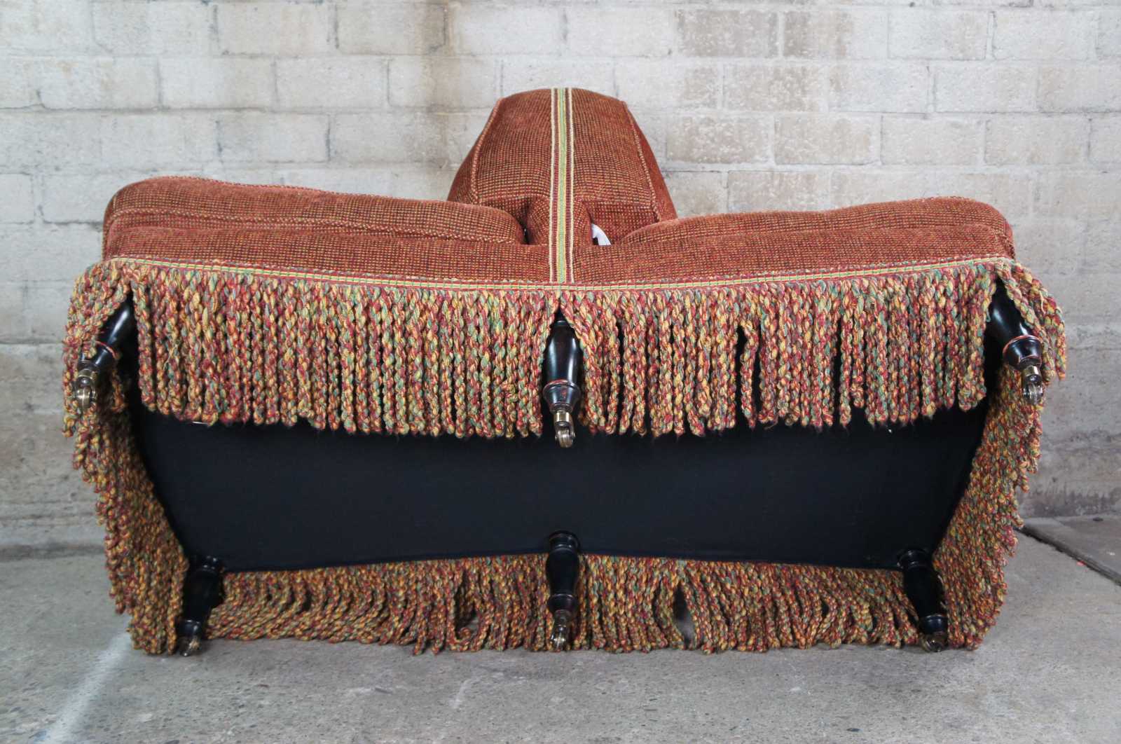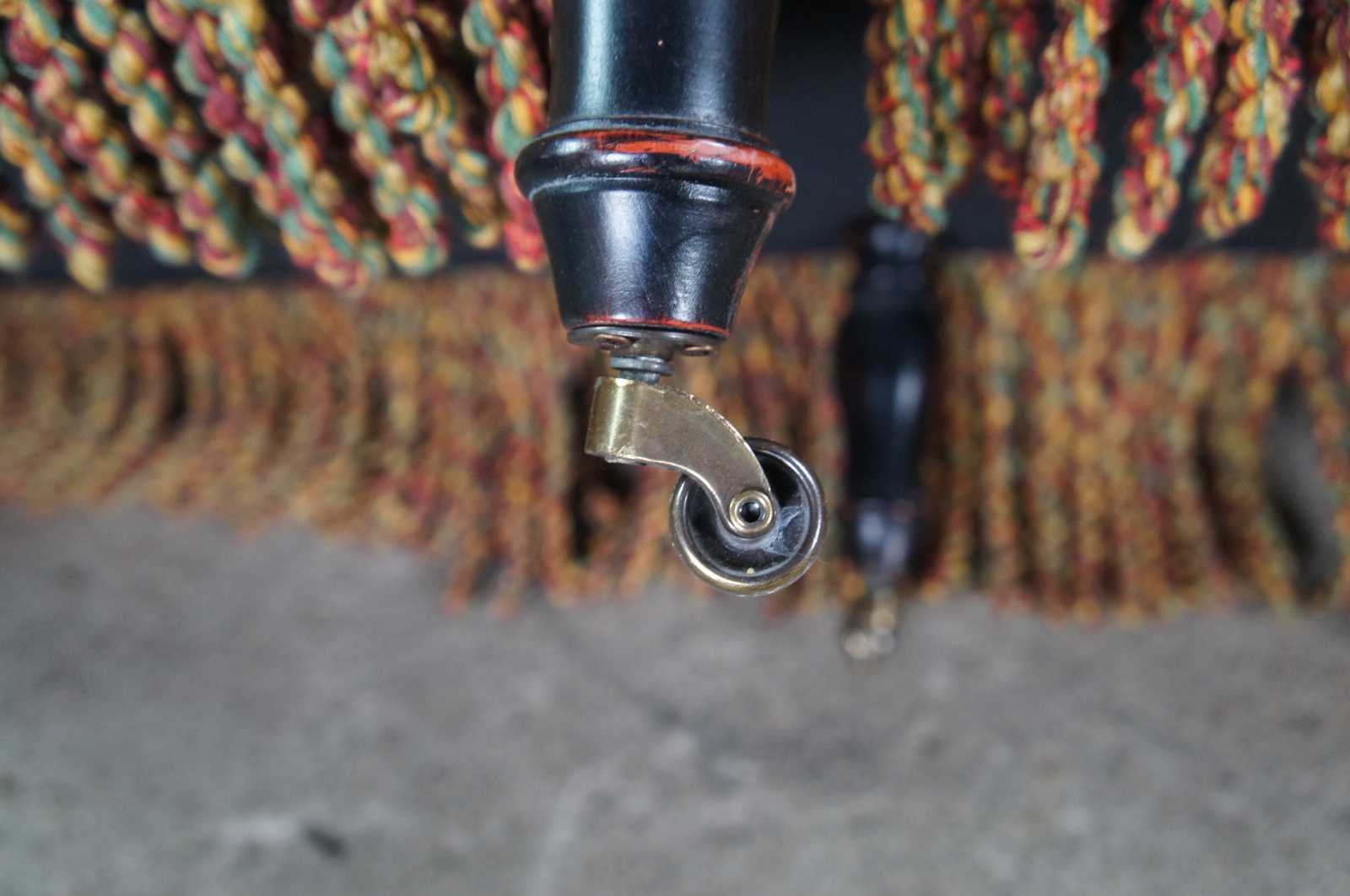 Vintage Scalamandre Tete-a-tete or settee bench chair. A unique duck down filled conversation seat featuring a sloped camelback, ornate twisted rope fringe and six legs with brass castors. Made in Hickory North Carolina, SL-3509.
