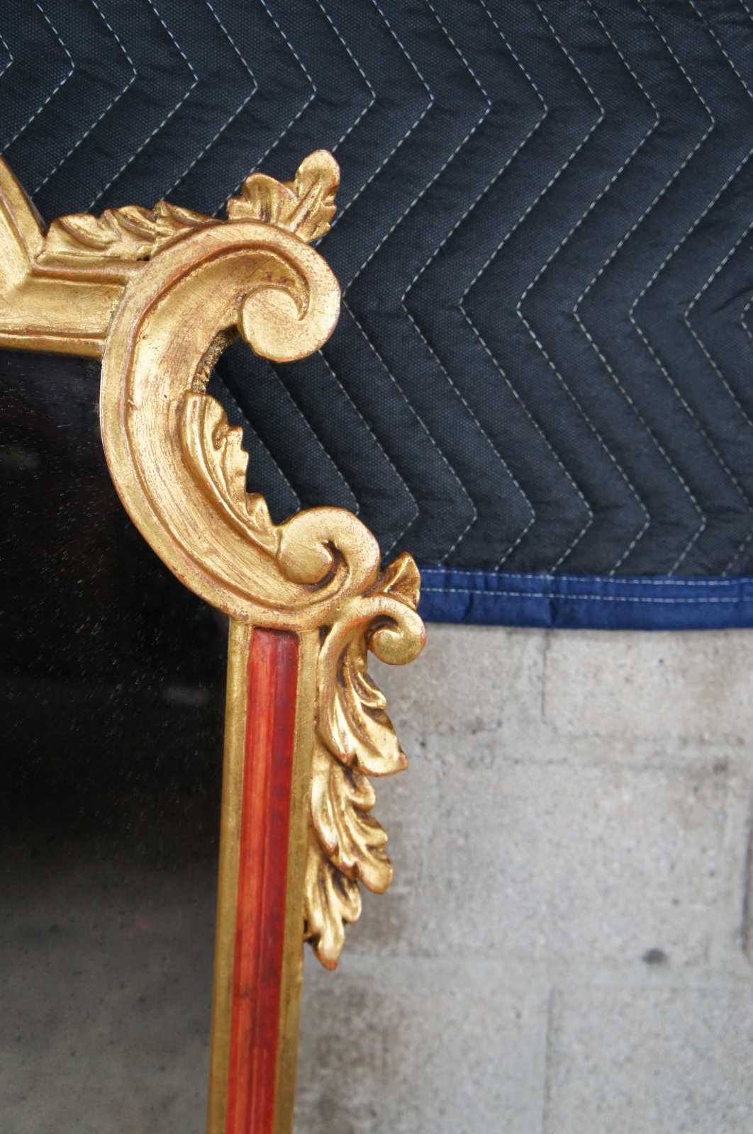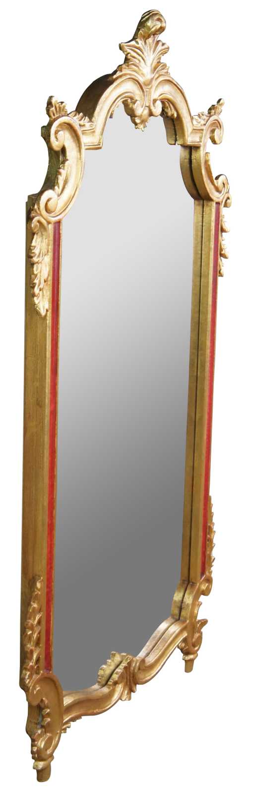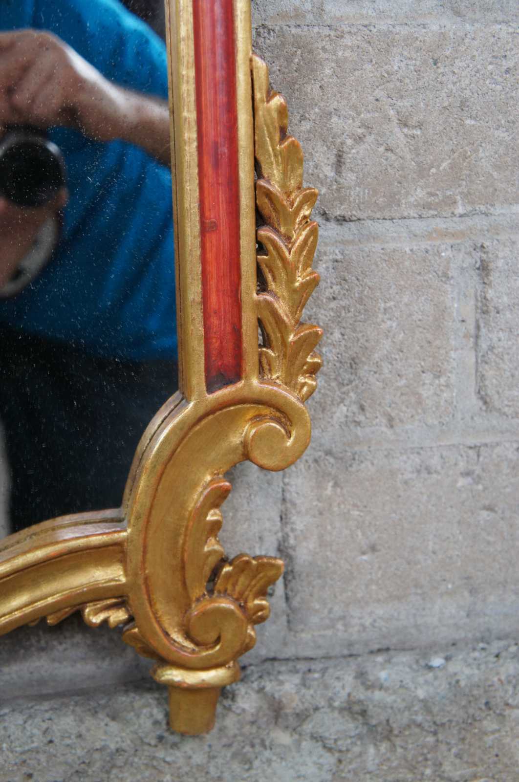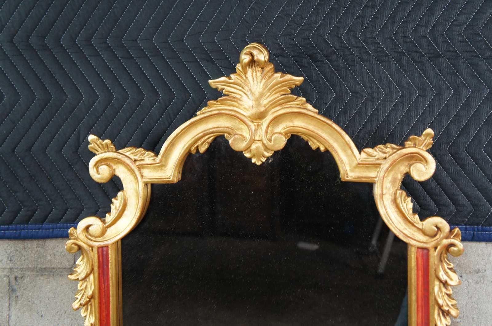 Vintage Italian Neoclassical wall vanity mirror featuring gilt wood with red accents and ornate acanthus motif. Made in Italy.