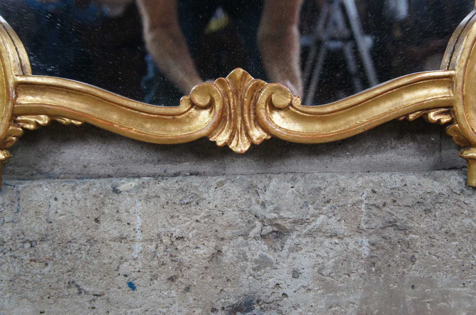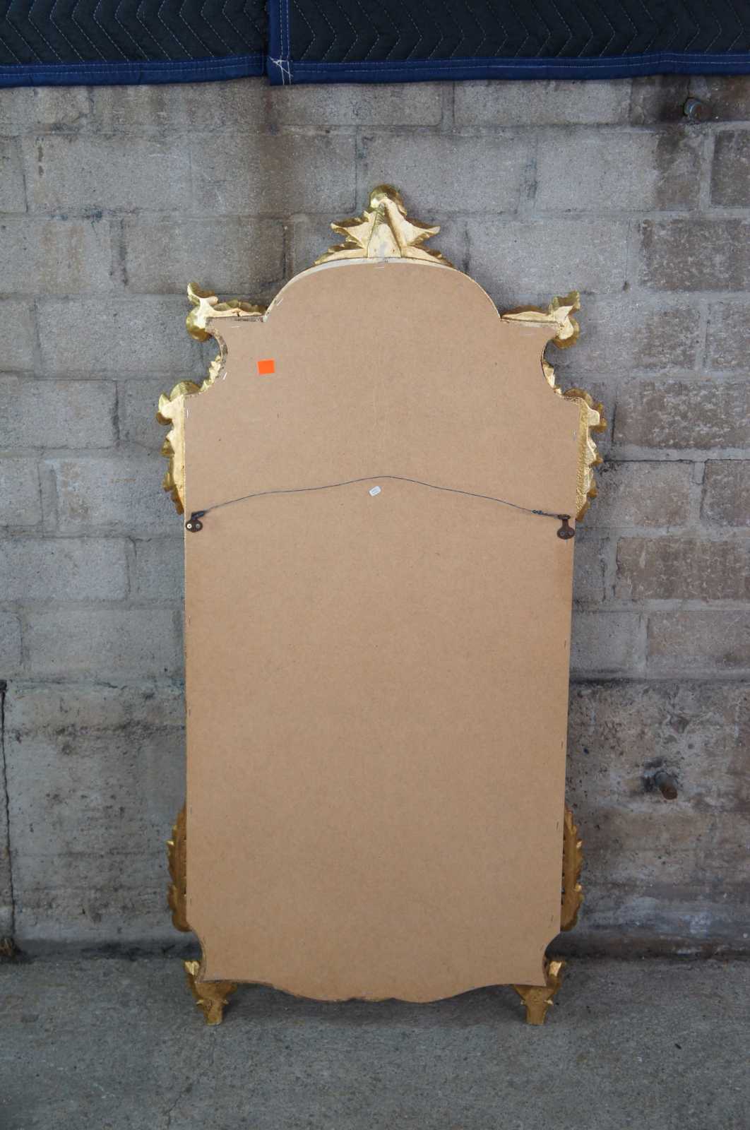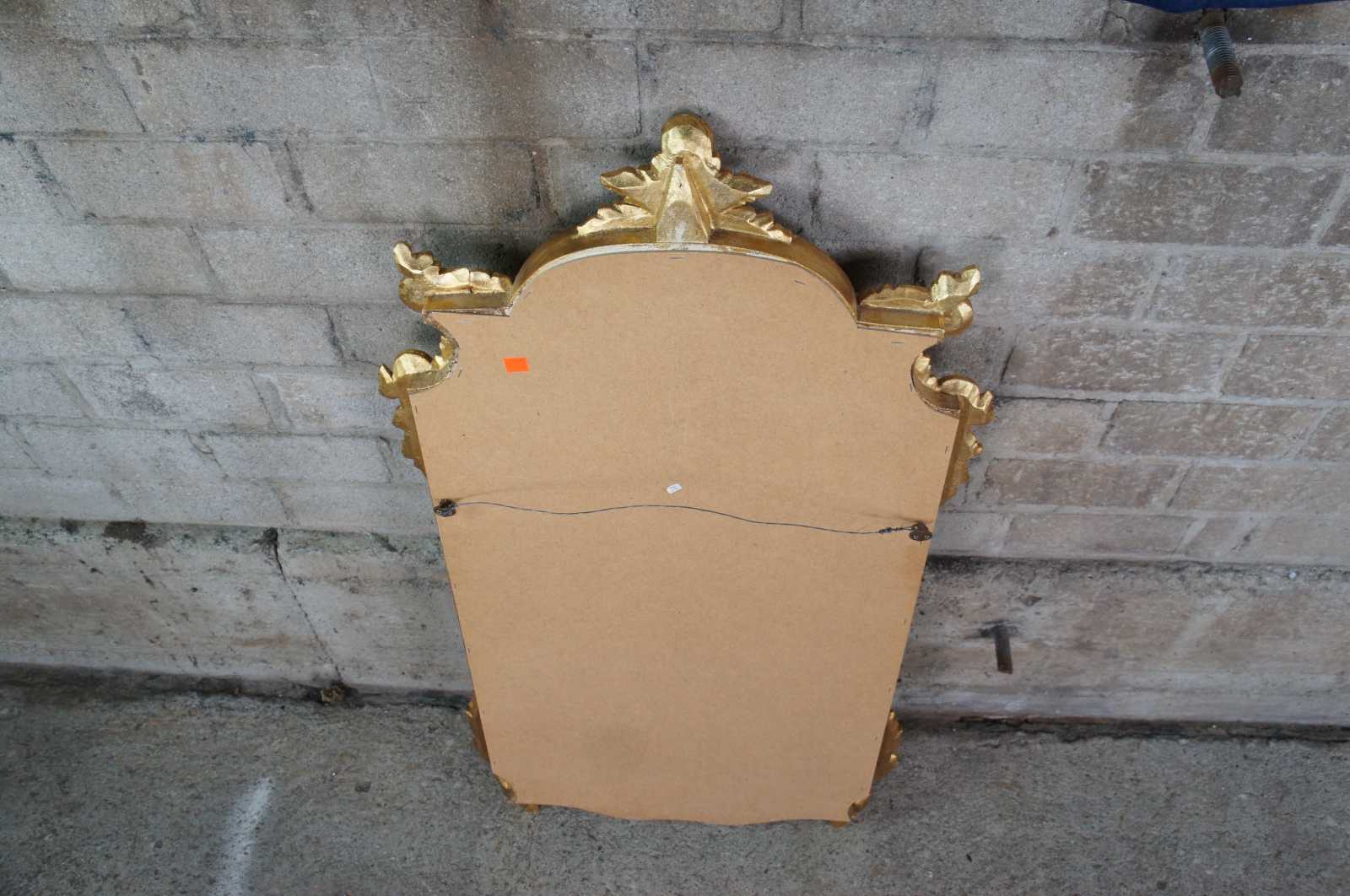 Vintage Italian Neoclassical wall vanity mirror featuring gilt wood with red accents and ornate acanthus motif. Made in Italy.