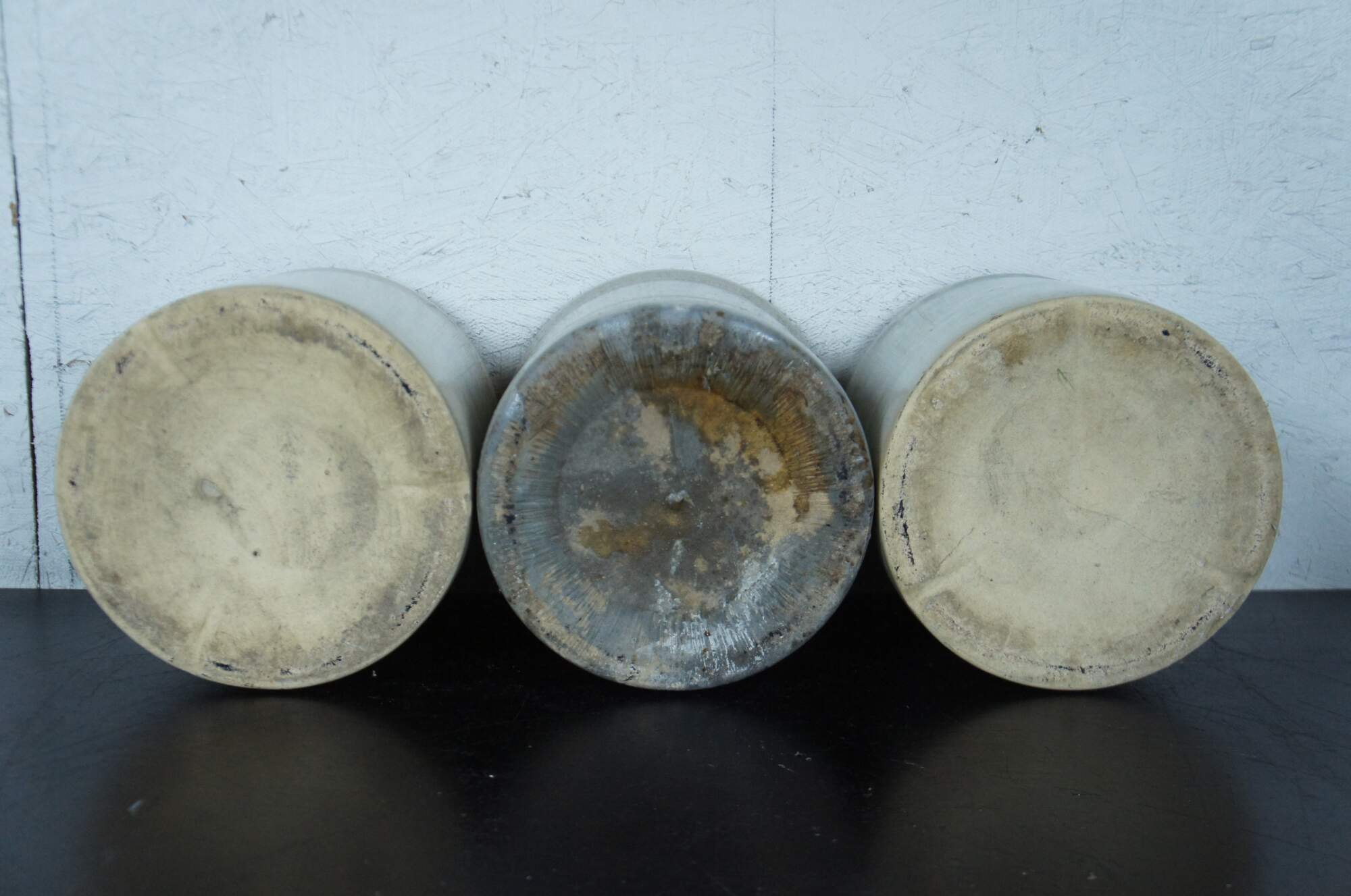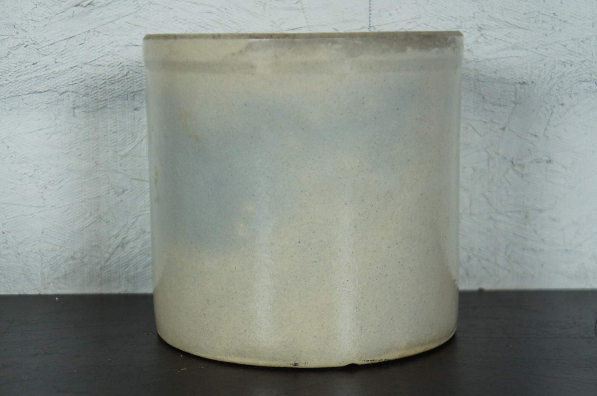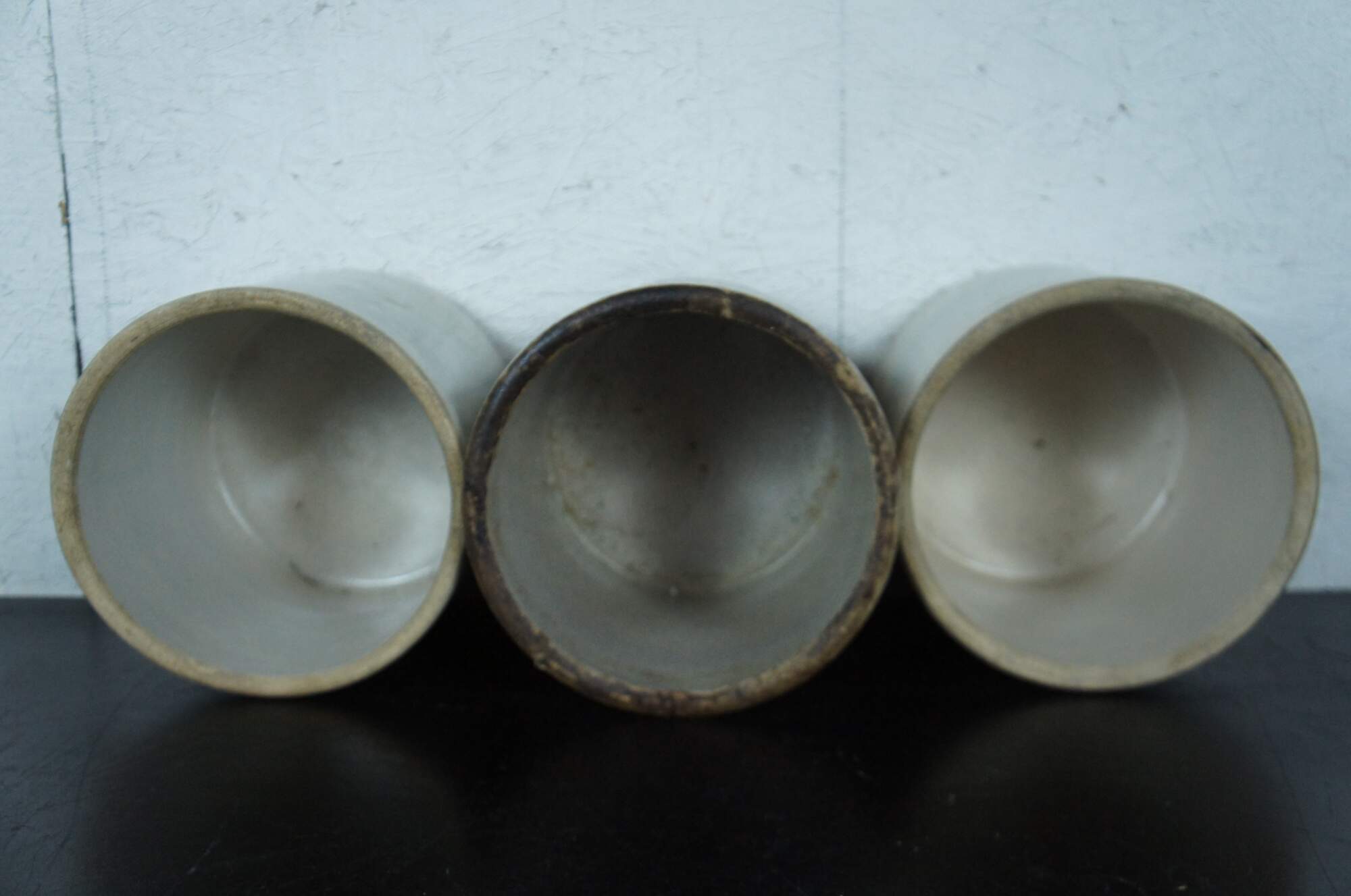 Lot of three antique unmarked plain salt glazed stoneware crocks; estimated 1 gallon capacity.