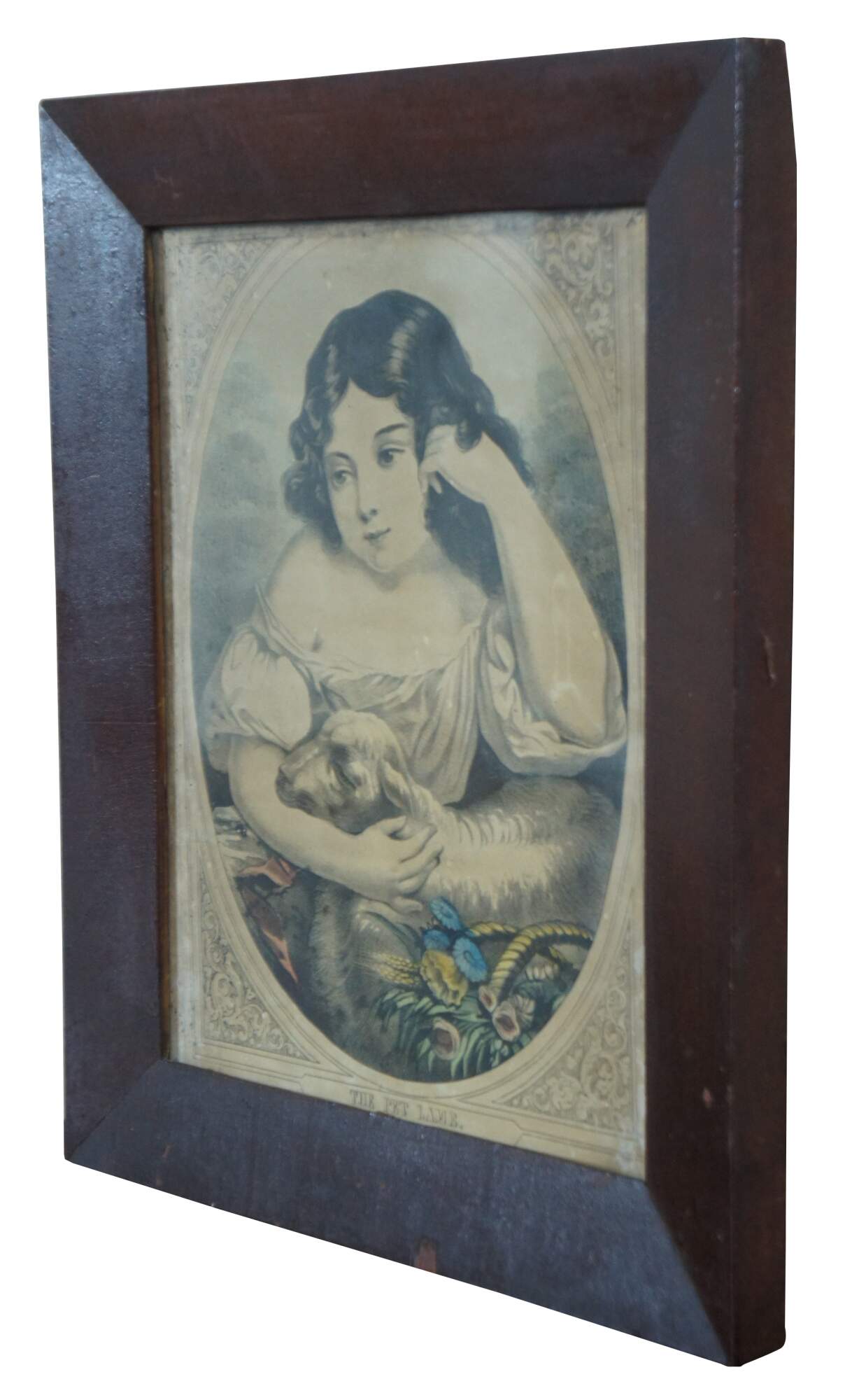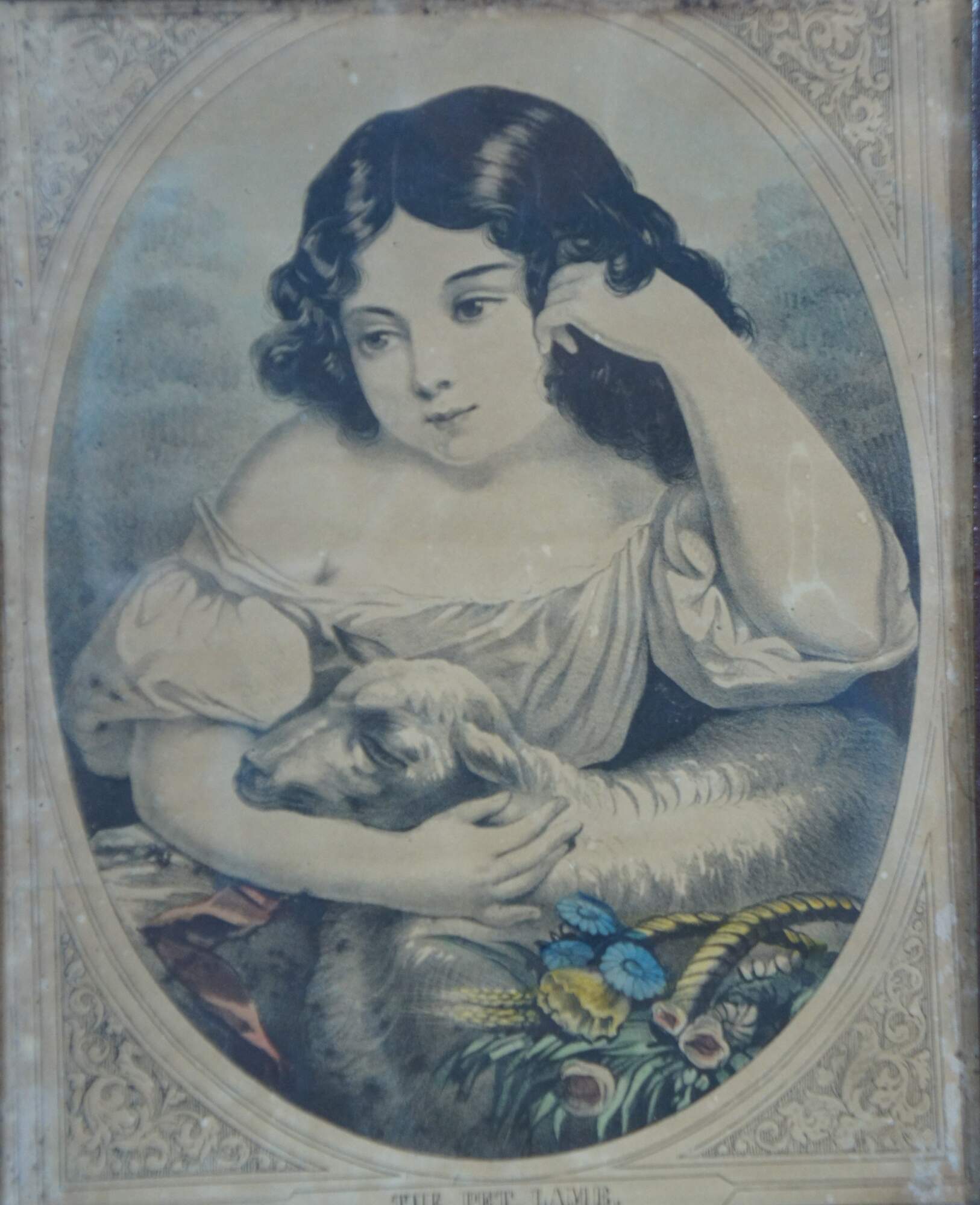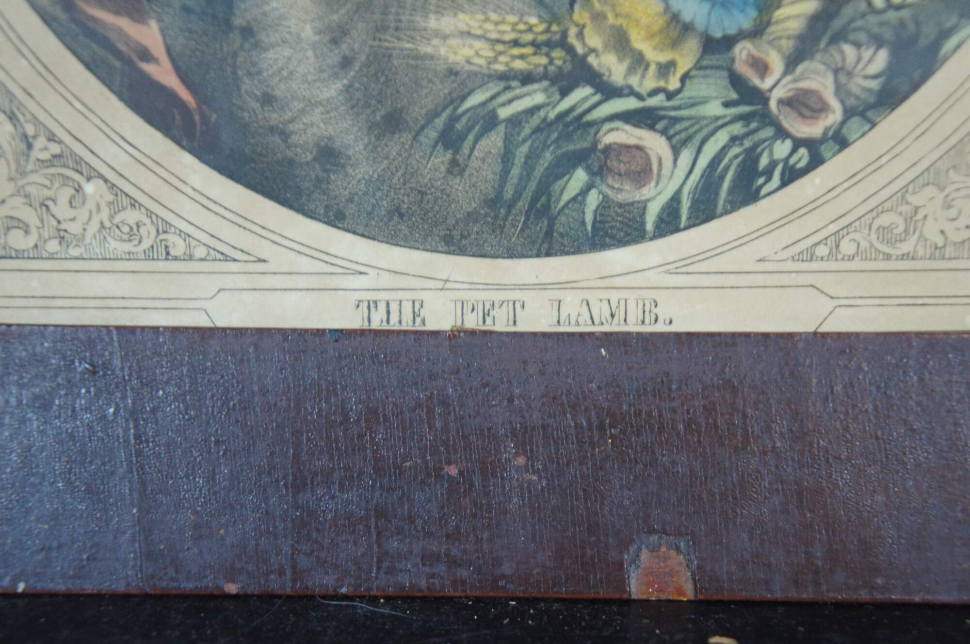 Antique 19th century Victorian partially colored lithograph print showing a young girl with her arm around a sheep and a basket of flowers, titled “The Pet Lamb.”