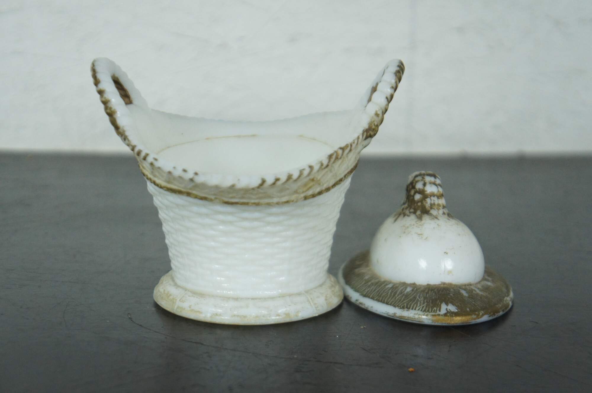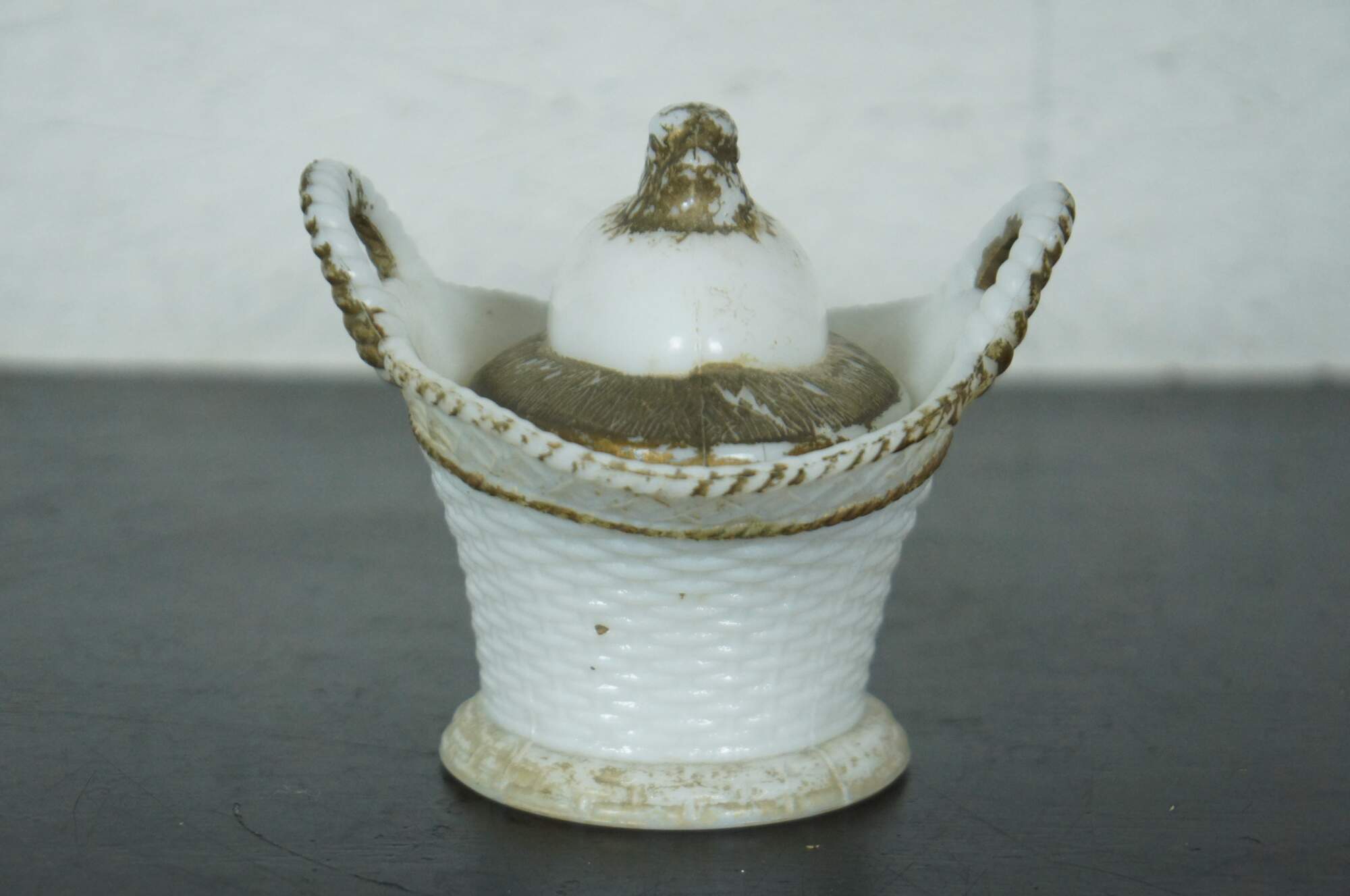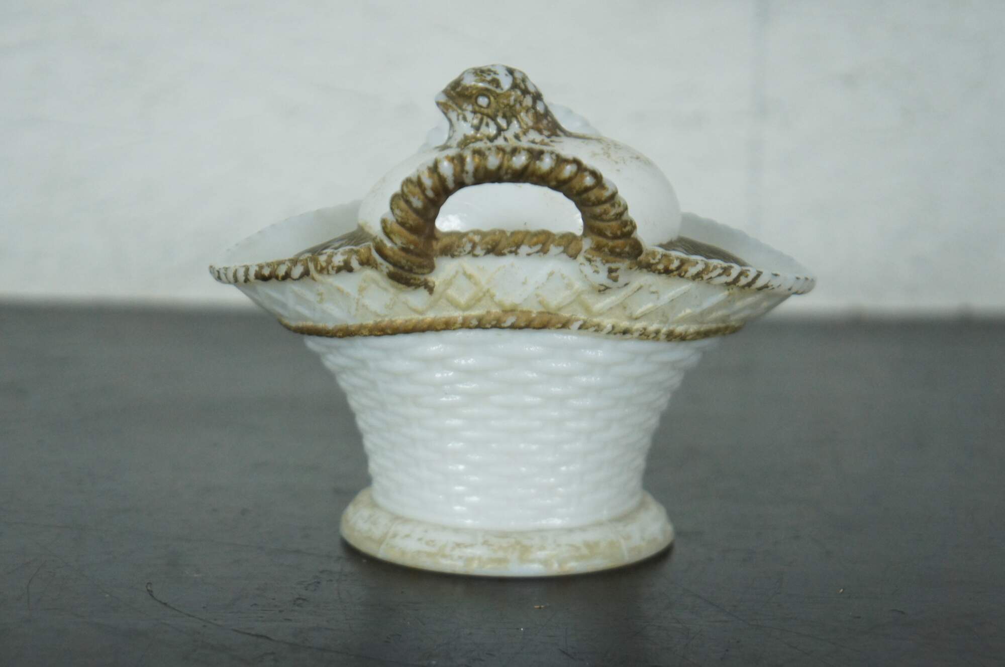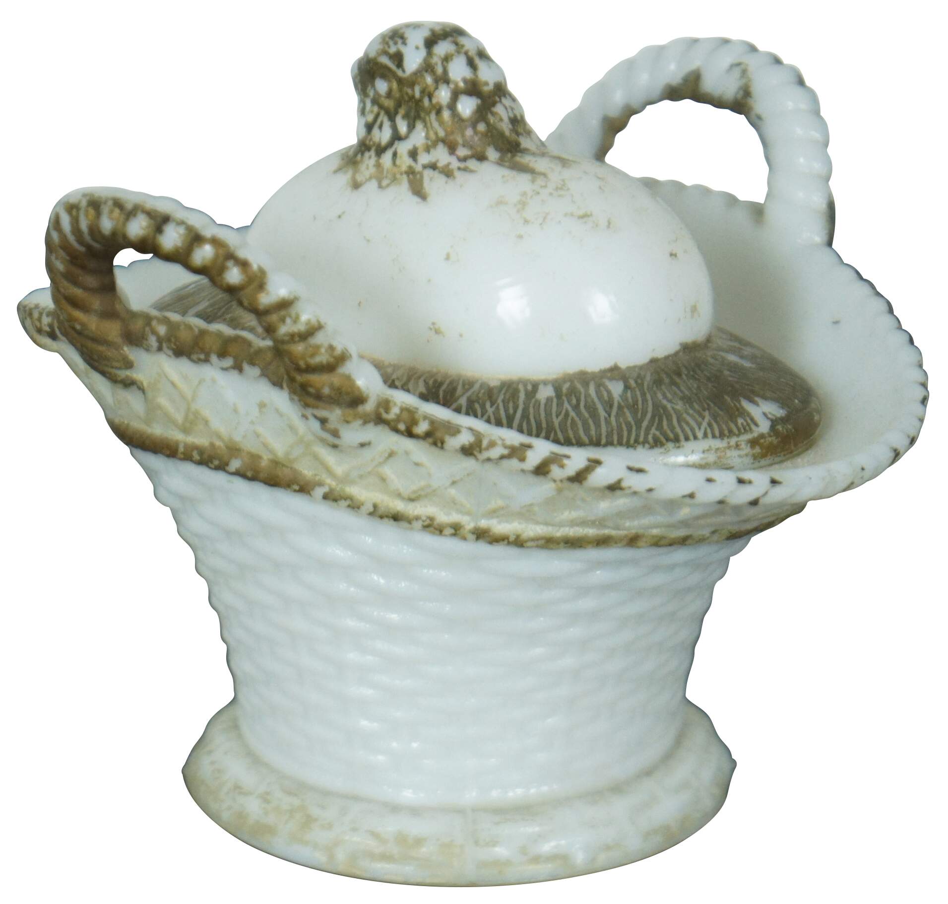Antique Victorian Westmoreland milk glass lidded candy dish shaped like a basket with a chick hatching from an egg nested inside it, accented with gold paint.