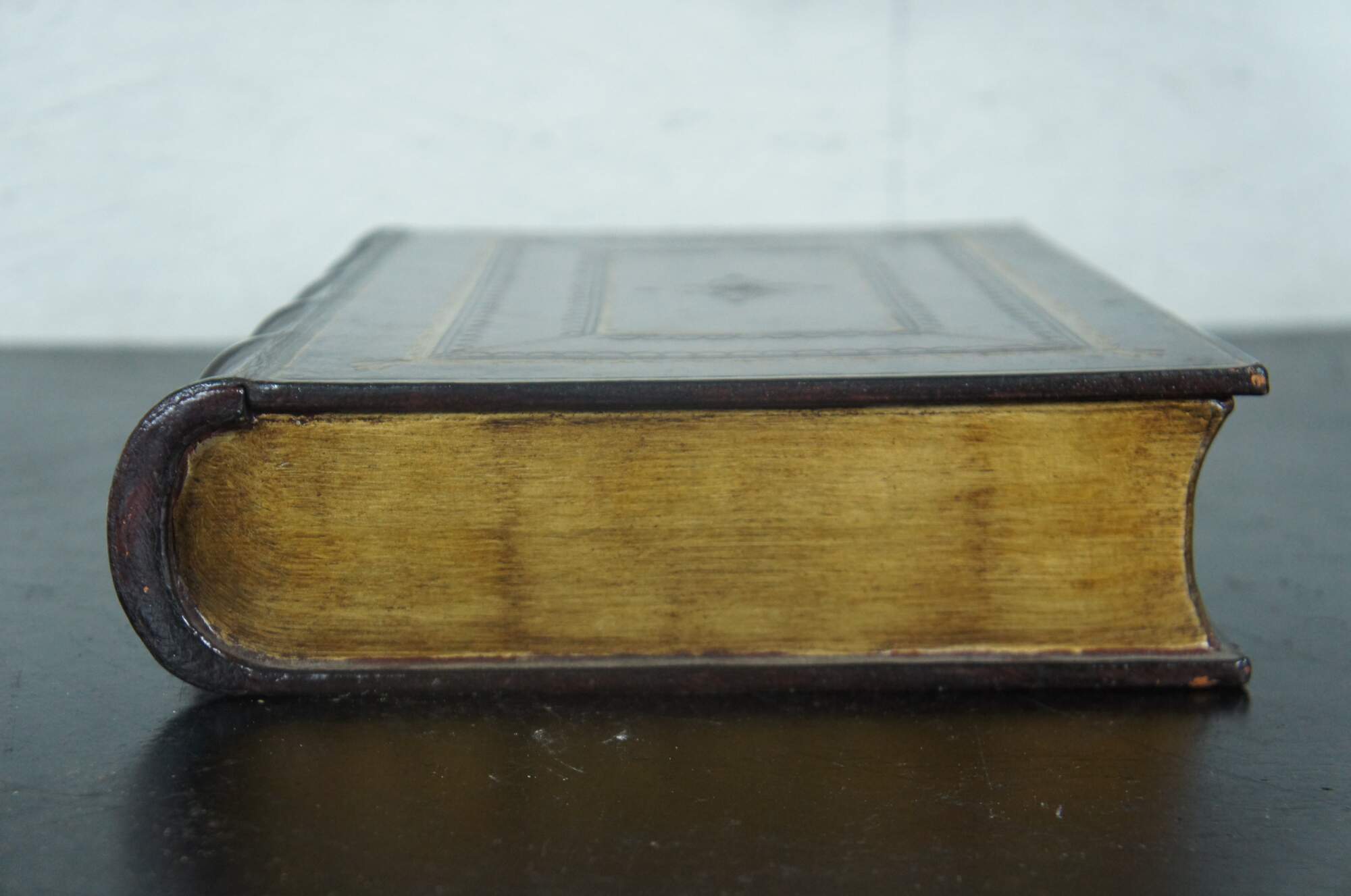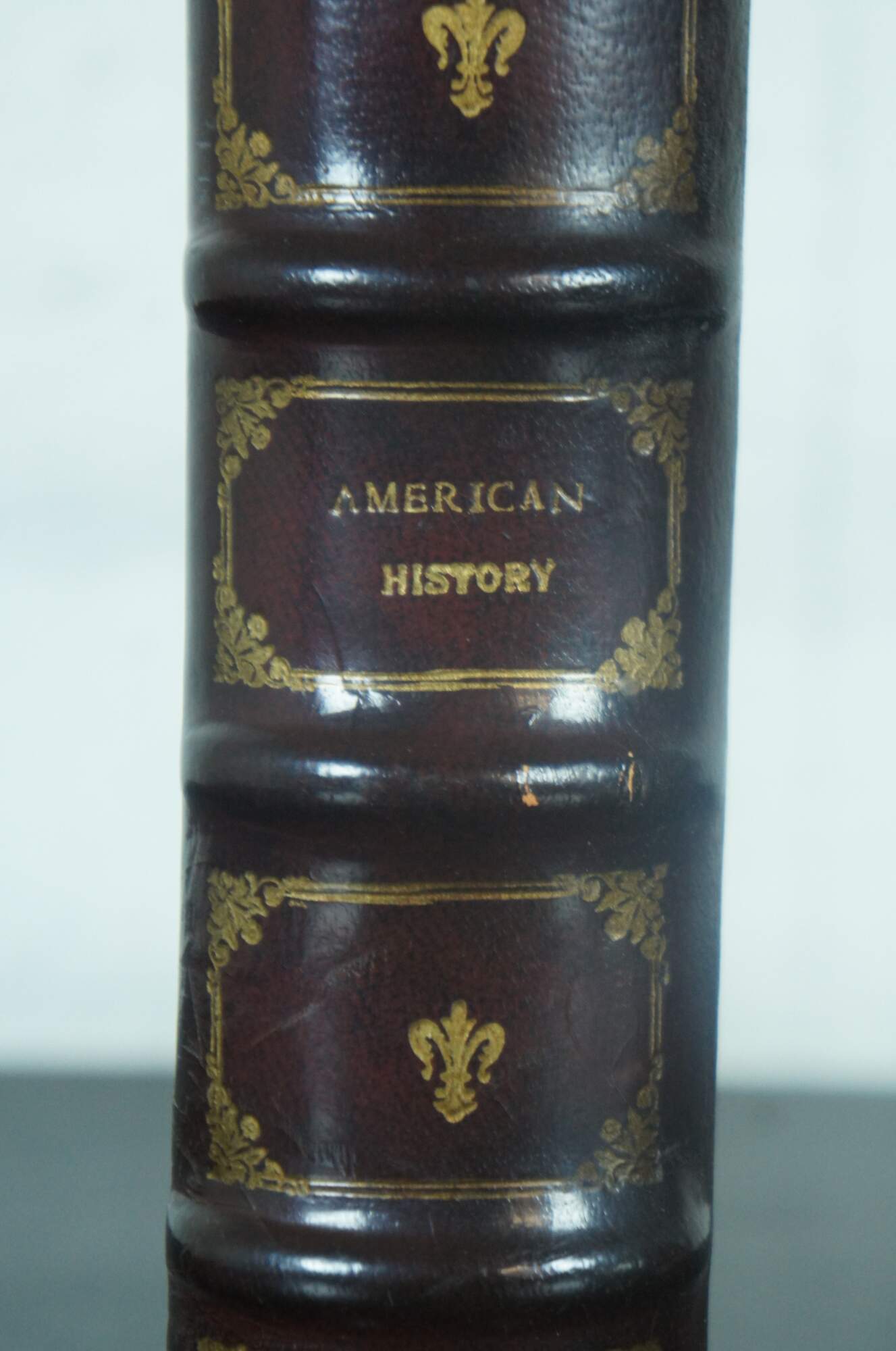 Faux book shaped trinket box finished in oxblood red tooled leather with gold accents and page edges; titled “American History.” attributed to Maitland Smith.
