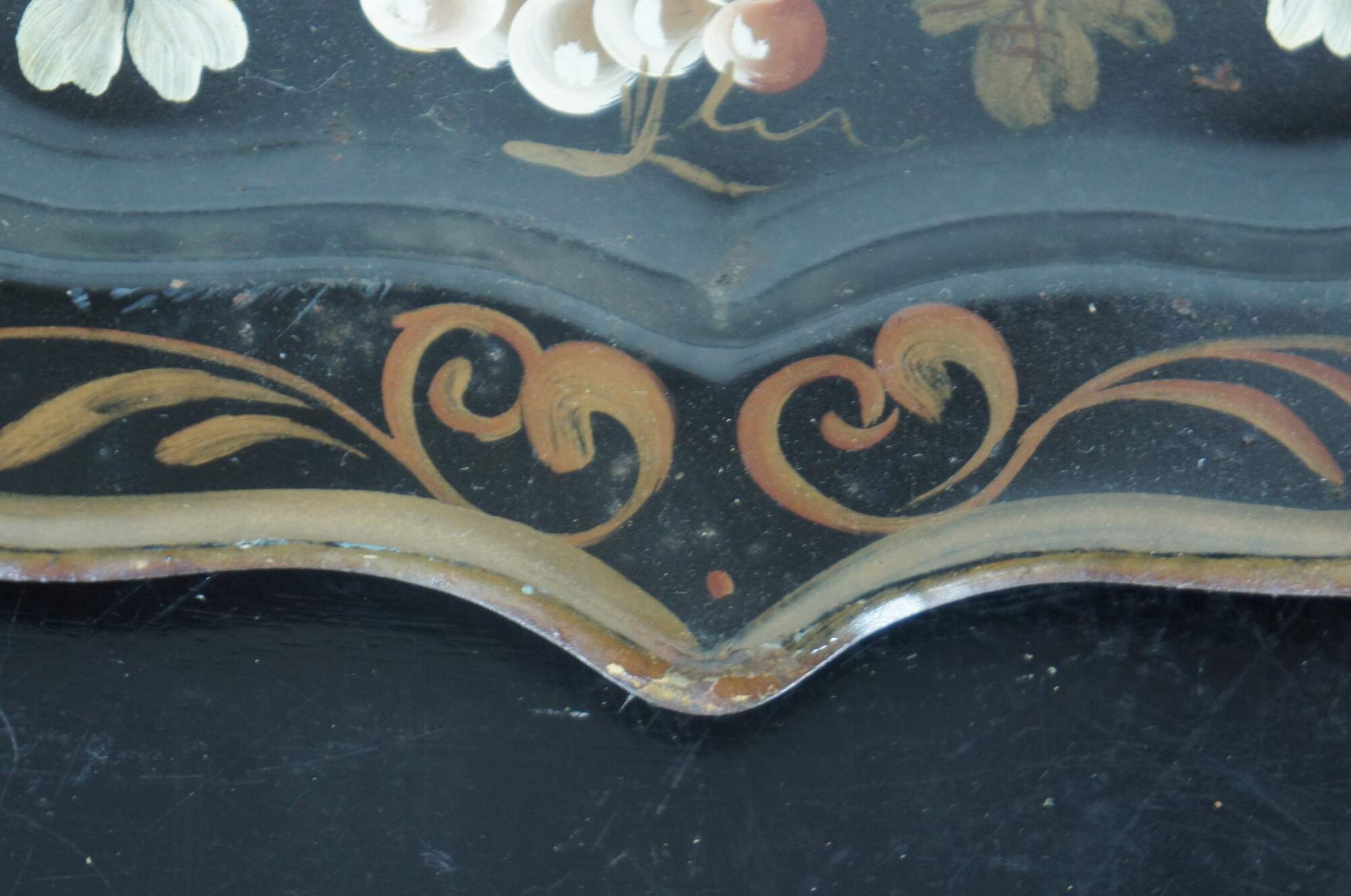 Large antique toleware, painted metal serving tray with scalloped edges bordered in gold, with a design of golden grapes and flowering vines.