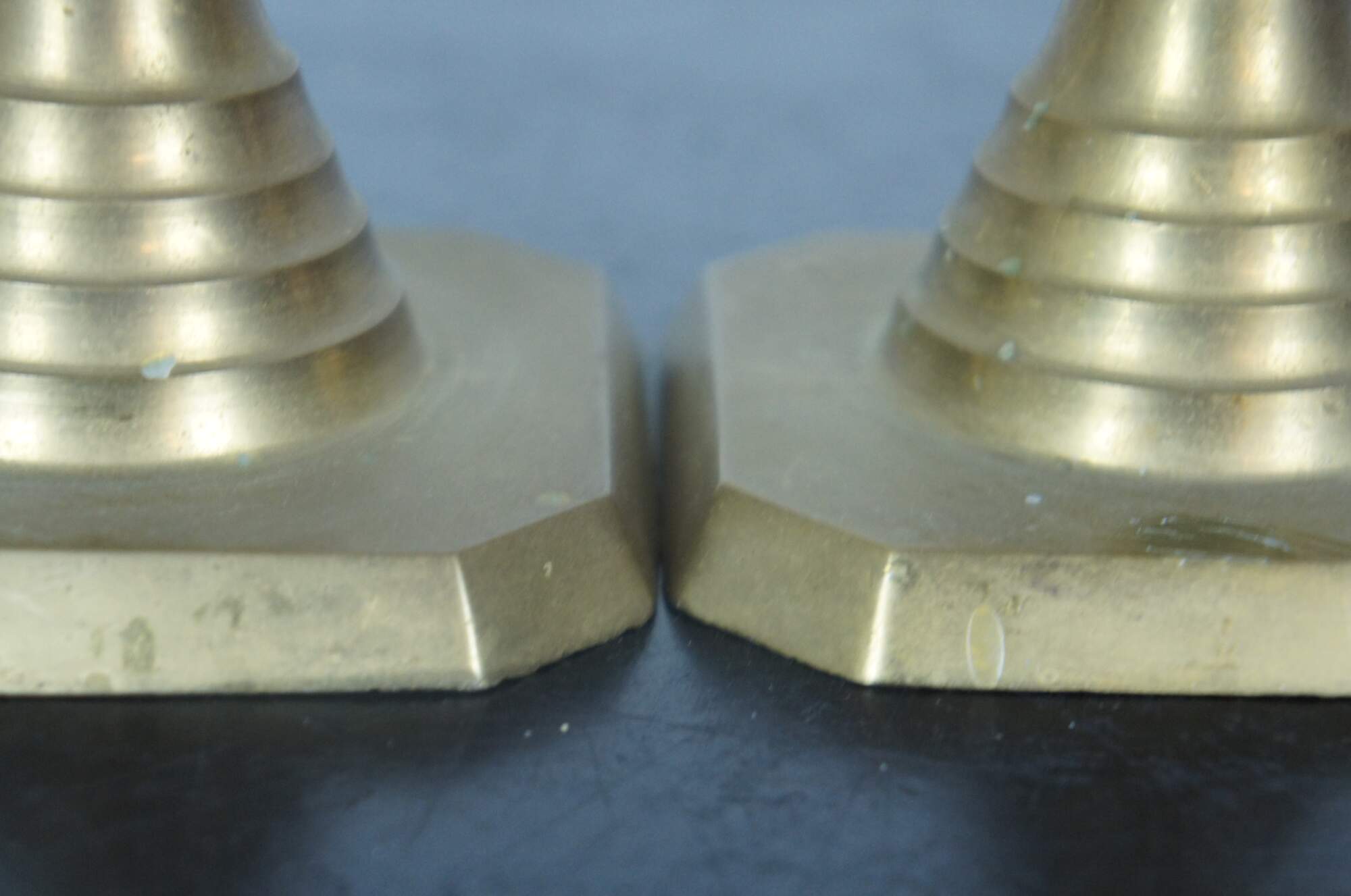 modernist brass candlestick pair with beehive and diamond design by Andrea Sadek. Circa mid 20th century
