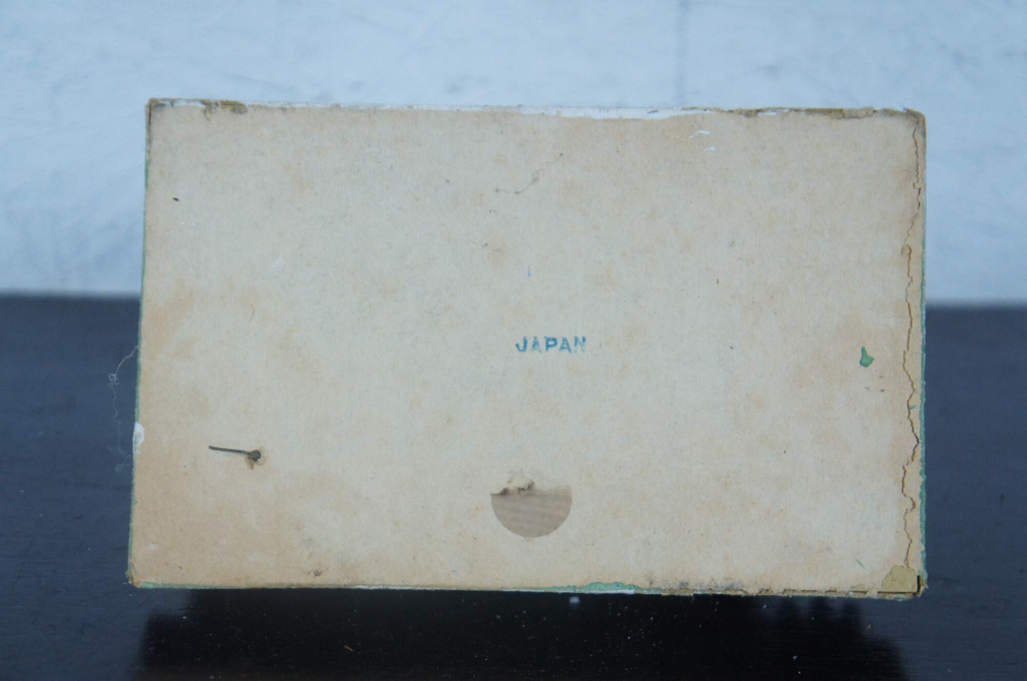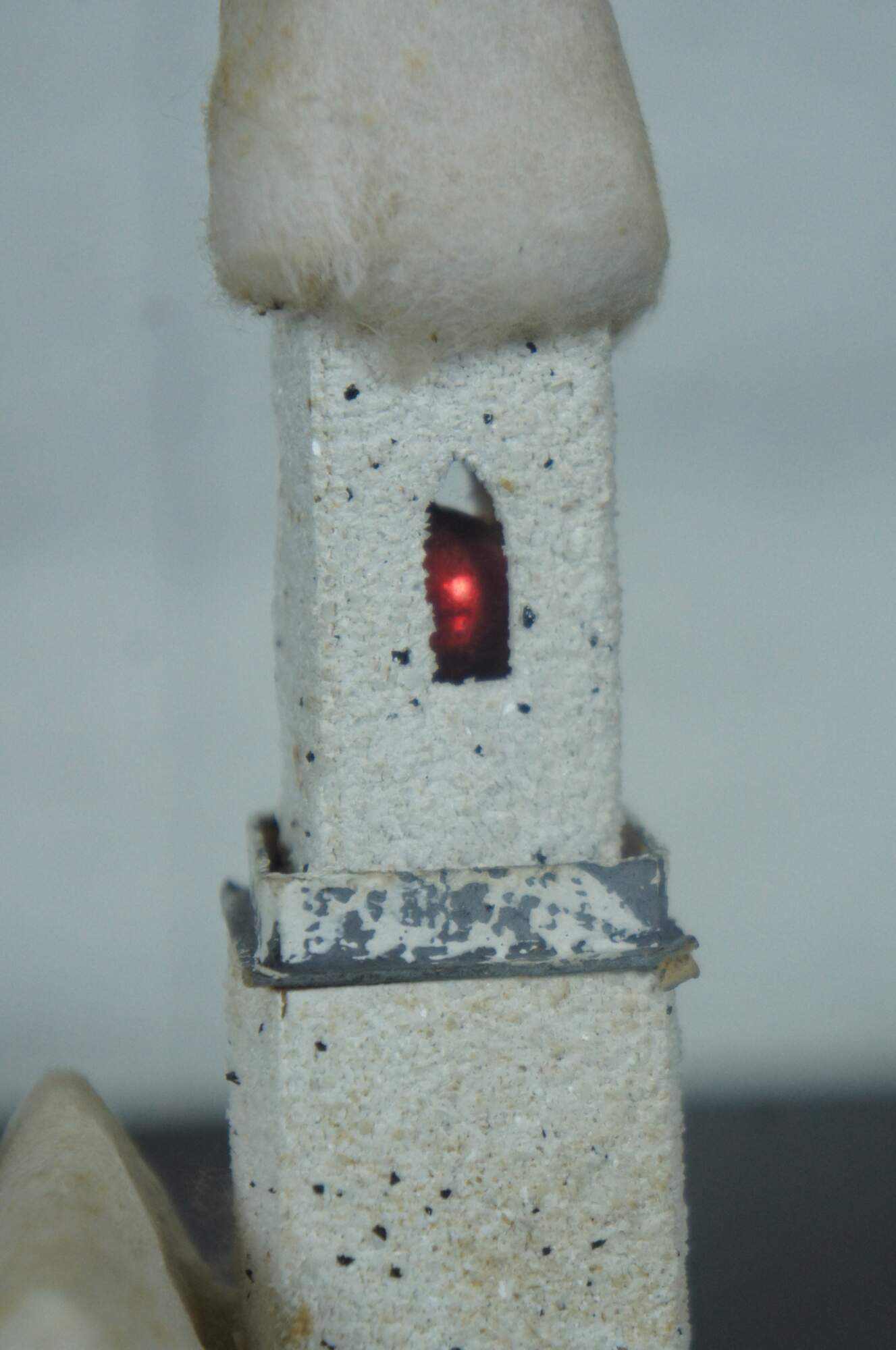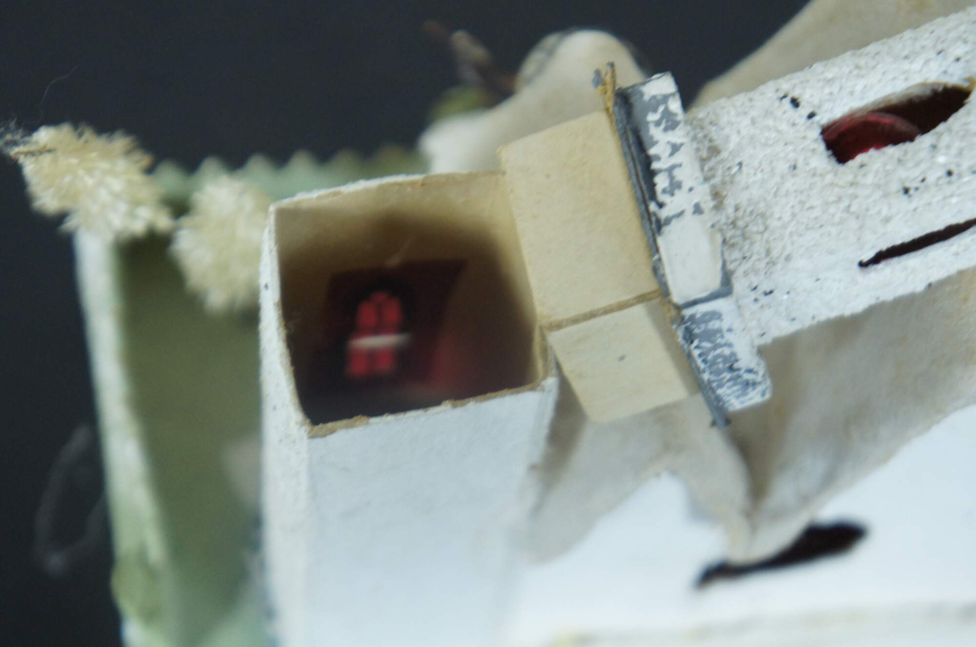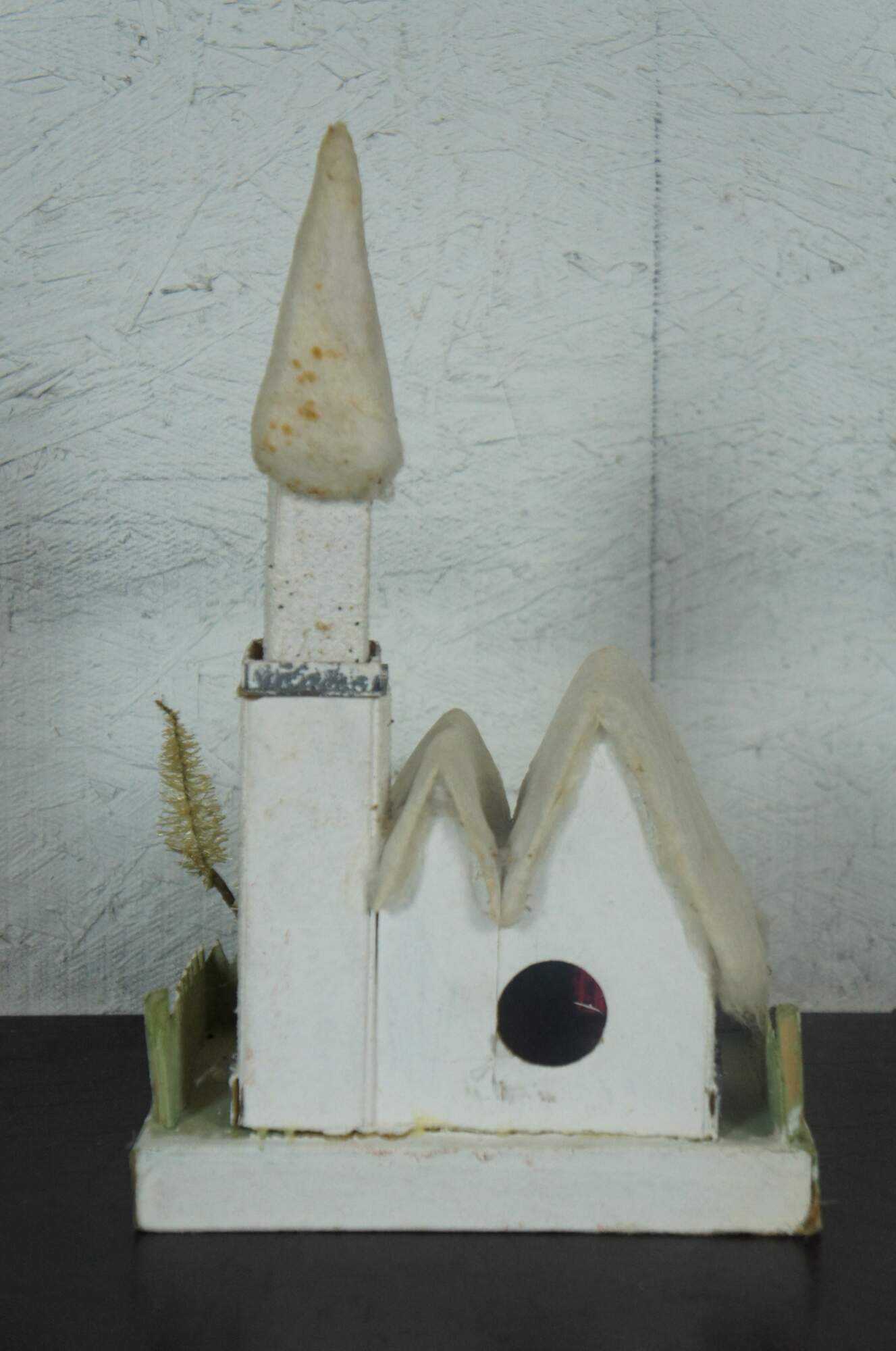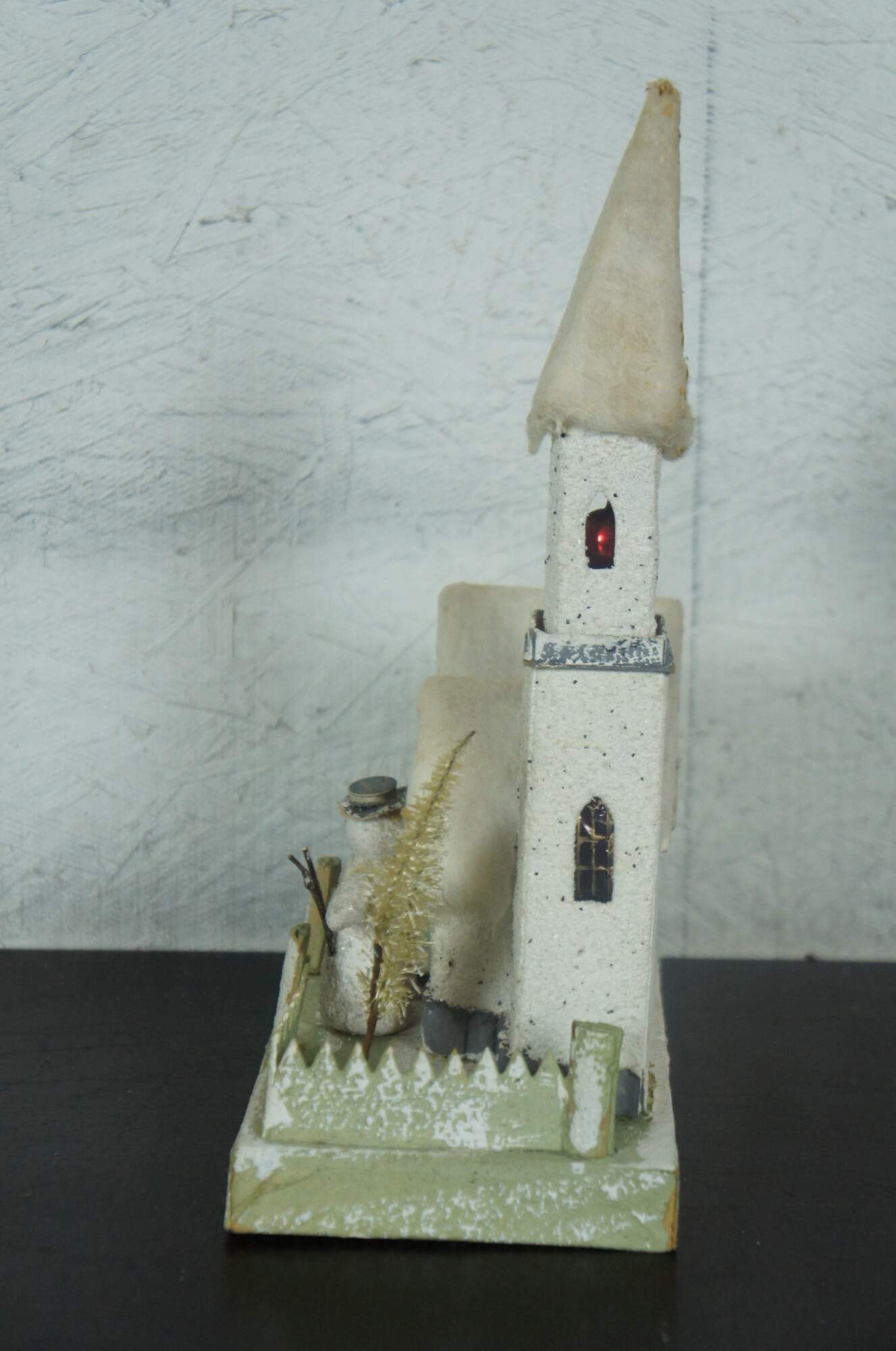 Vintage Putz church building, made of paper mache with mica and cotton batting snow, and a glass ornament bell in the tower, plus a snowman and bottle brush trees in the churchyard.