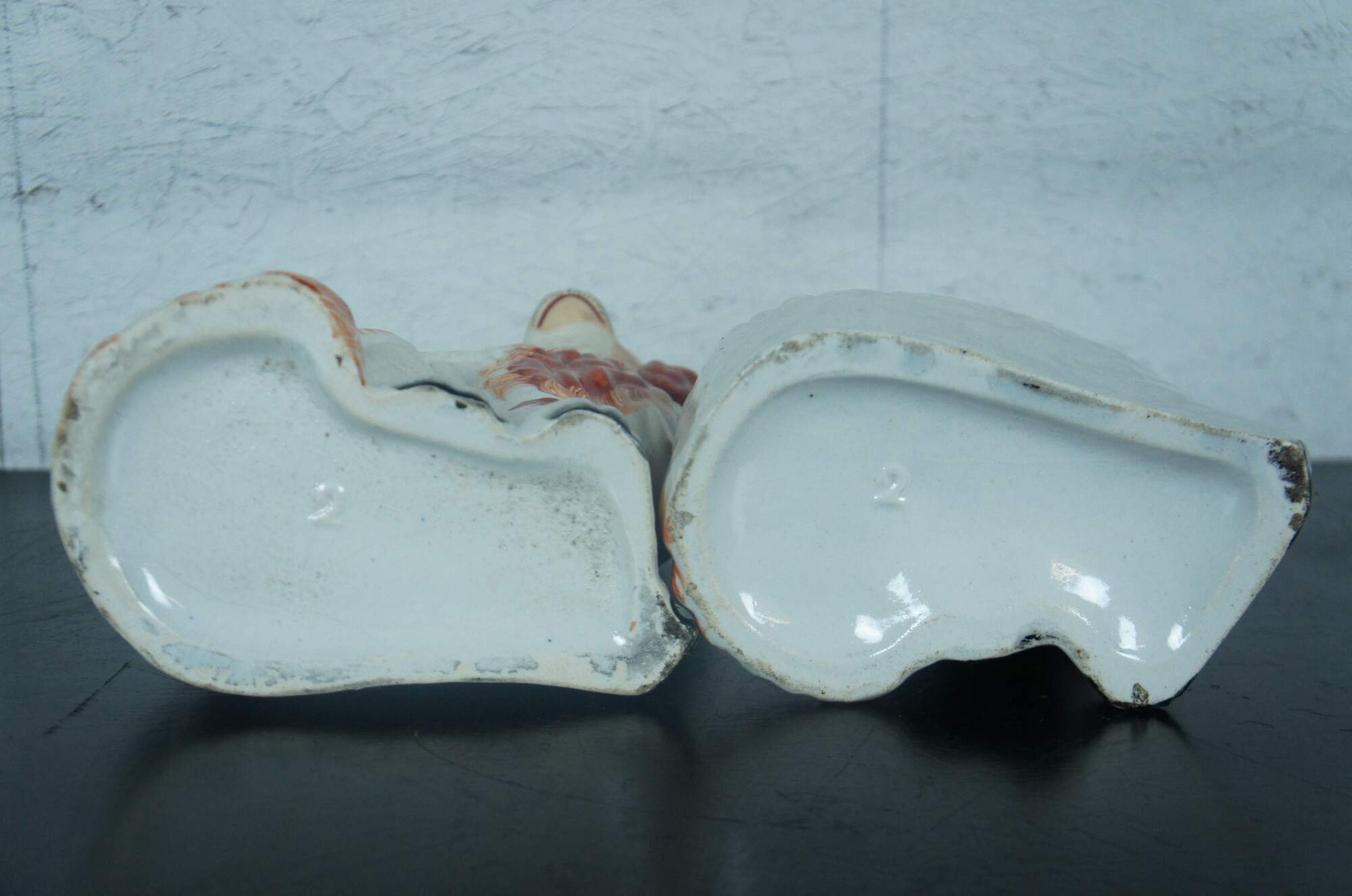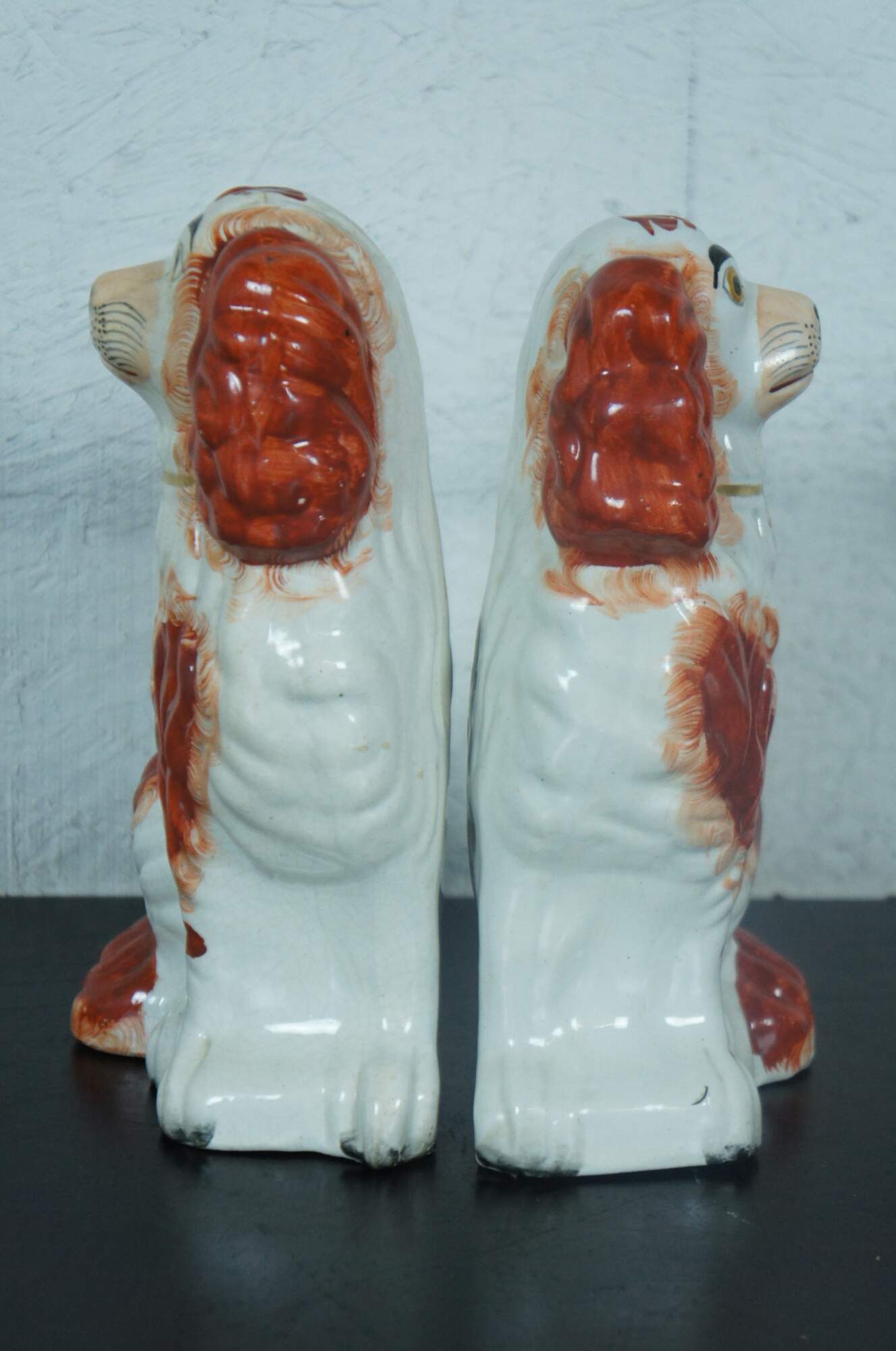 Pair of antique Staffordshire porcelain red and white King Charles Spaniel sculptures with gilded collars and chains. Circa last quarter 19th century, incised with a #2 along the base.