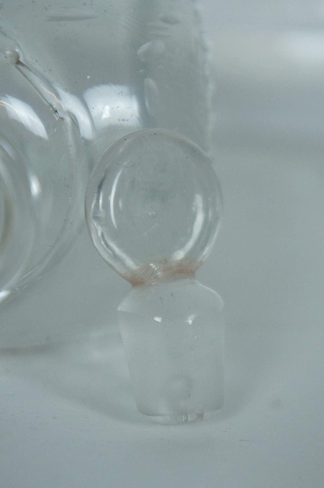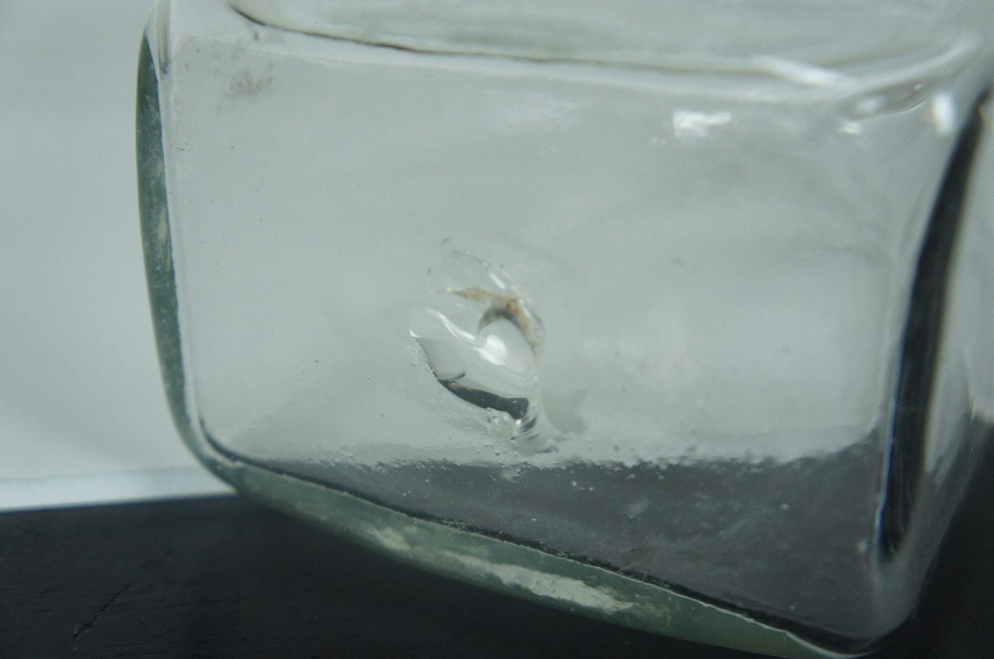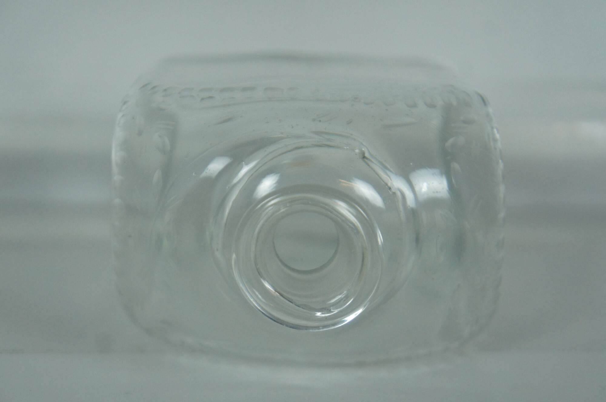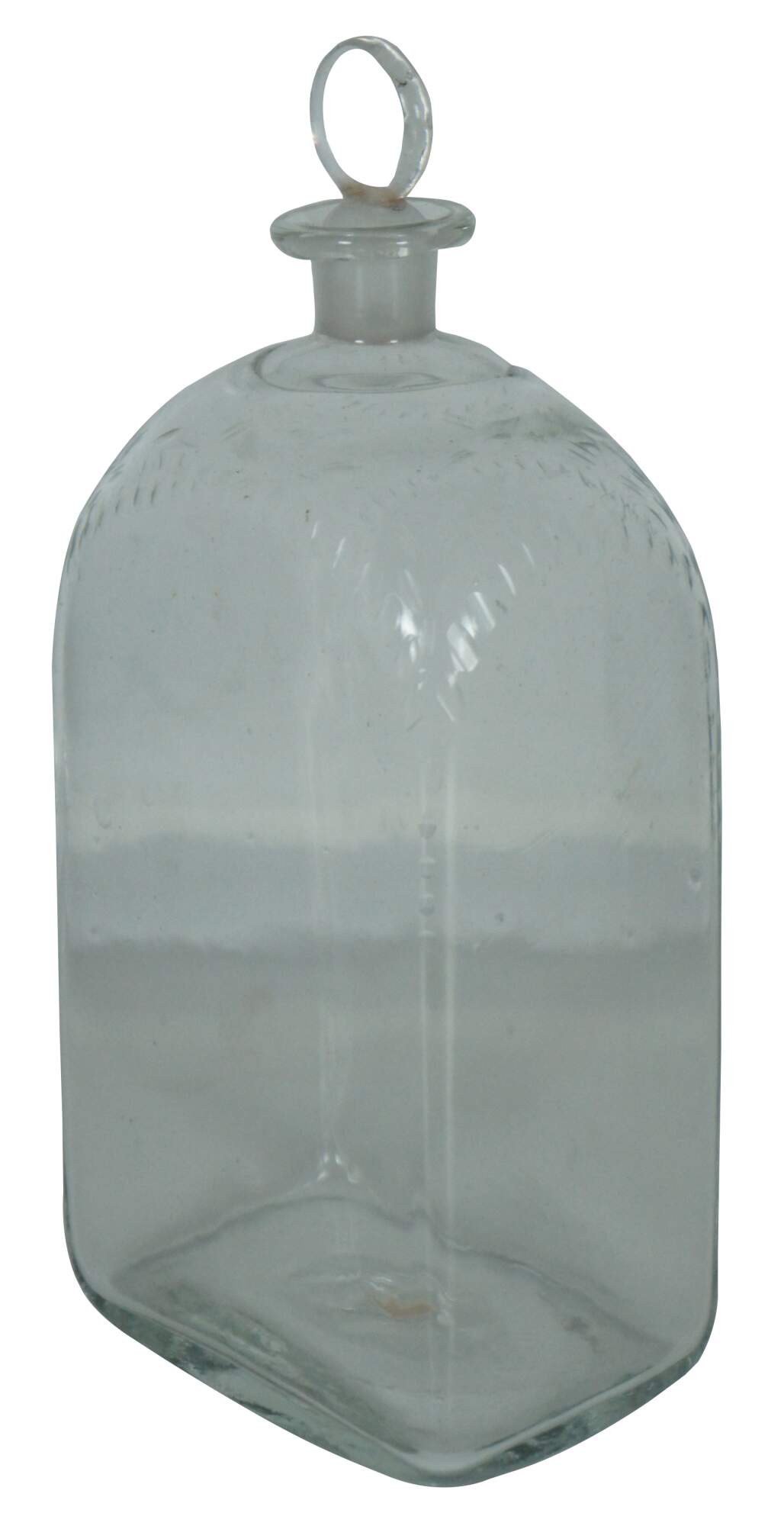 Antique hand blown glass apothecary medicine bottle with rectangular body with a subtle pattern at the upper edges and glass stopper.