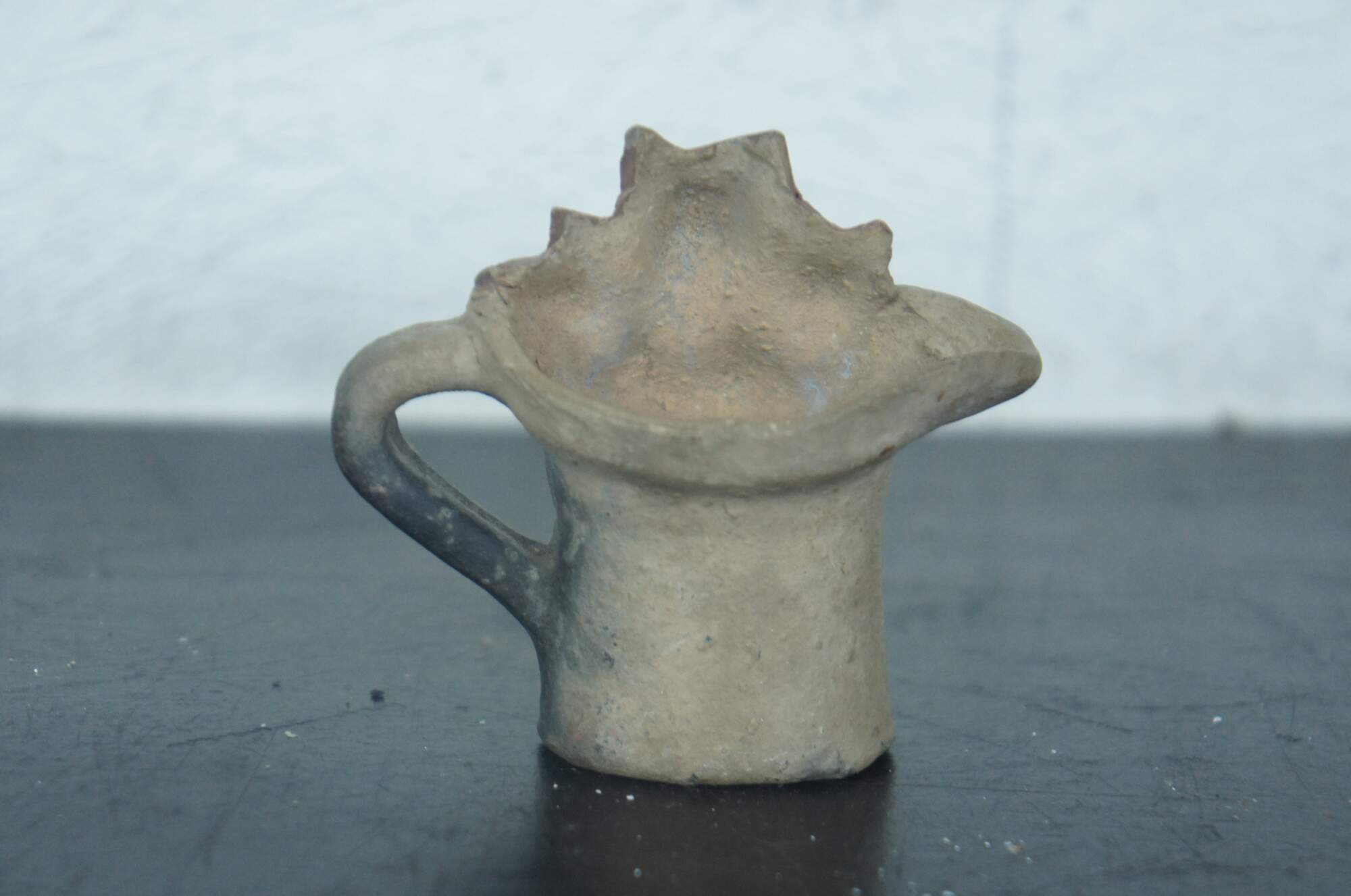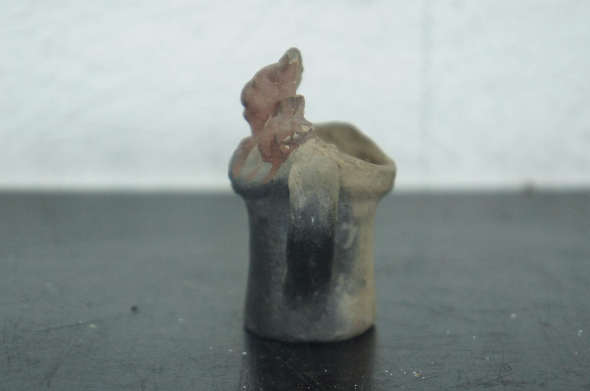 Antique miniature earthenware pottery cream pitcher or toby jug partially painted black with the heads and paws of three russet kittens peeking over the rim.