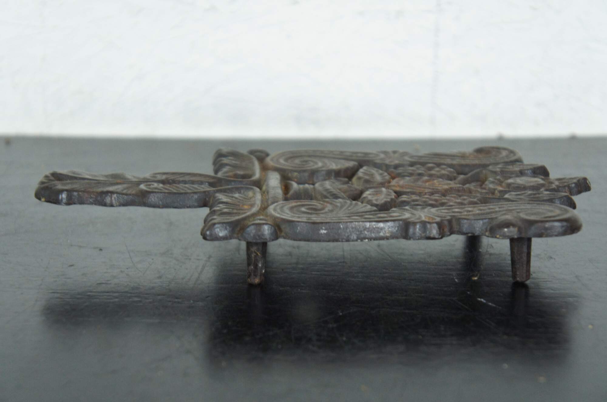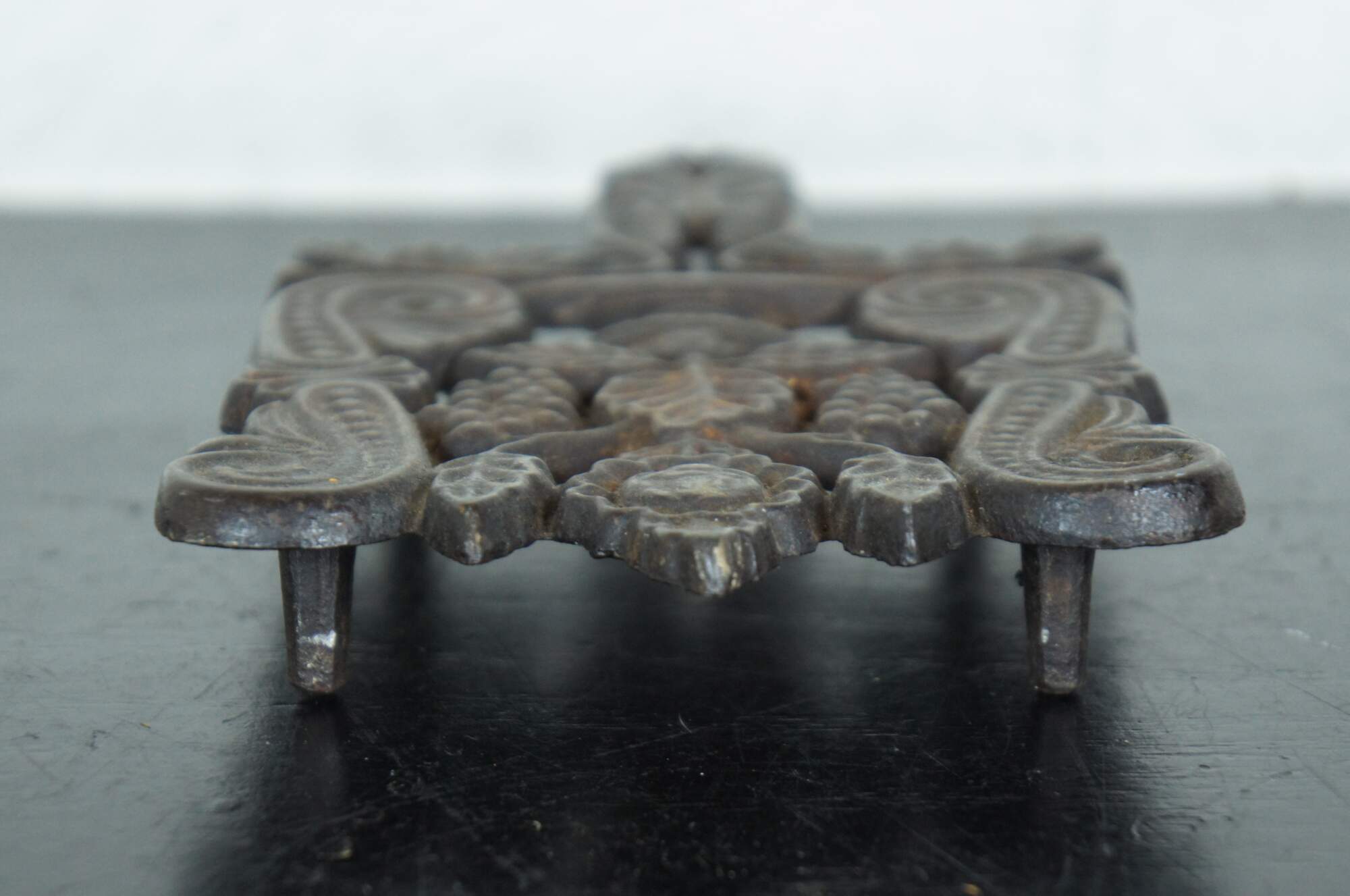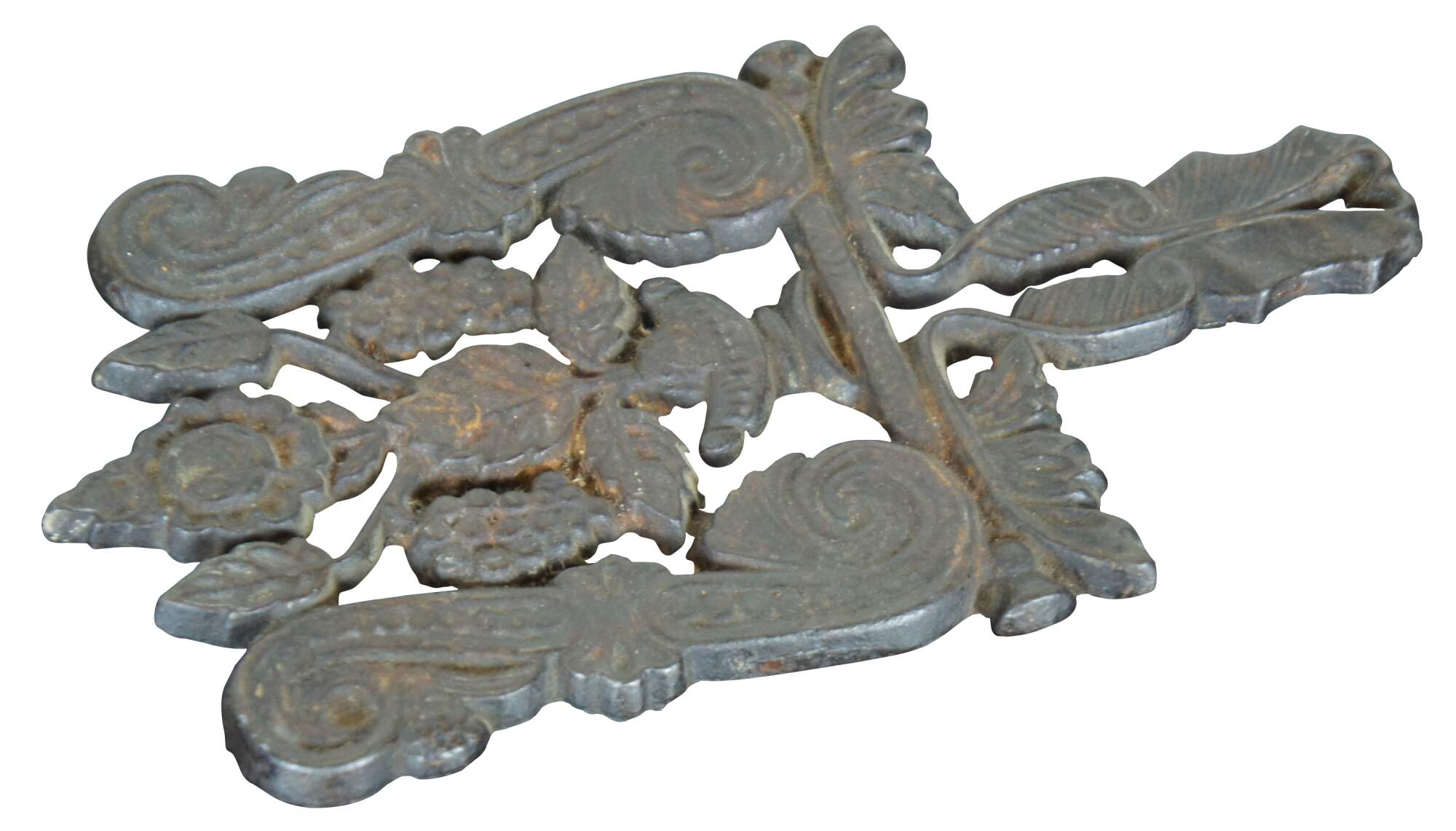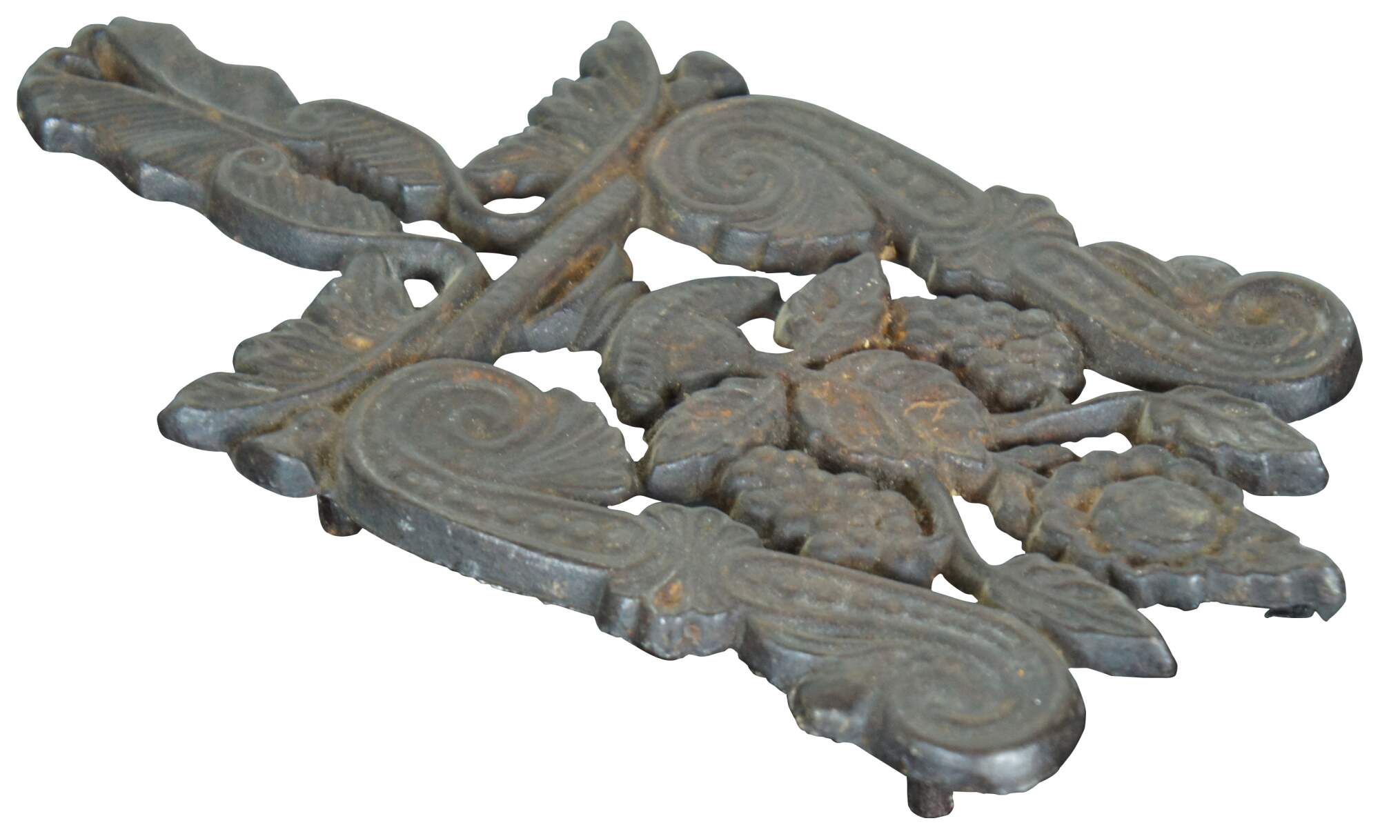 Vintage farmhouse style cast iron trivetfeaturing a design of flowers and grapes framed with beaded scrollwork.