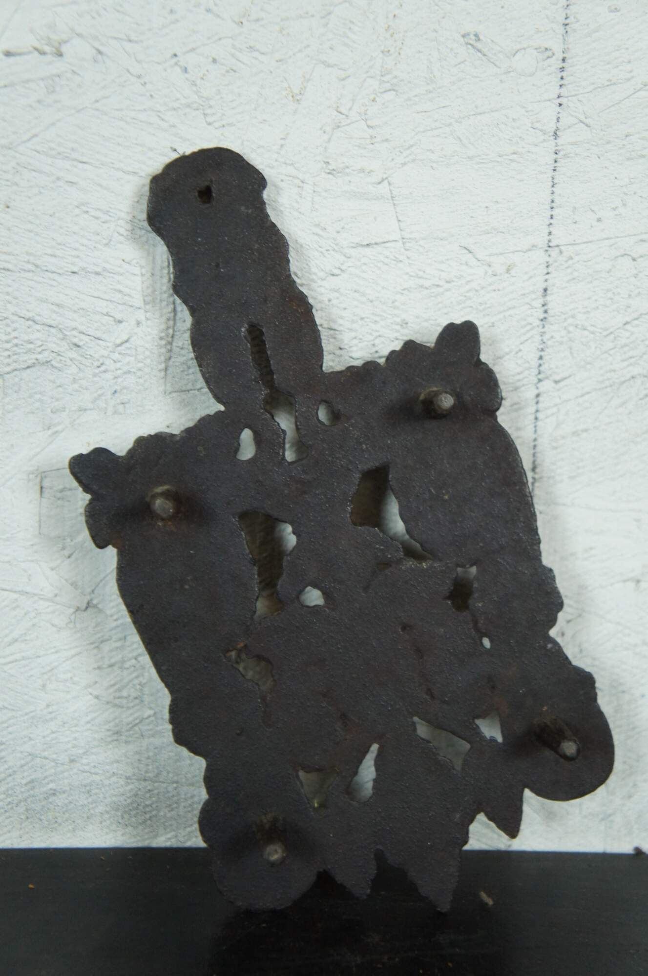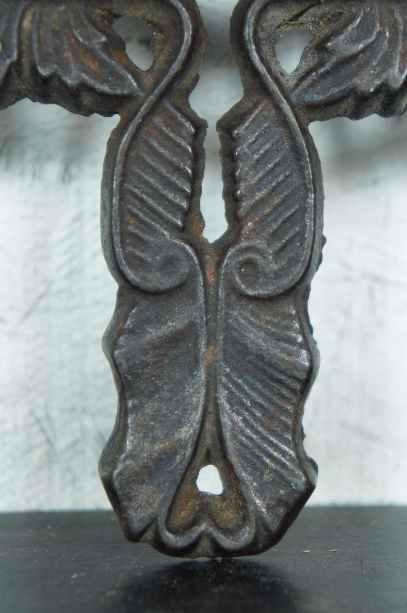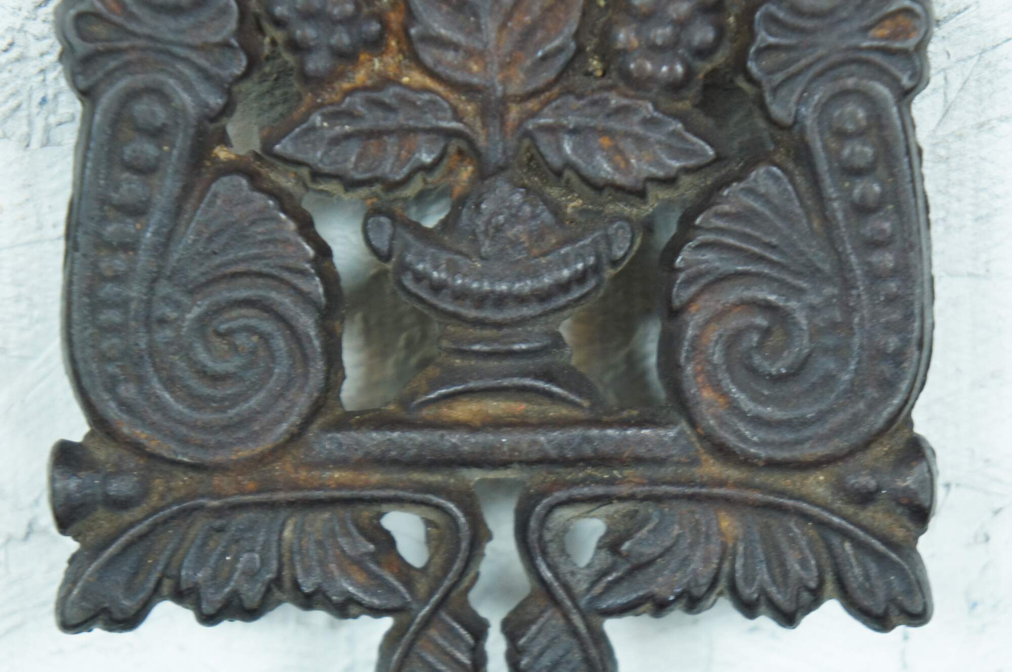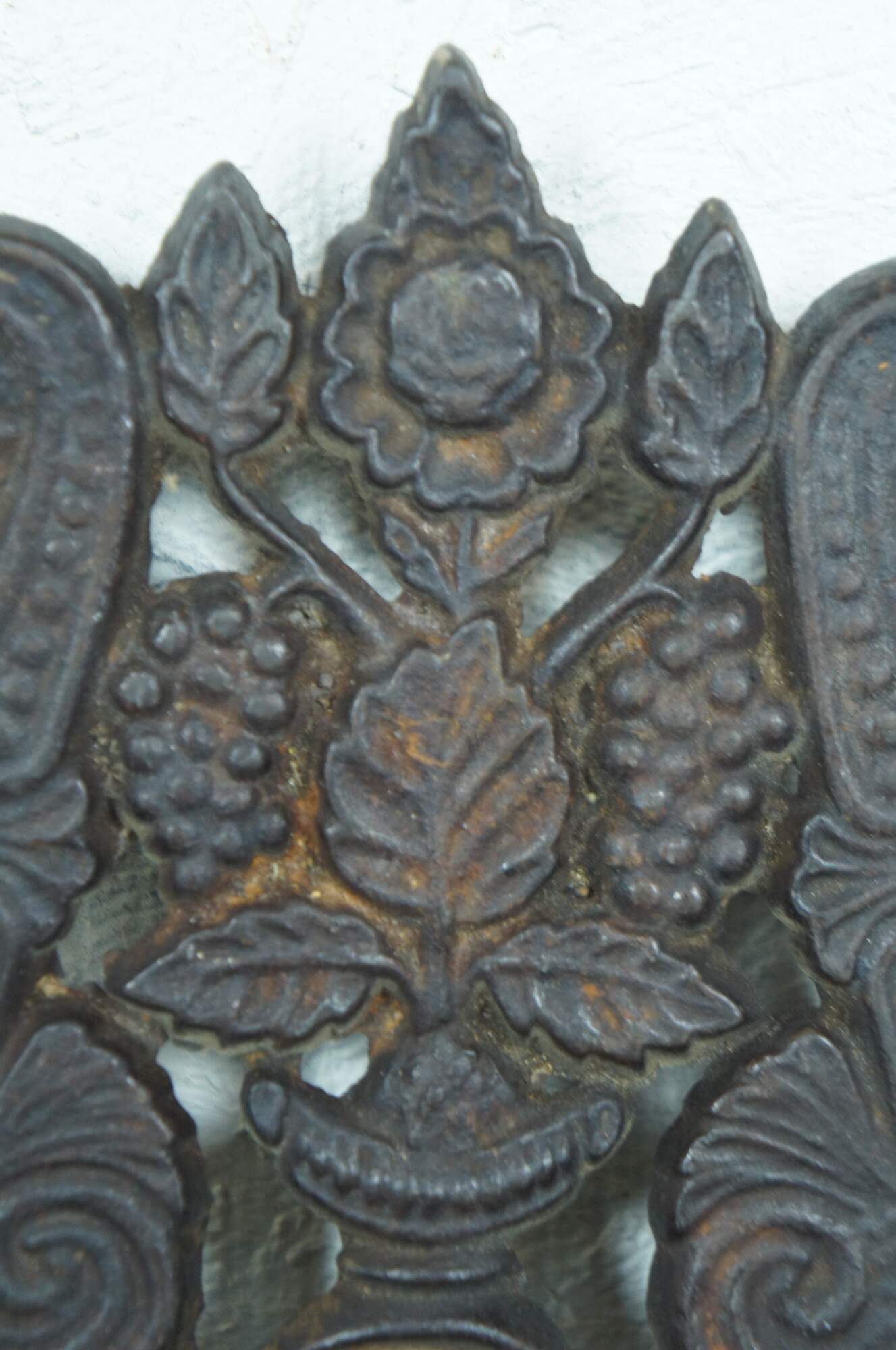 Vintage farmhouse style cast iron trivetfeaturing a design of flowers and grapes framed with beaded scrollwork.