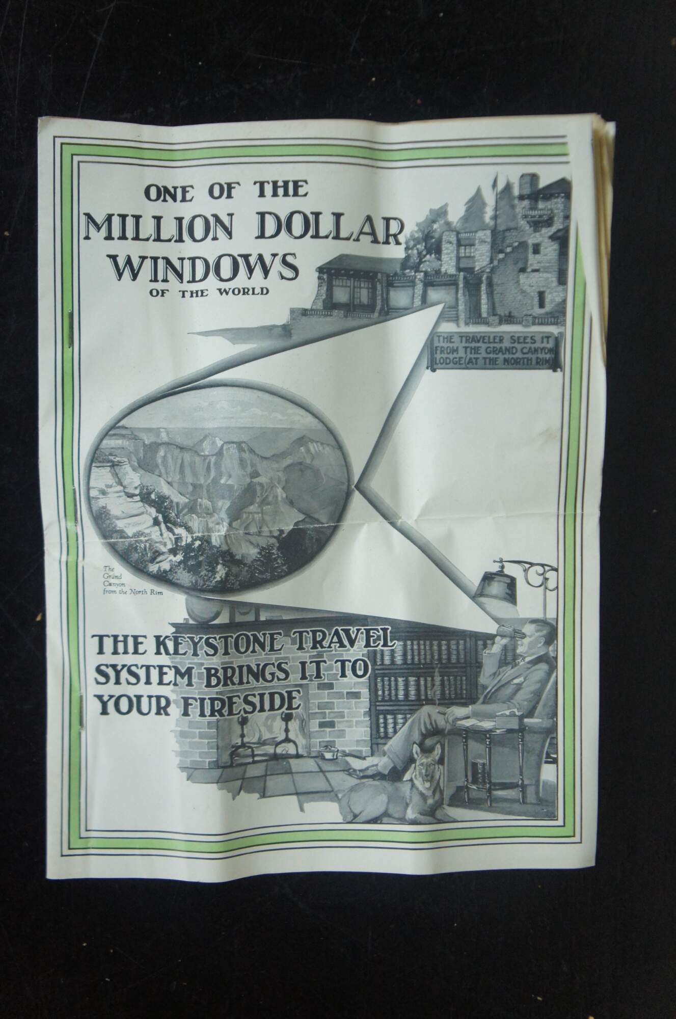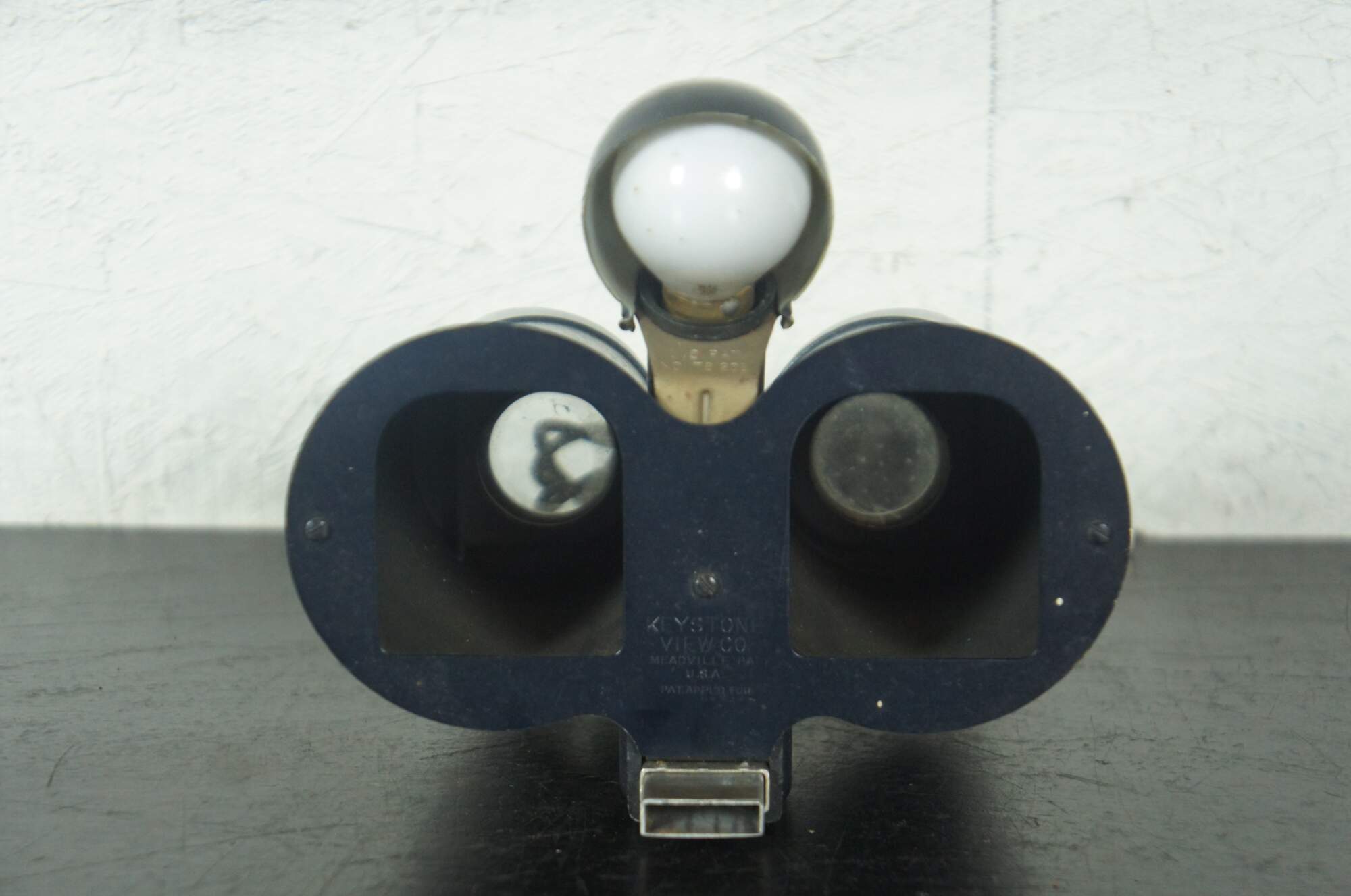 Vintage 1960’s Keystone Stereoscope Viewer with electric light and two Tour of the World Stereographic card sets, Volume I & II and Volume III & IV. Box Vol I & II contains 60 total cards (49 world tour images, 1 card missing an image, 2 diagram cards describing the stereoscopic effect, and 6 additional images cards produced by Jeames H. Young, Cleveland, OH). Box Vol III & IV contains 69 world tour images.