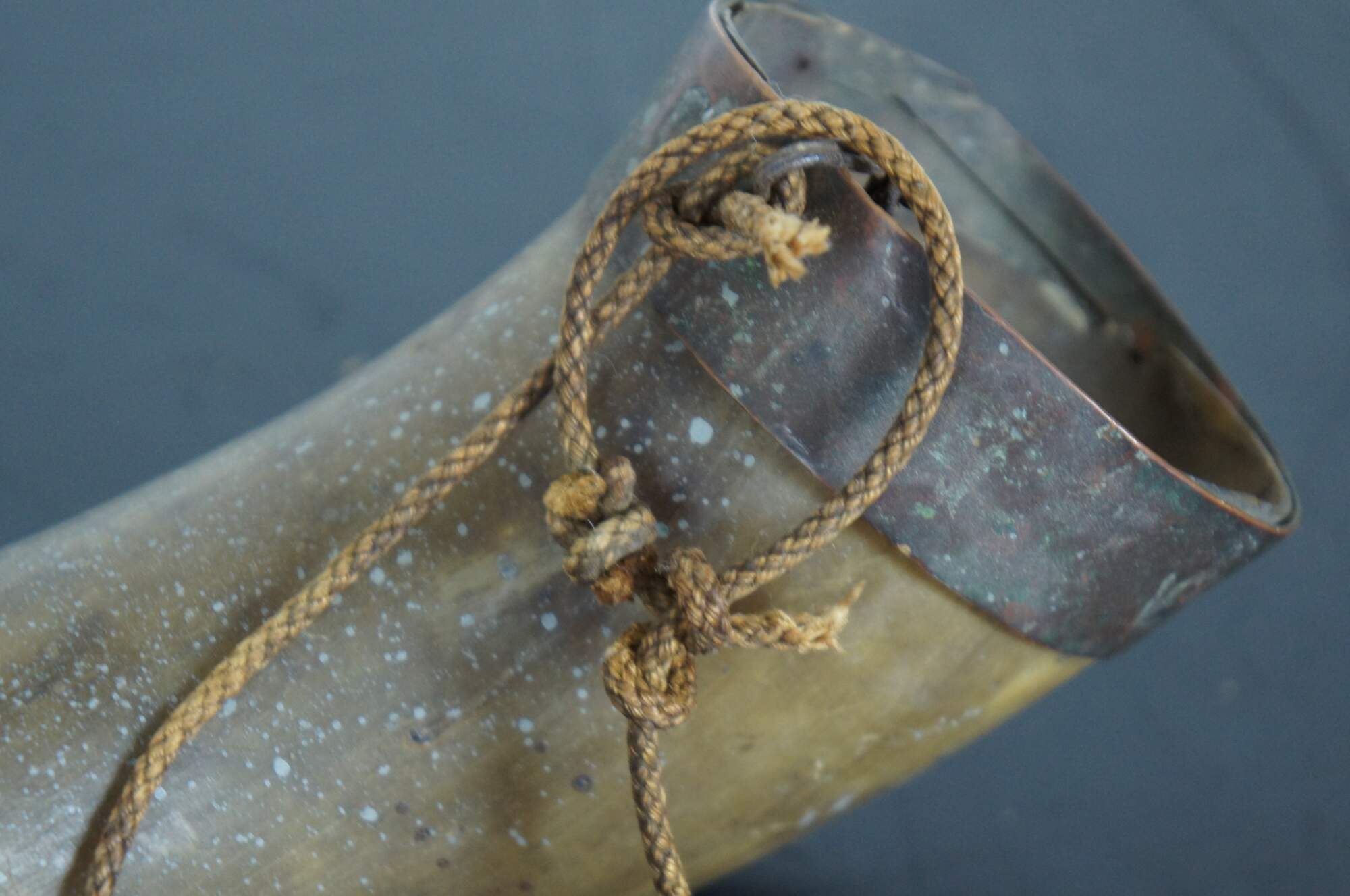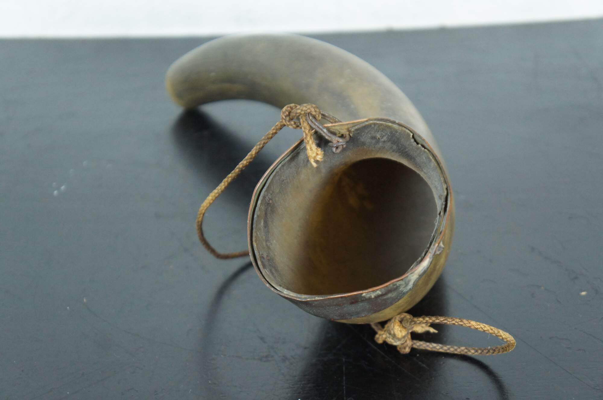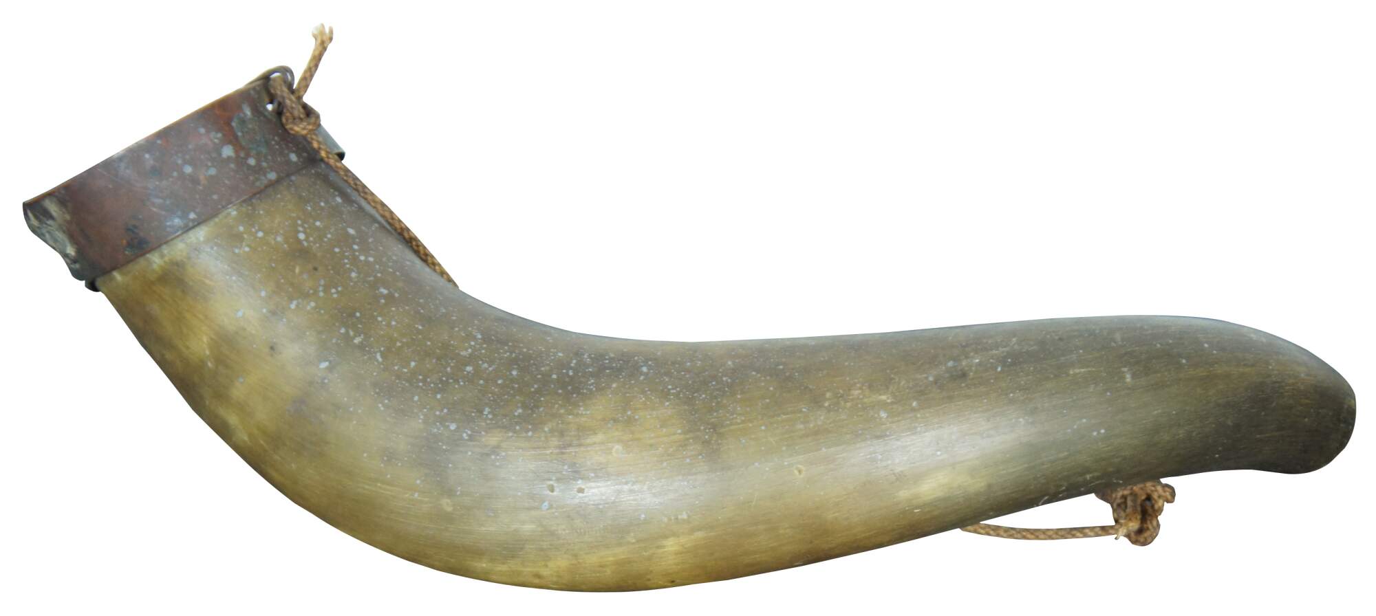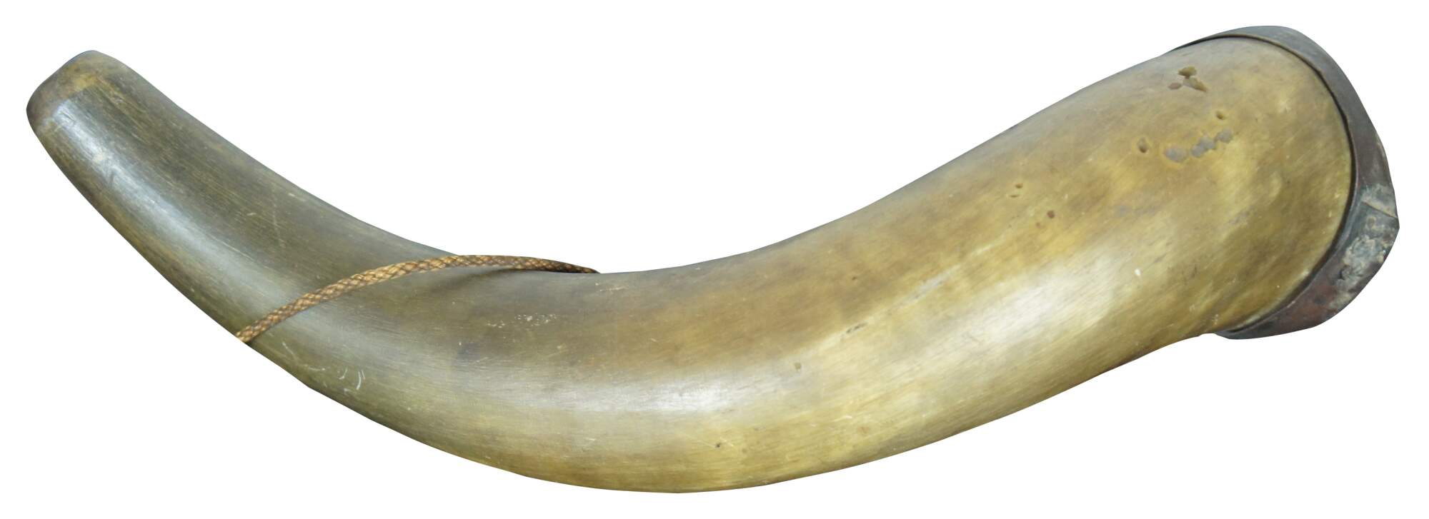 Antique natural horn used for the carrying of black powder. Features a natural curved, slightly spiral shape with a metal band around the larger opening. No stoppers or other hardware.