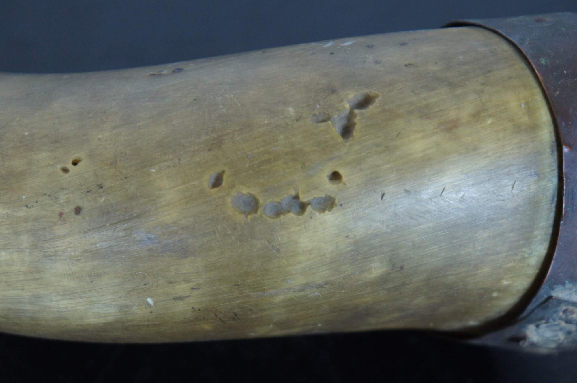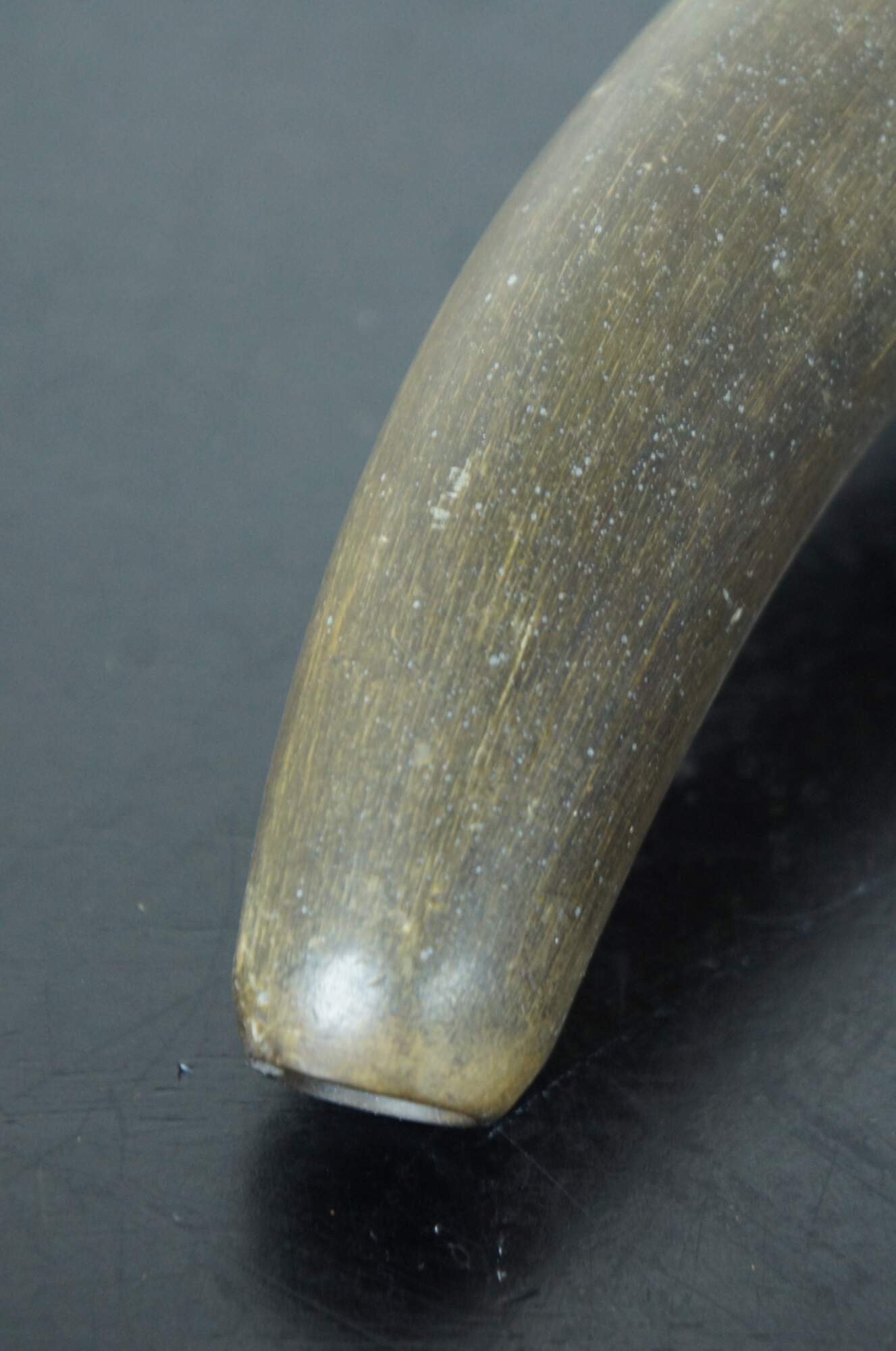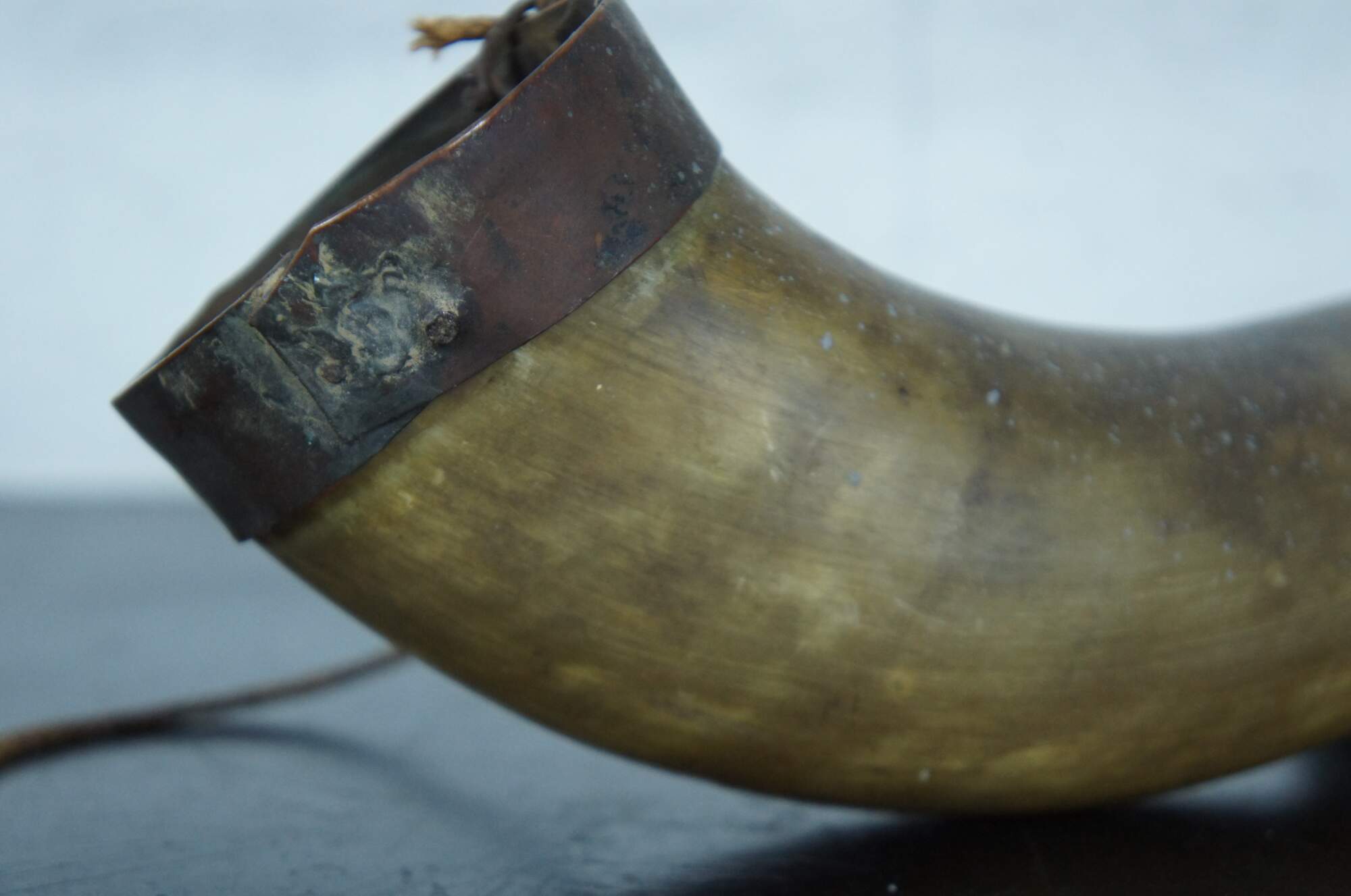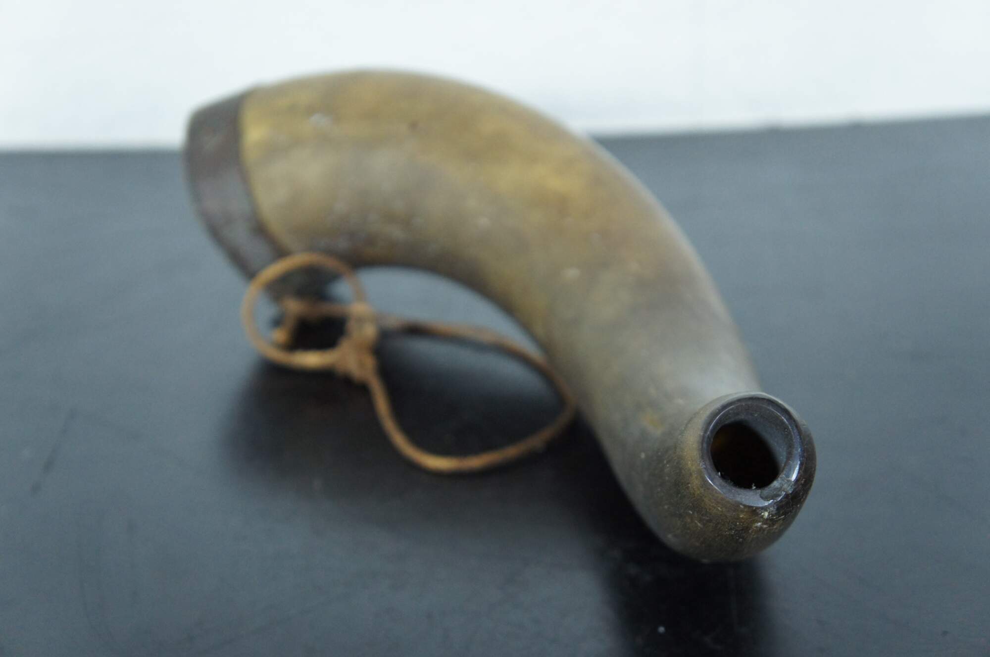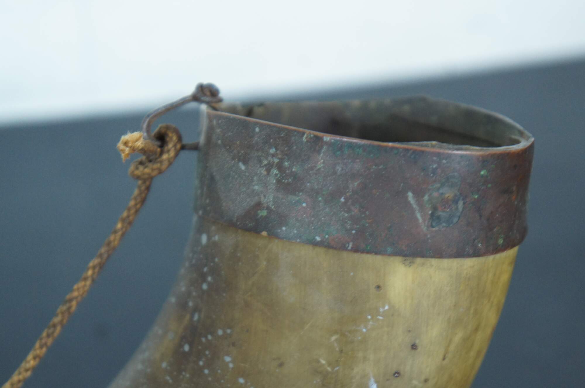 Antique natural horn used for the carrying of black powder. Features a natural curved, slightly spiral shape with a metal band around the larger opening. No stoppers or other hardware.
